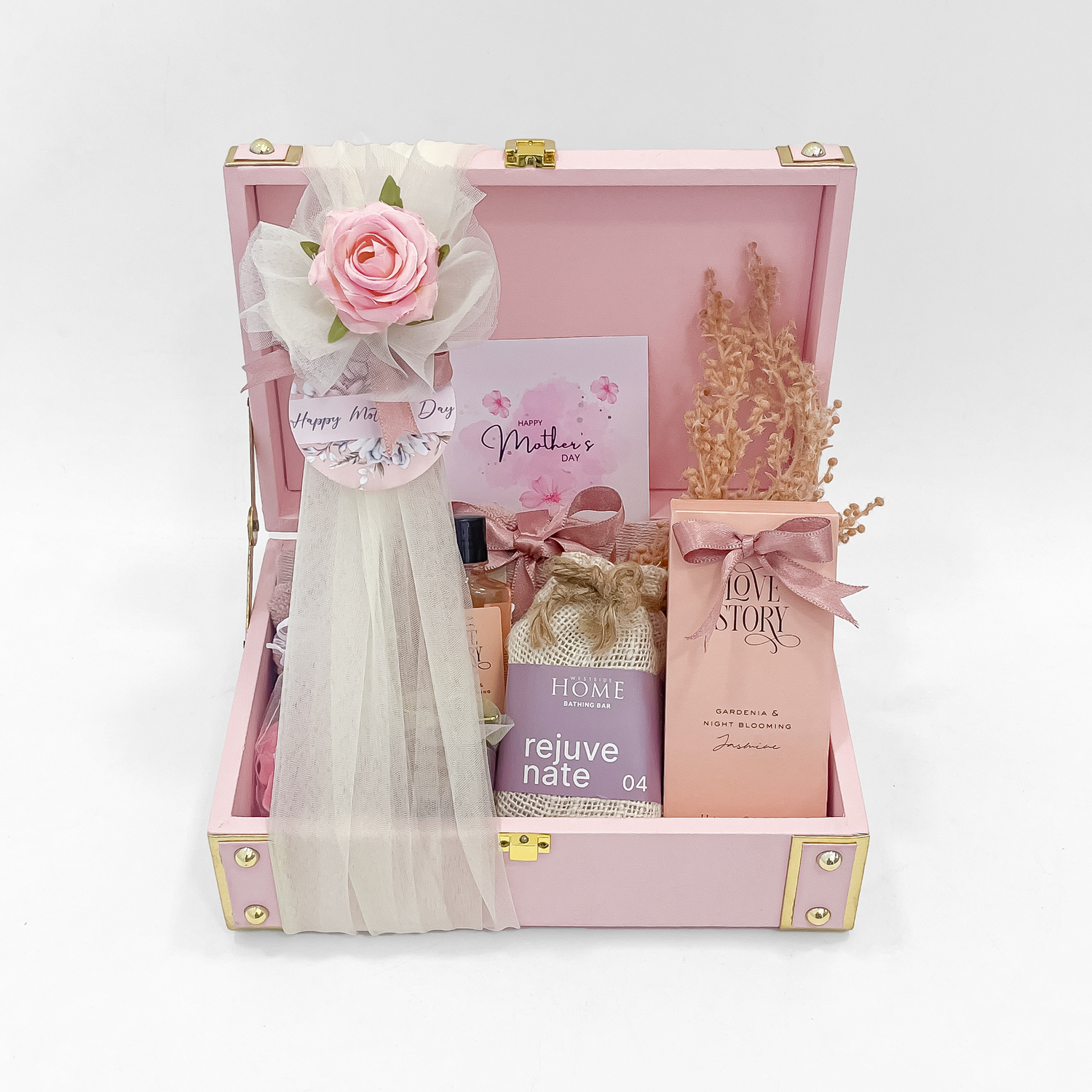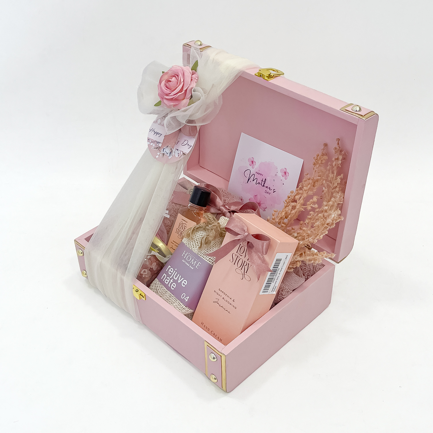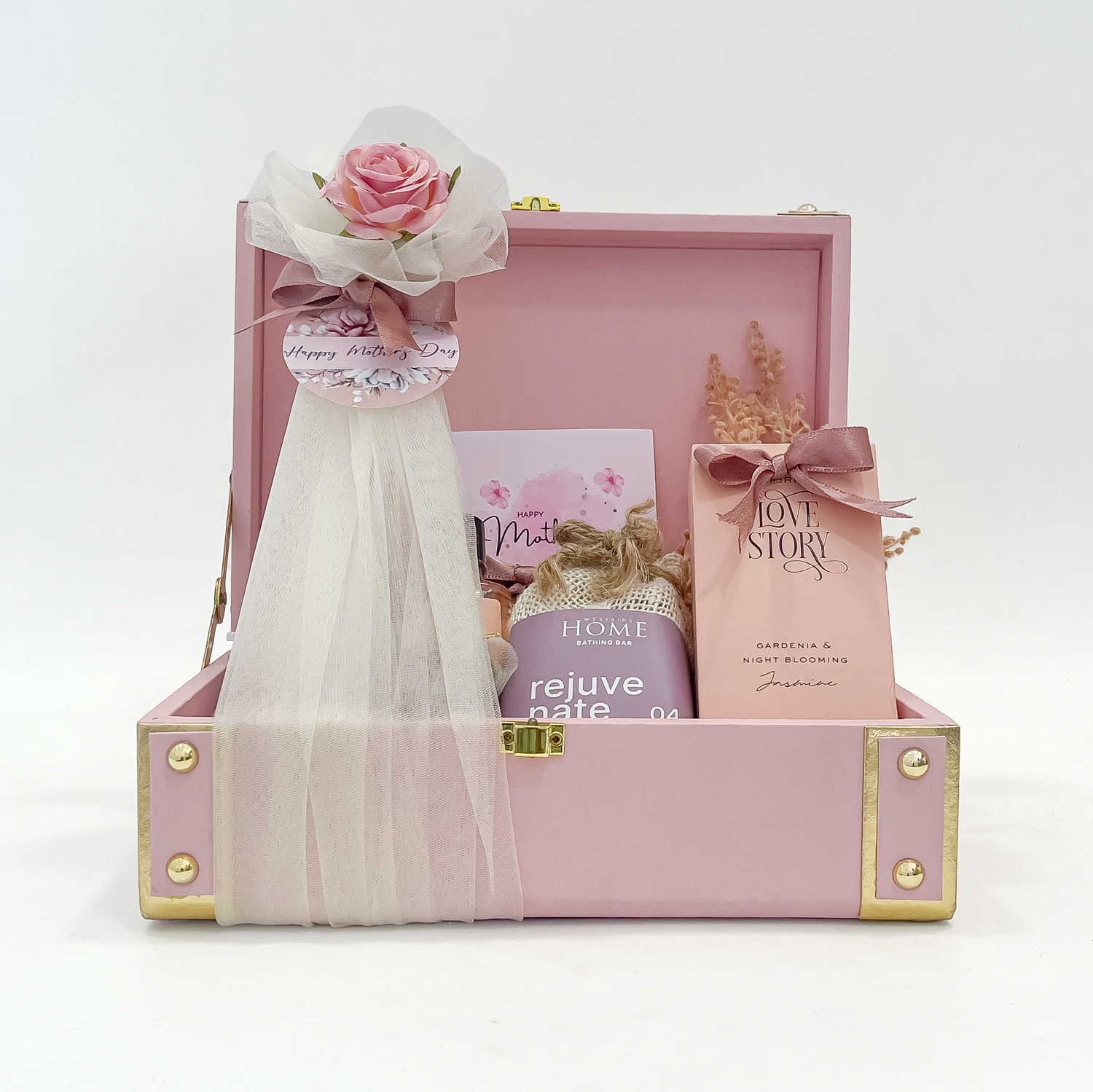 Delight your mother with the perfect blend of luxury and care through our Mother’s Day Gift Box. Expertly curated, this hamper features premium face towels, a rich and hydrating hand cream, rejuvenate soap for a refreshing cleanse, a soothing bath salt bottle, and a gentle body wash for everyday indulgence. Enhancing the experience are a rose-scented candle neatly packed in a pouch, classy coasters, a beautiful decorative stem, and a vibrant flower, all thoughtfully arranged in an elegant suitcase.