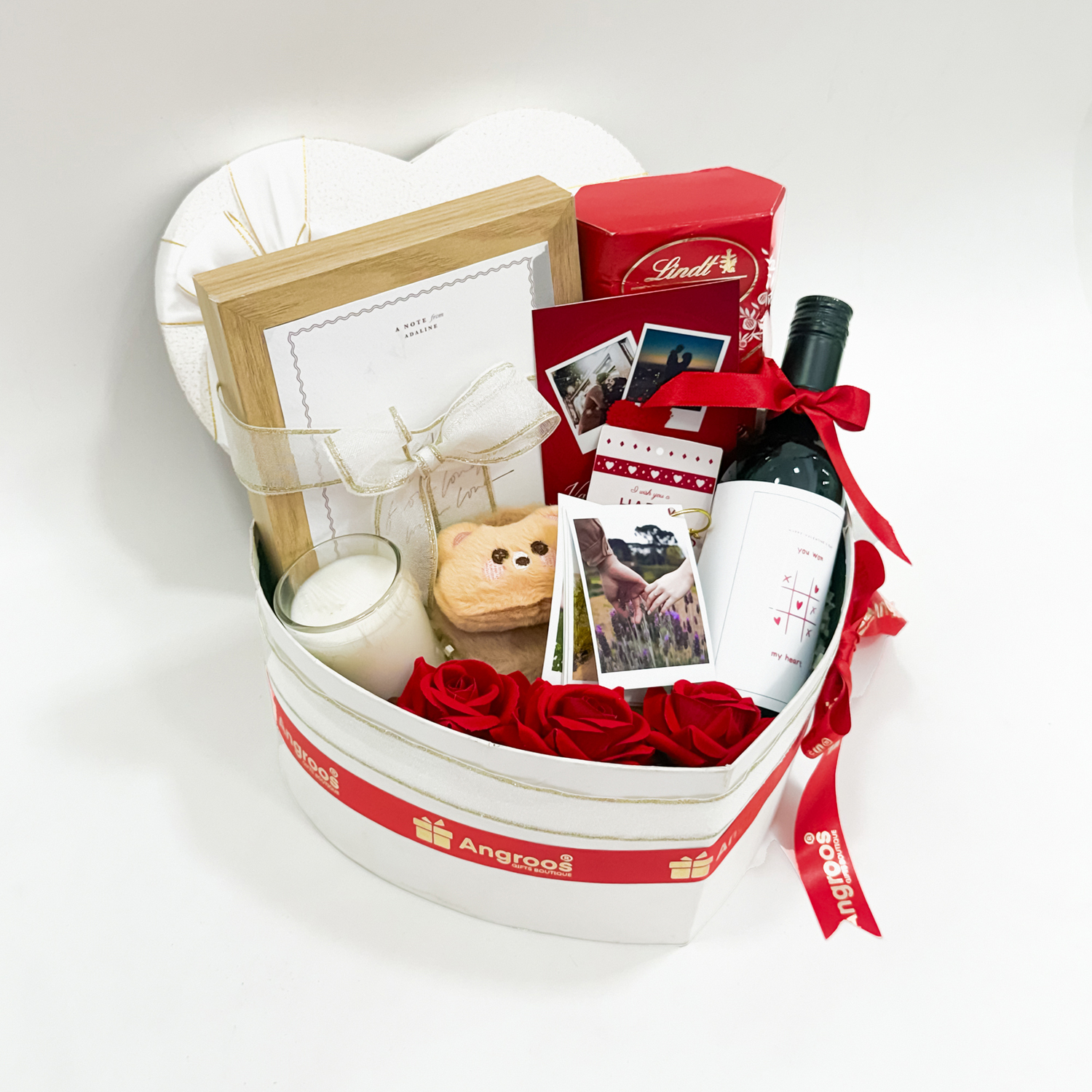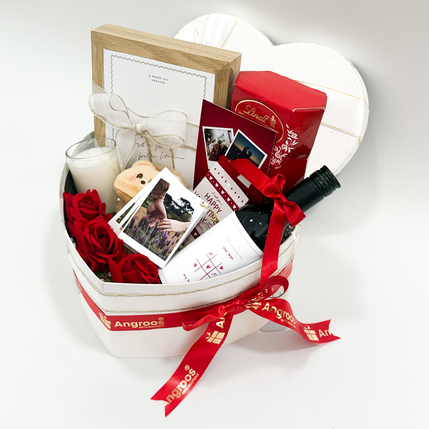 This valentines heart gift hamper is designed to combine memories with sweet gifting. The hamper includes a white heart-shaped box filled with Lindt chocolates, a mini wine bottle, a white candle, a pocket mirror, and a wooden photo frame. Polaroid-style photo prints add a personal touch, while decorative elements enhance the overall presentation. All items are neatly arranged to create a balanced and thoughtful Valentine’s Day gift, suitable for couples who value both keepsakes and chocolates in one elegant hamper.