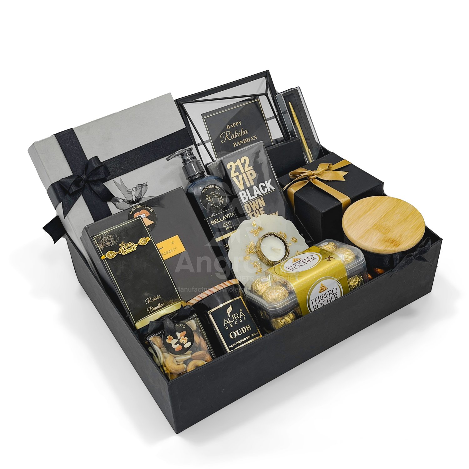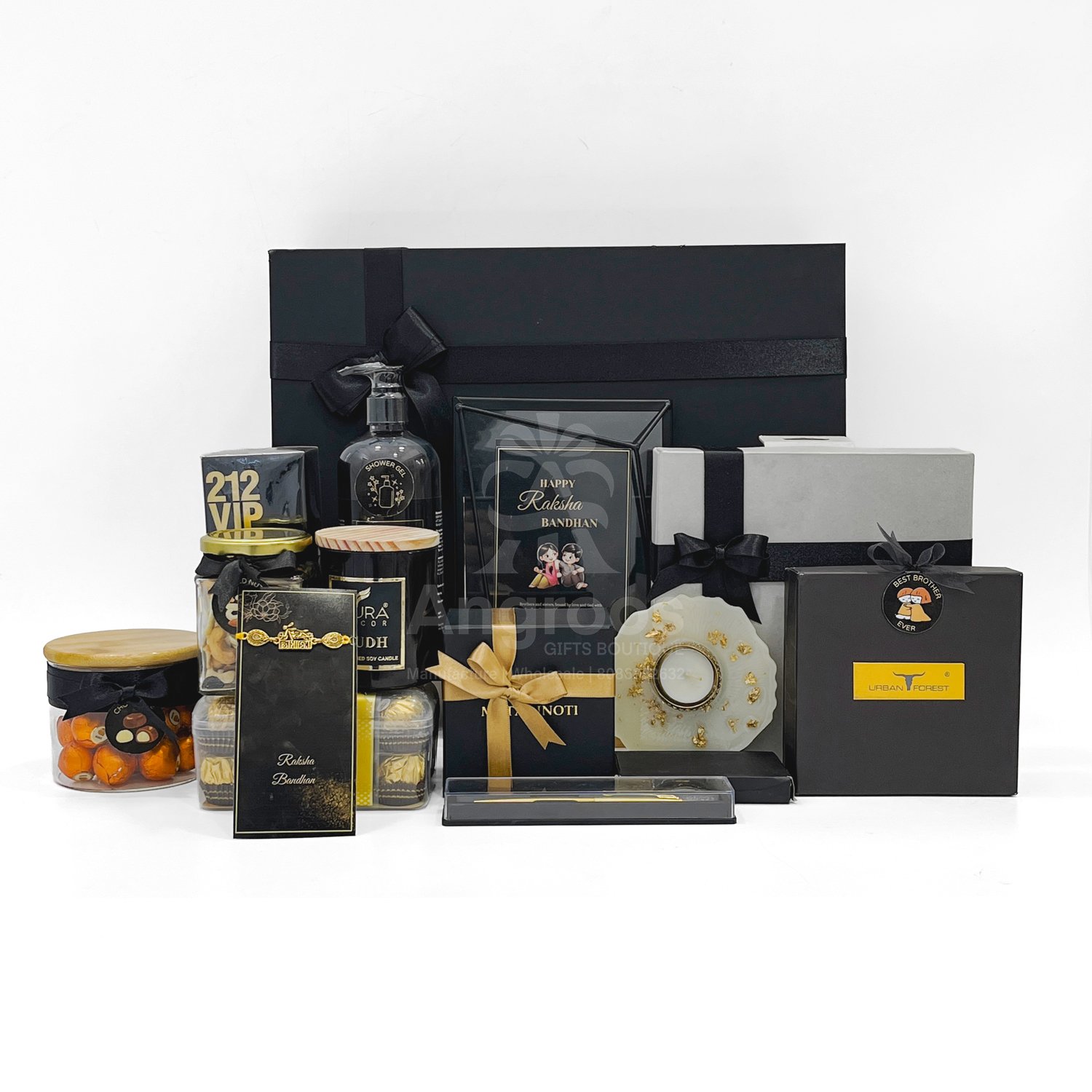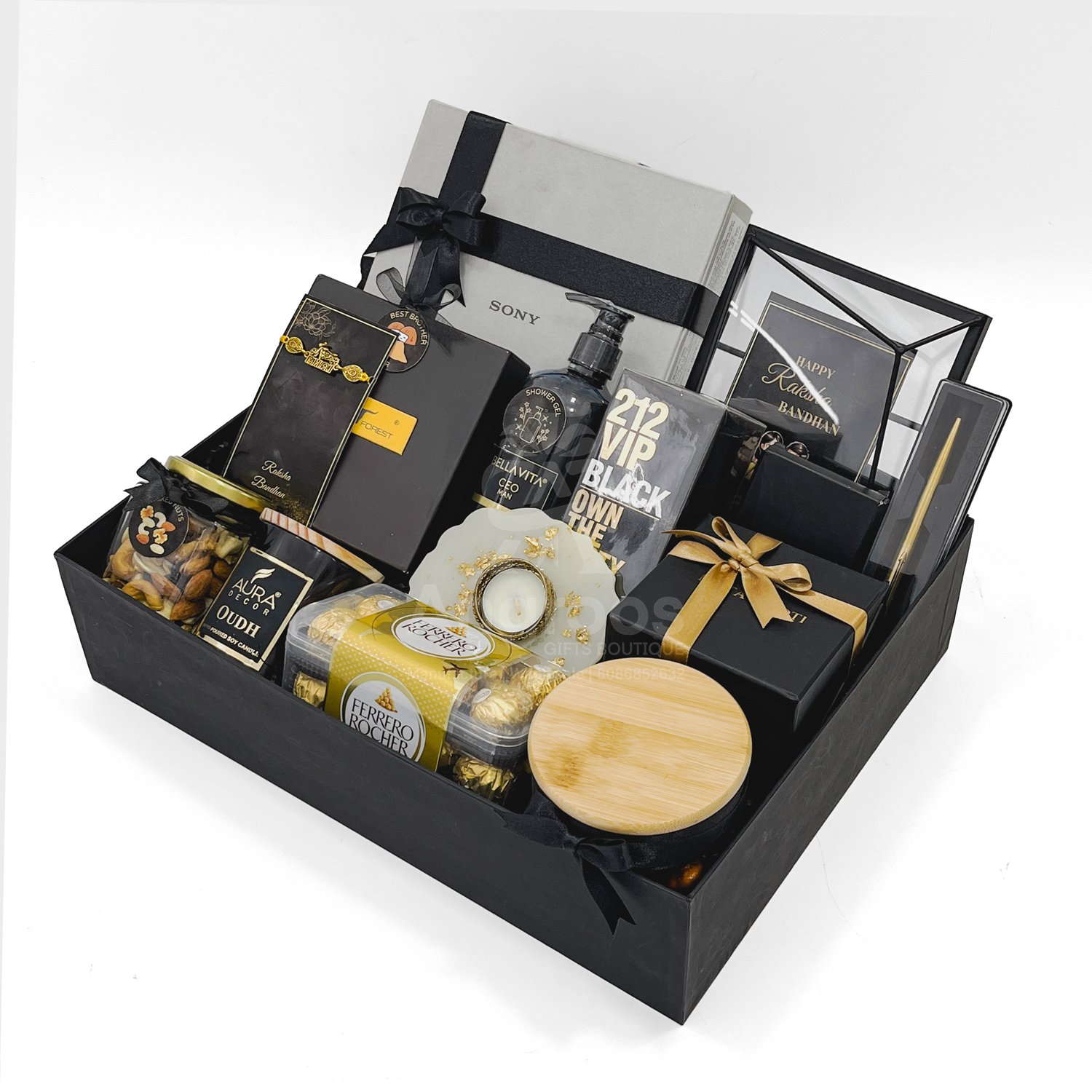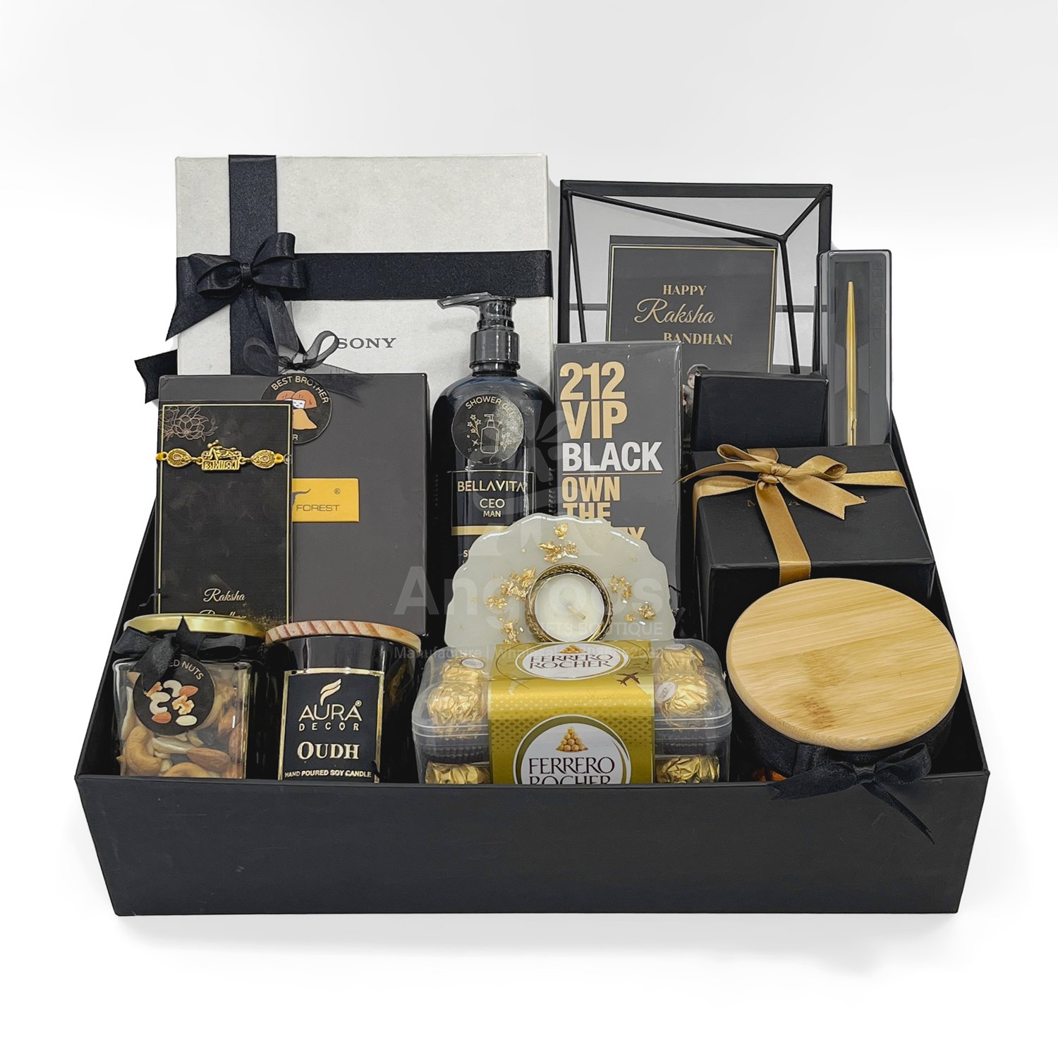 Make this Raksha Bandhan unforgettable with our black theme Raksha Bandhan gift for men, a luxurious hamper curated to impress. Designed in an elegant black presentation box, this hamper includes a high-end Sony headset, 212 VIP Black perfume, premium Bellavita shower gel, and a classic Urban Forest belt — perfect for a modern gentleman. The hamper also features a Parker pen with case, Mutaqinoti handmade necktie, stylish card holder, metal photo frame, and Rakhi with matching card and decor. To complete the experience, we’ve added gourmet elements like Ferrero Rocher chocolates, mixed dry fruits, chocolate balls, and an Oudh-scented Aura Decor candle. Whether you’re gifting your brother, friend, or colleague, this hamper blends style, utility, and celebration in one power-packed package.