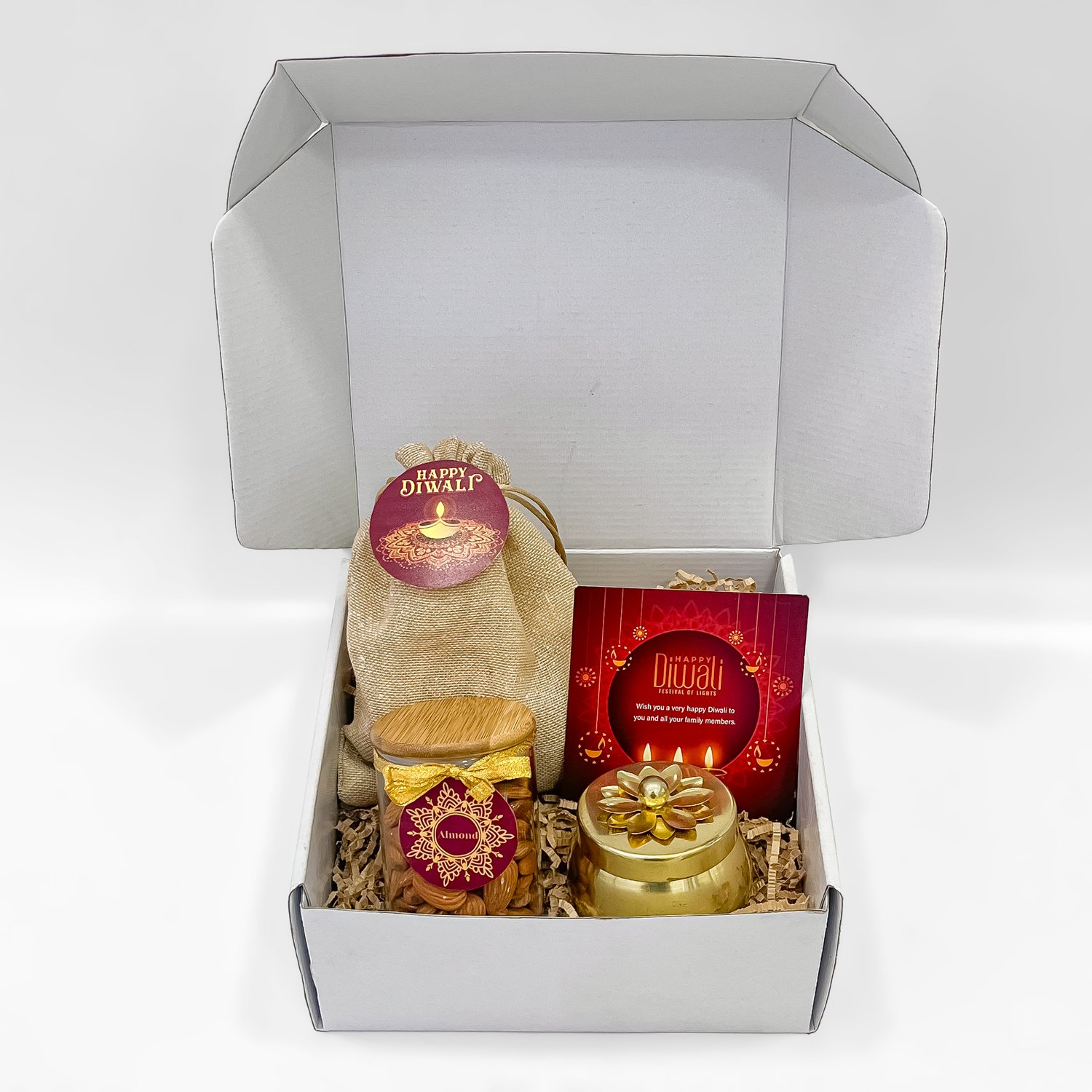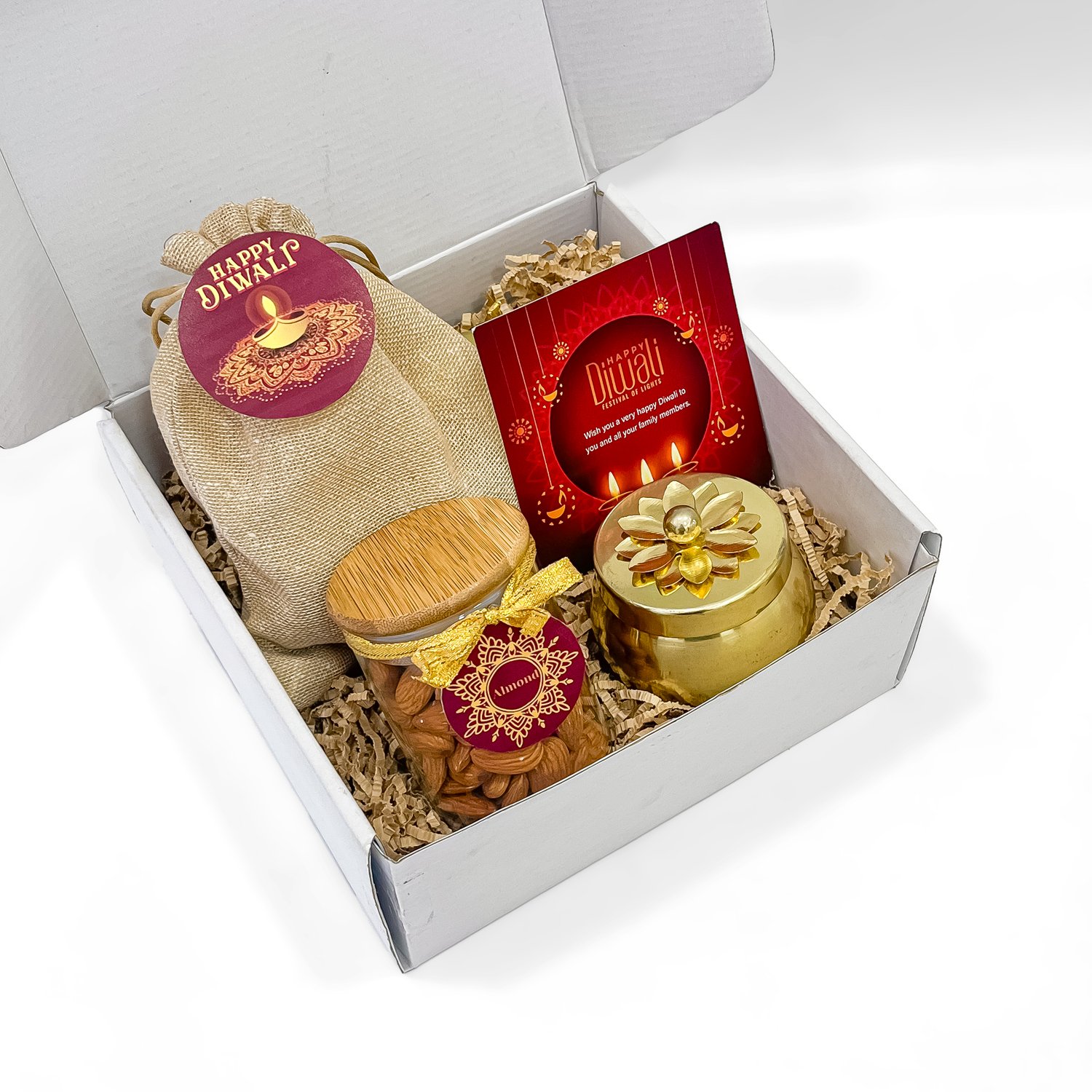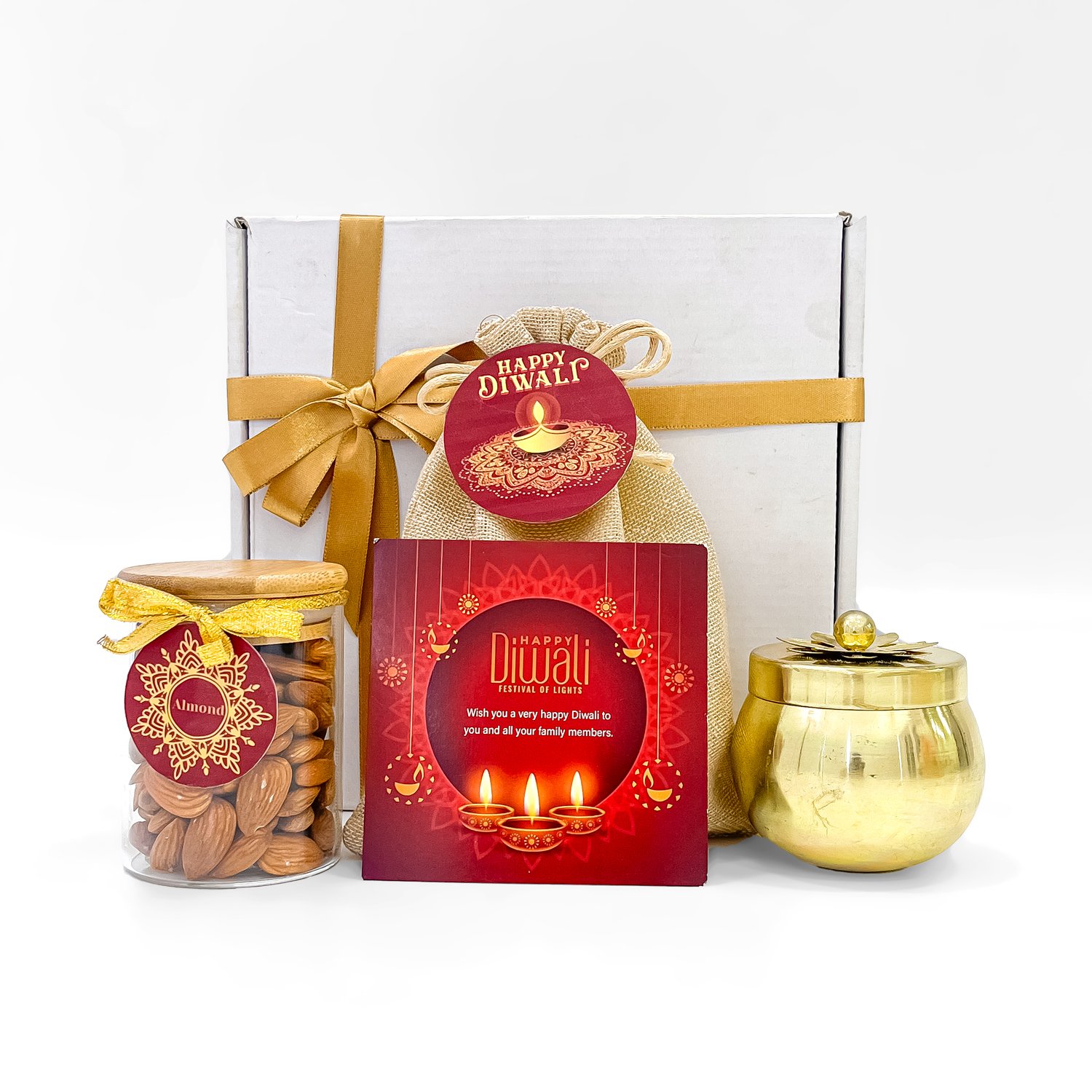 Celebrate Diwali with this thoughtfully packed budget gift box featuring almonds, jute potli, golden decor jar, and a festive greeting card.