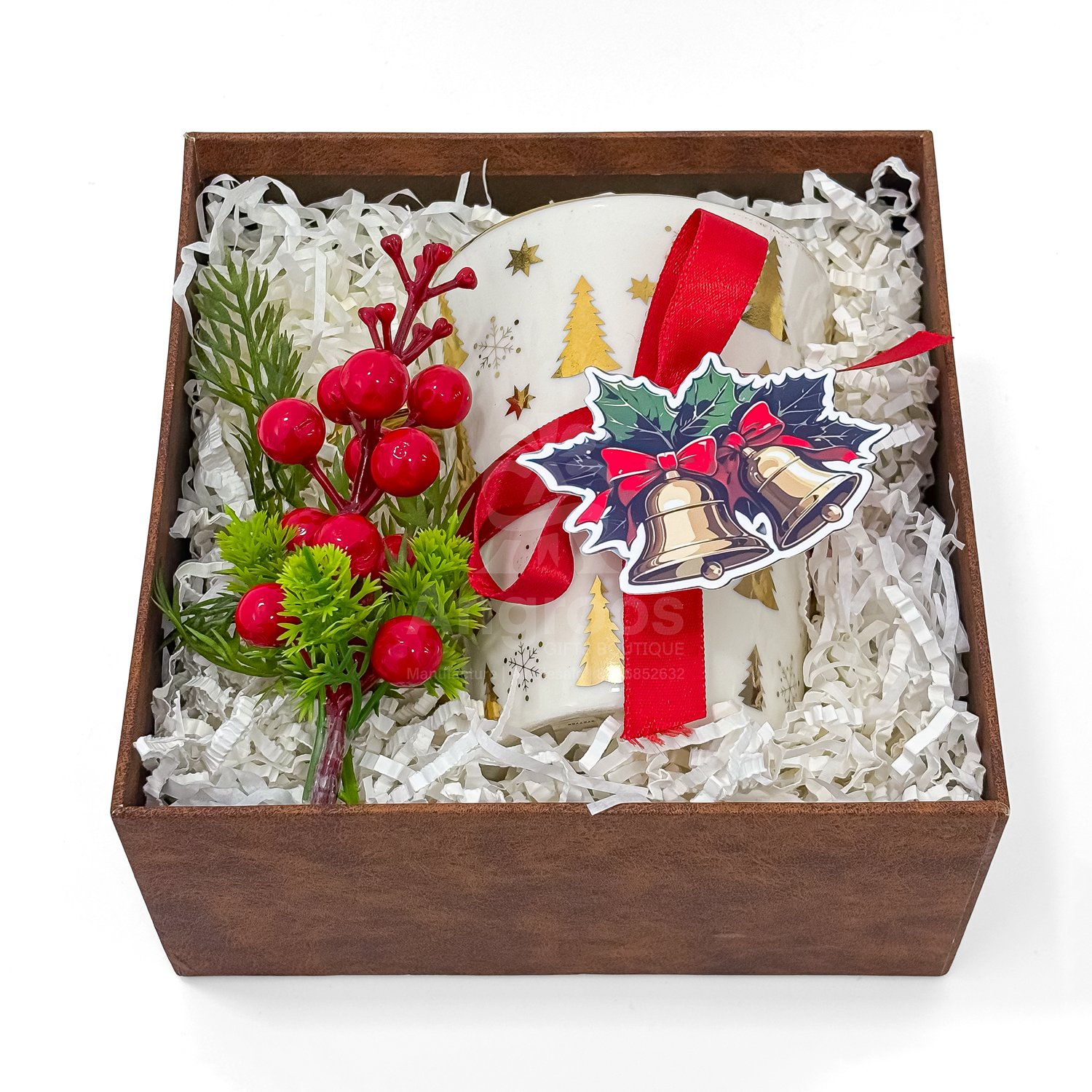 This Christmas Mug Gift Box is designed as a simple and thoughtful festive present. It includes a Christmas-themed mug, a greeting card and a touch of décor packed neatly in a brown gift box.