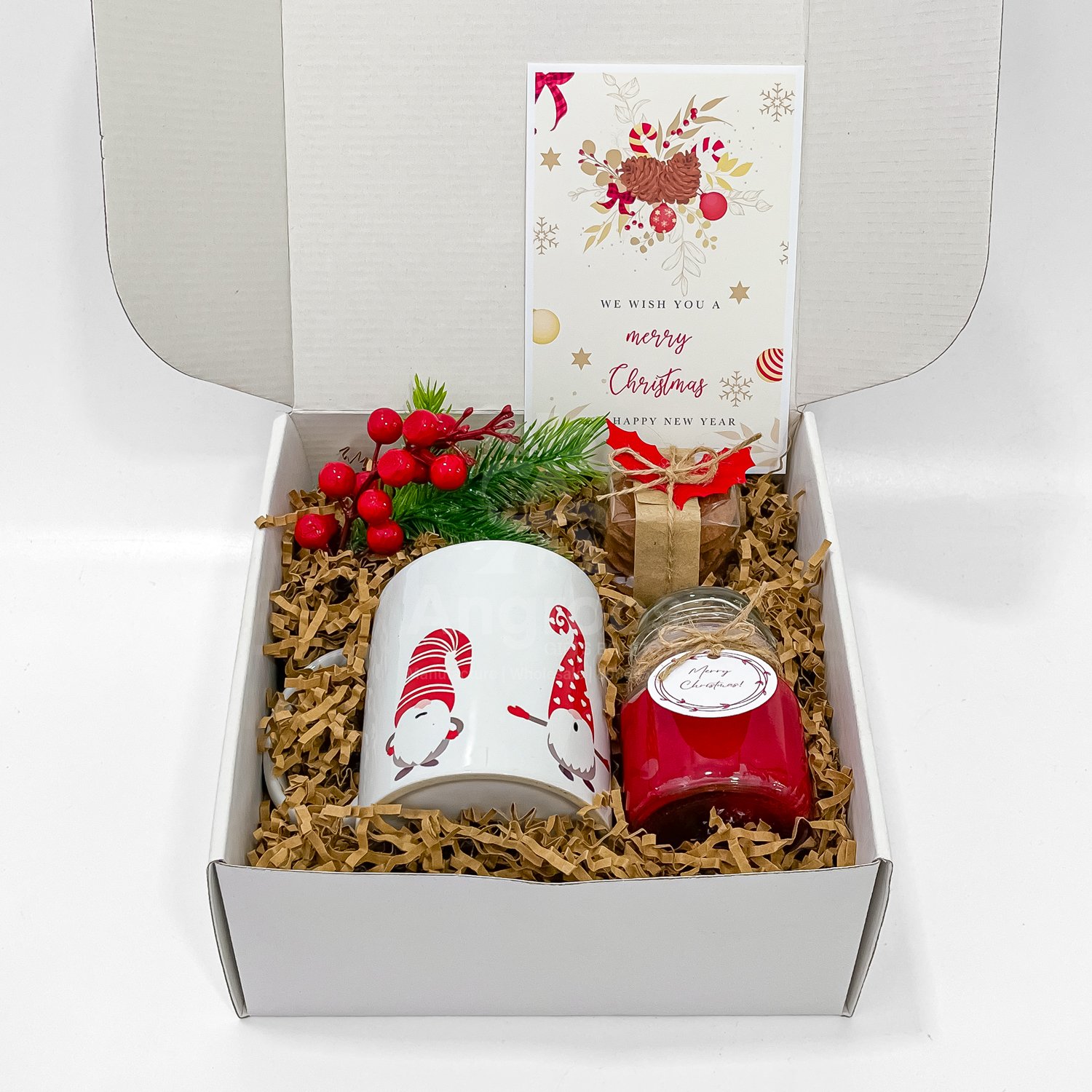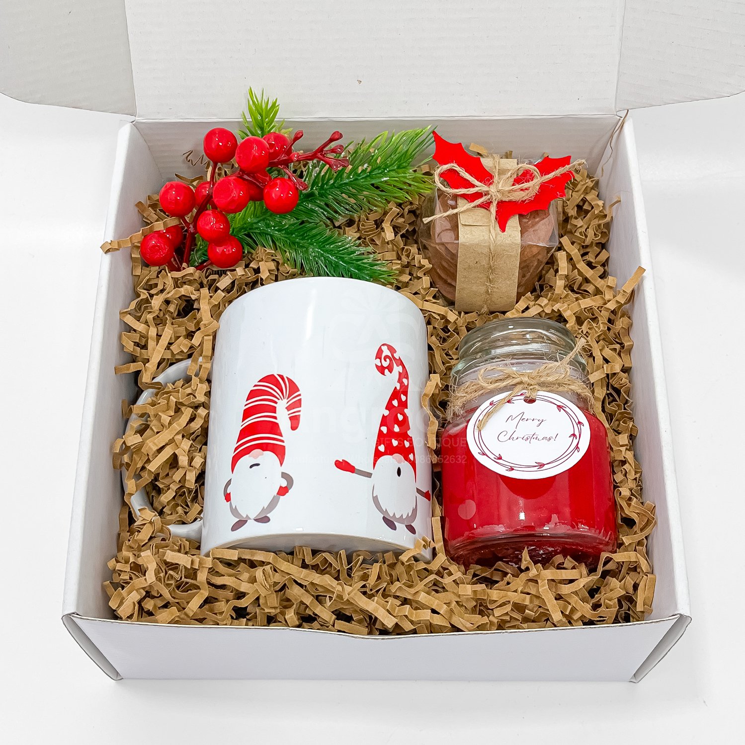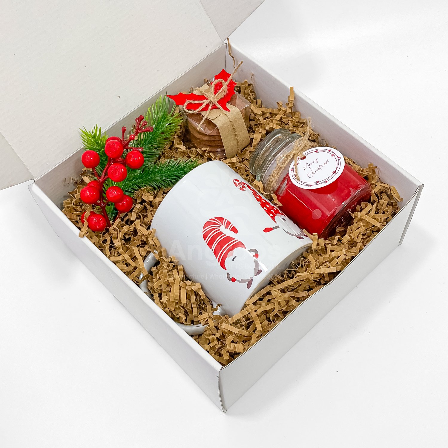 A cheerful Christmas Mug Gift Hamper featuring a festive mug, red candle, Christmas décor berries, a cookie, and a greeting card—packed beautifully in a white gift box.