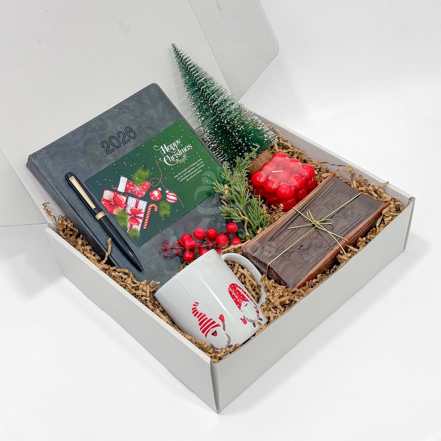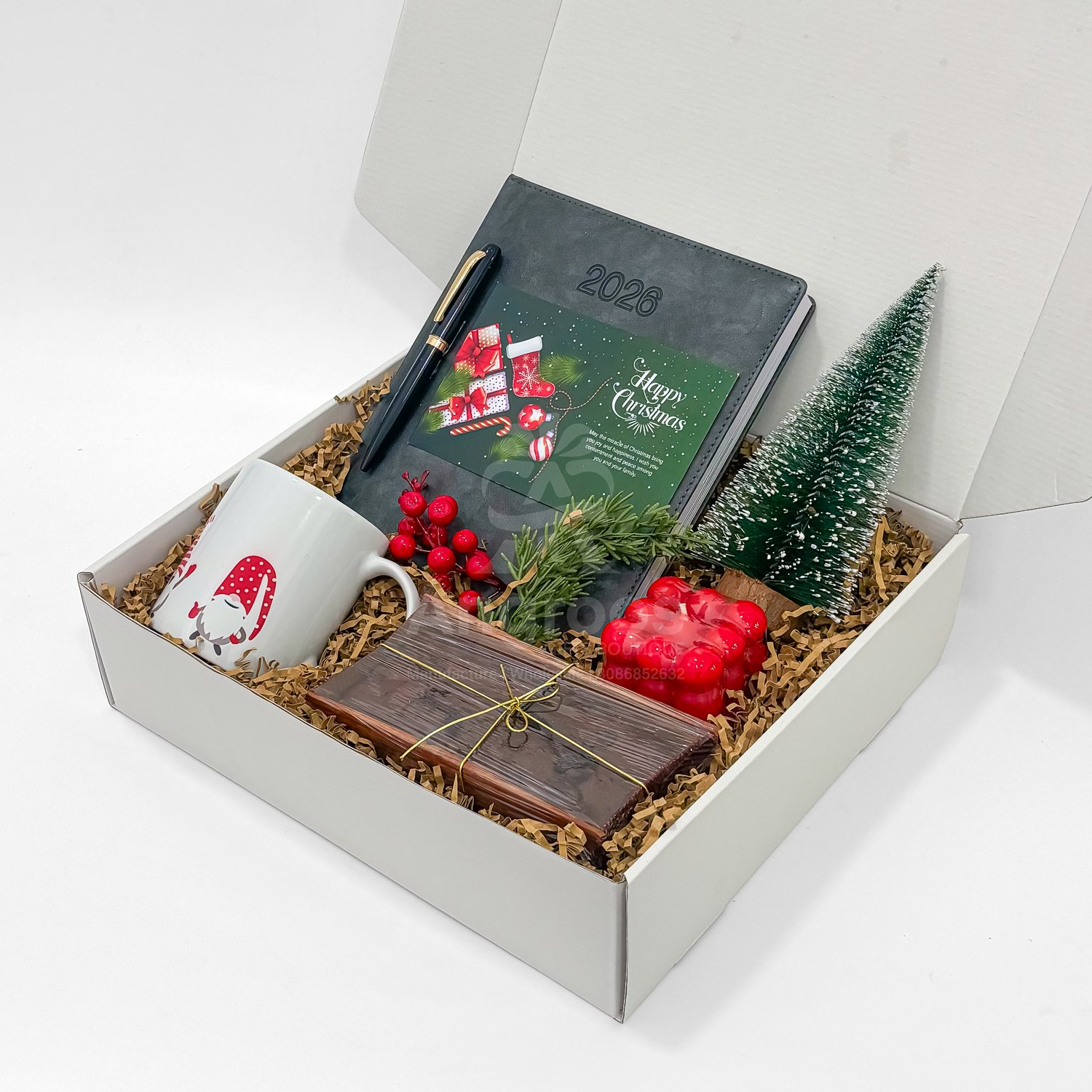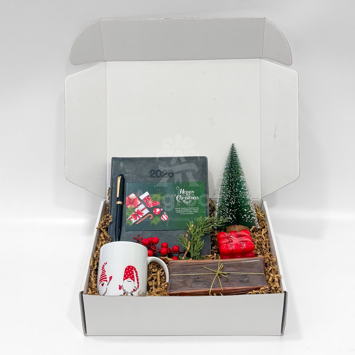 This Christmas office gift box is designed as a thoughtful festive hamper for professional gifting during the holiday season. It features a stylish 2026 diary paired with a premium pen, offering a practical addition for everyday office use. The Christmas-themed ceramic mug adds a cheerful touch, while the handcrafted bubble candle and mini Christmas tree décor enhance the festive feel.
