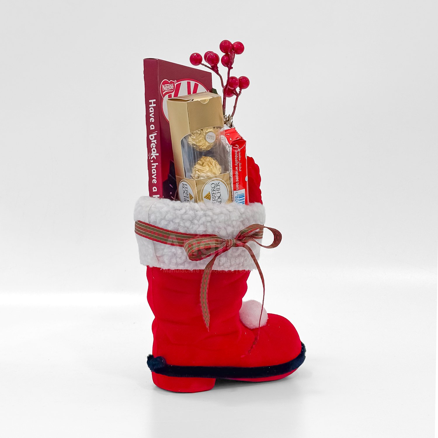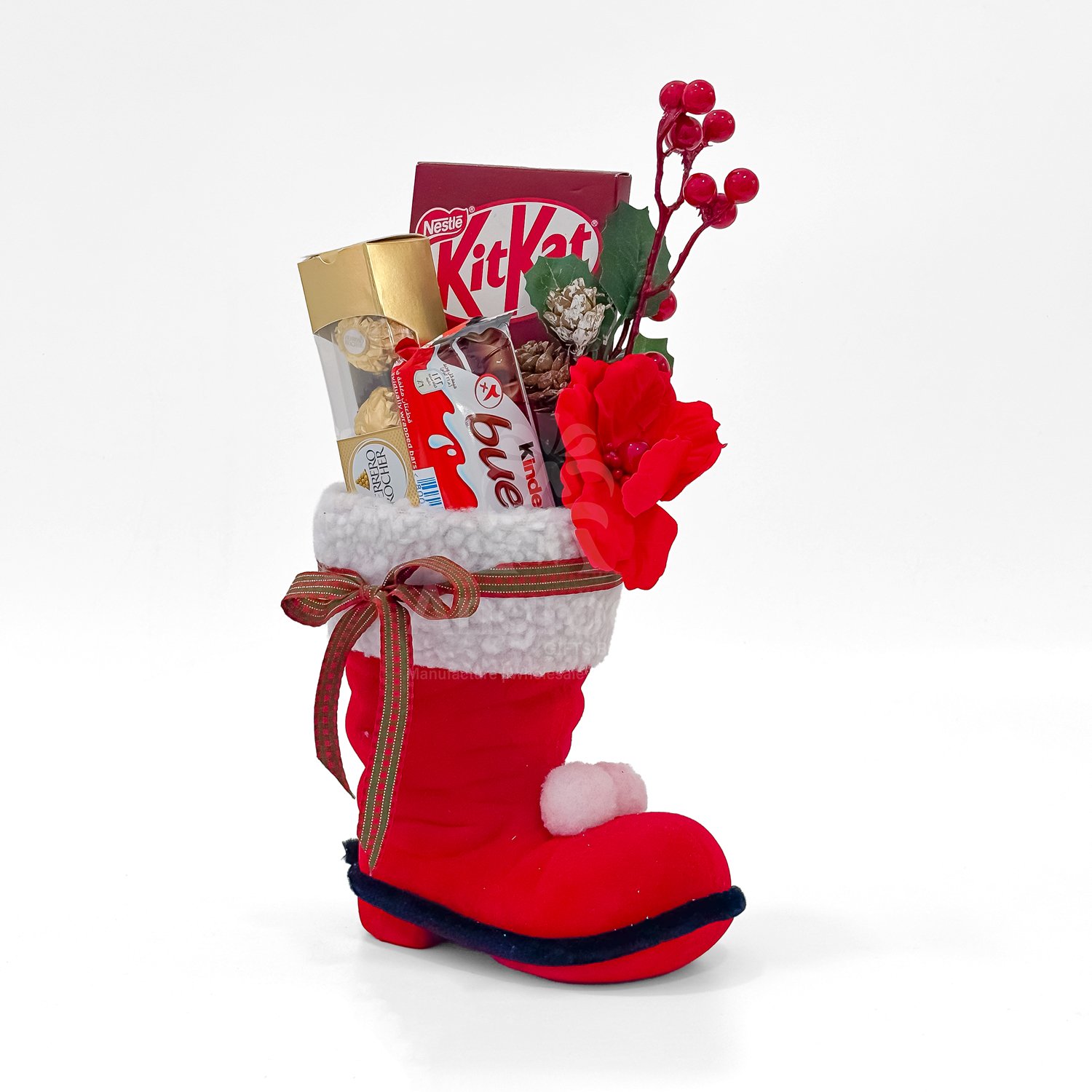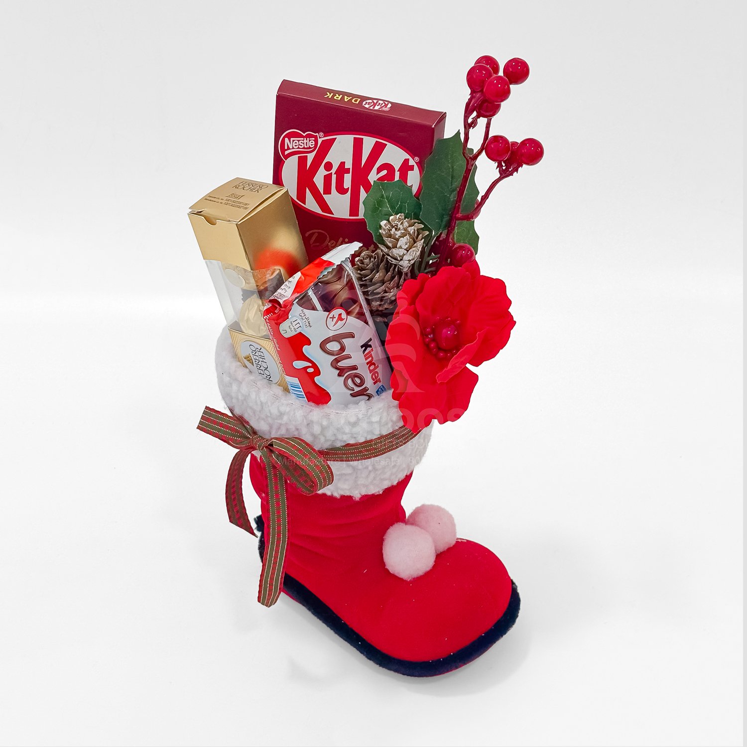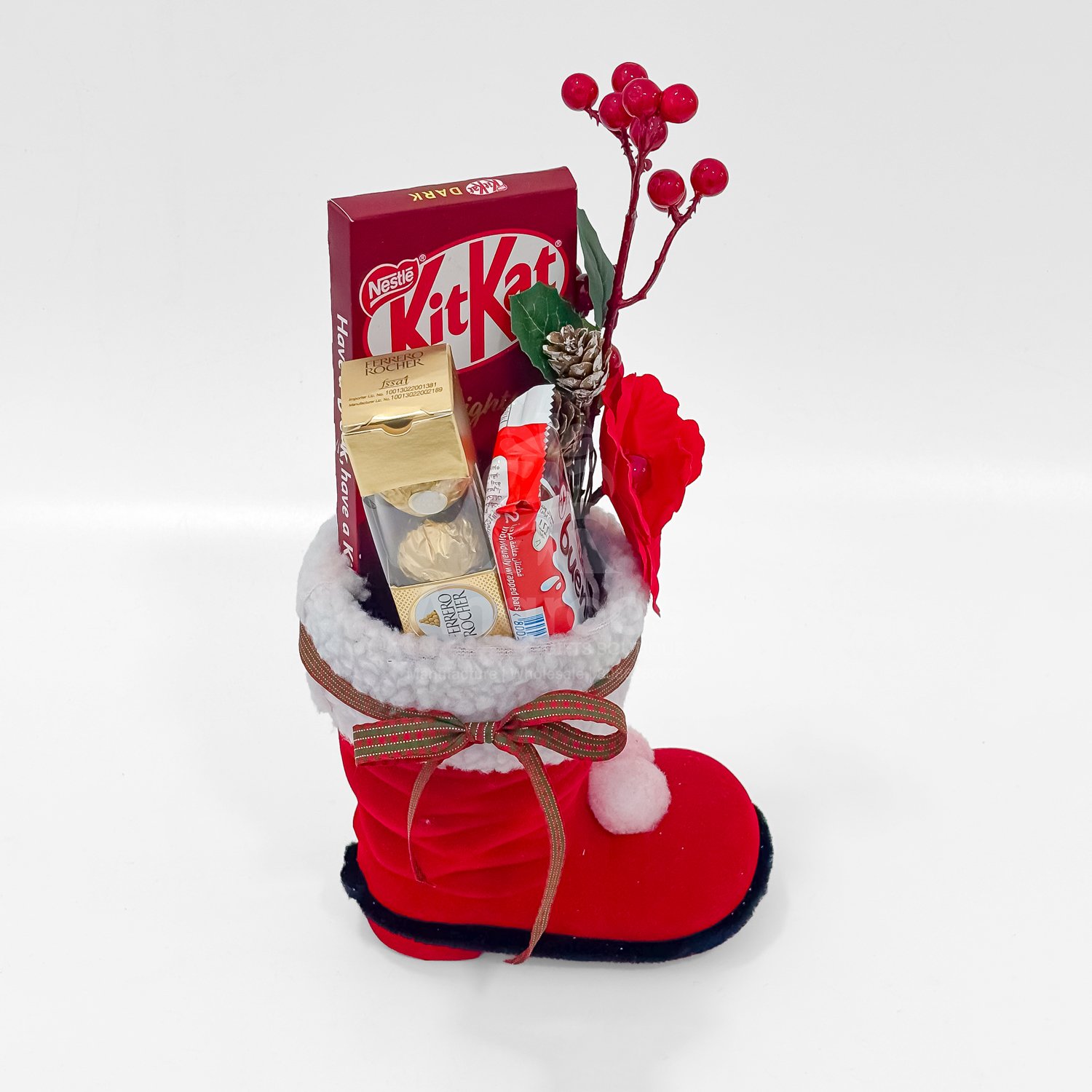 This Christmas Santa boot hamper is designed as a fun and festive gifting option for the holiday season. The soft Santa boot acts as a decorative and reusable display piece while holding an assortment of chocolates including Ferrero Rocher, KitKat and Kinder Bueno. The arrangement is enhanced with Christmas berries, pine elements and seasonal ribbons to create a bright and cheerful look. It is suitable for kids, friends, employees and family gifting during Christmas parties, Secret Santa exchanges and holiday events. The hamper is light, attractive and ready to present, making it a popular choice for Christmas gifting.