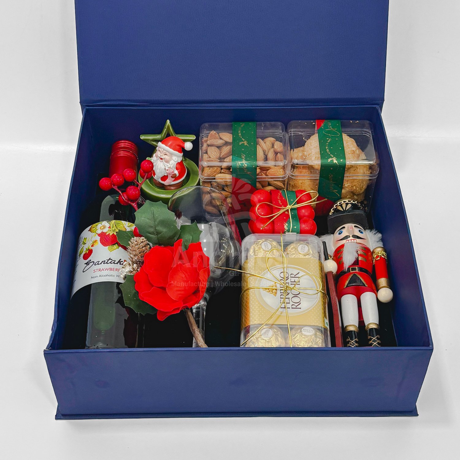 Experience the joy of festive gifting with this beautifully assembled Christmas Wine Gift Box, designed to elevate your celebrations with luxury and warmth. This premium hamper includes a rich non-alcoholic red wine, paired with a fine wine glass for a complete indulgence. The hamper also features almonds, freshly baked cookies and Ferrero Rocher chocolates, making it a perfect treat for Christmas evenings. A handcrafted nutcracker statue and a festive Santa figurine add a charming decorative touch, while a candle holder and bubble candle enhance the seasonal ambience. Thoughtfully presented in a luxury magnetic gift box, this Christmas hamper is ideal for corporate gifting, employee rewards, family celebrations and premium festive gifting. Every item is chosen to reflect holiday cheer, making this hamper a memorable present for Christmas and New Year.