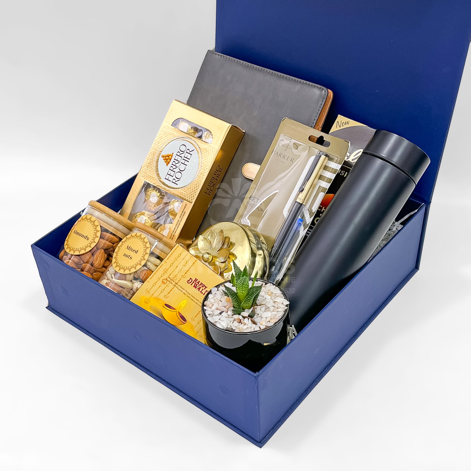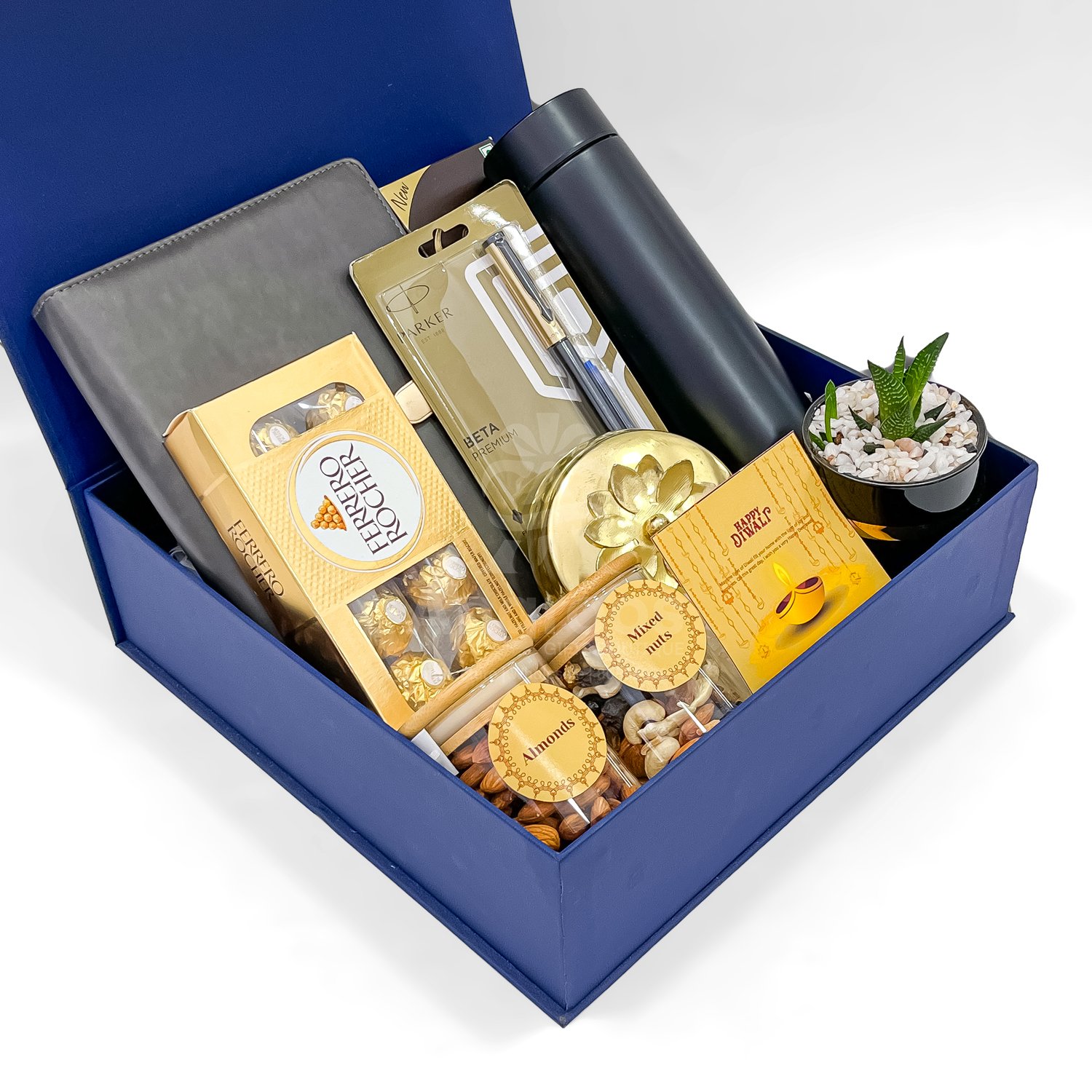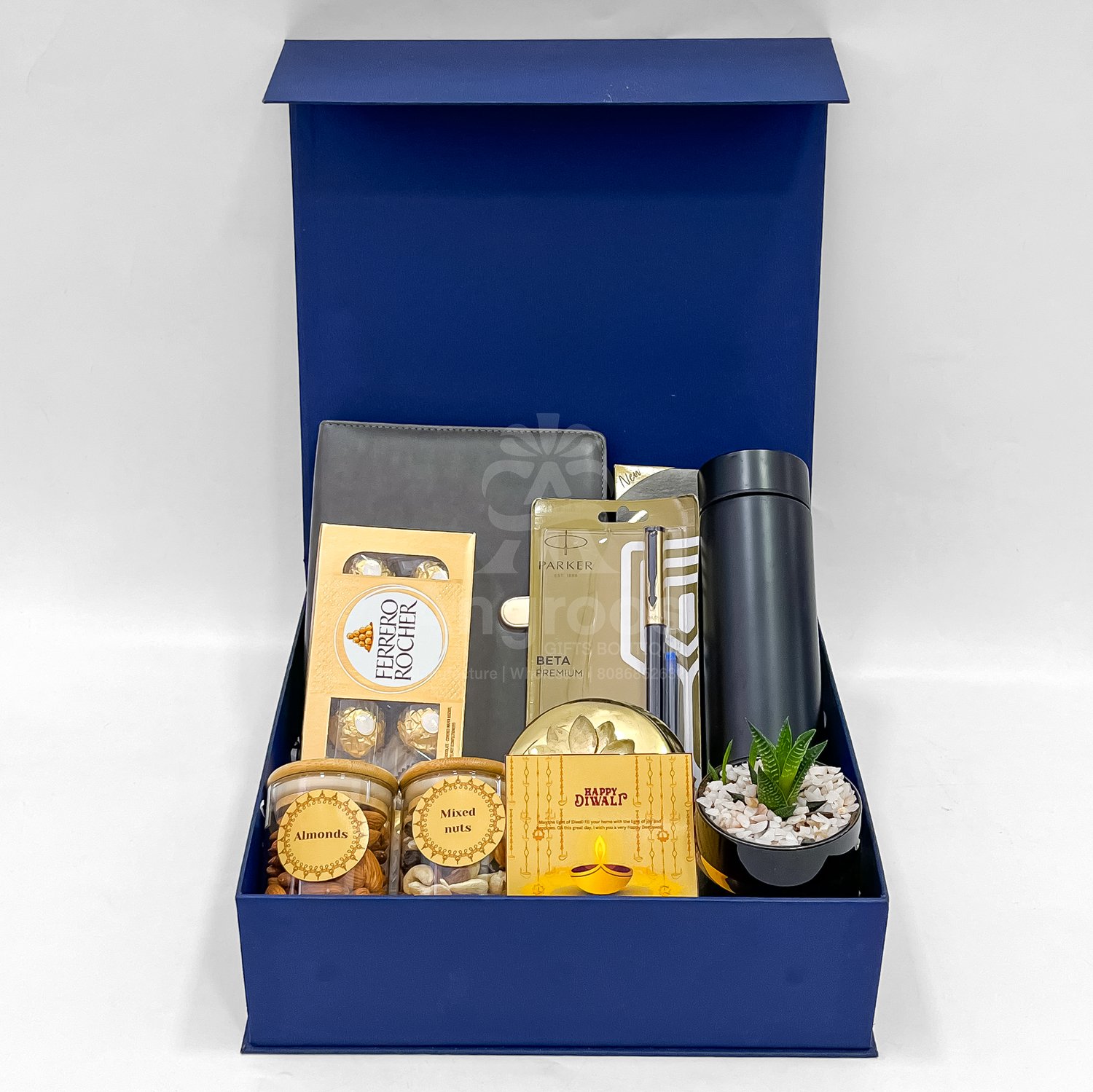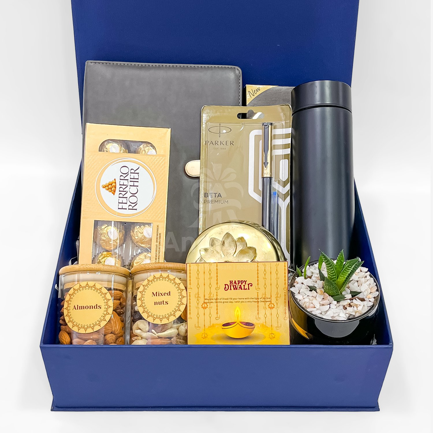 This premium corporate Diwali gift box is curated with a diary, Parker pen, bottle, Ferrero Rocher, almonds, mixed nuts, and a decorative plant. Perfect for employee and client gifting.