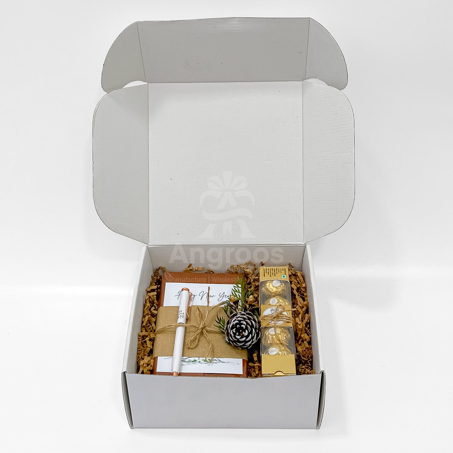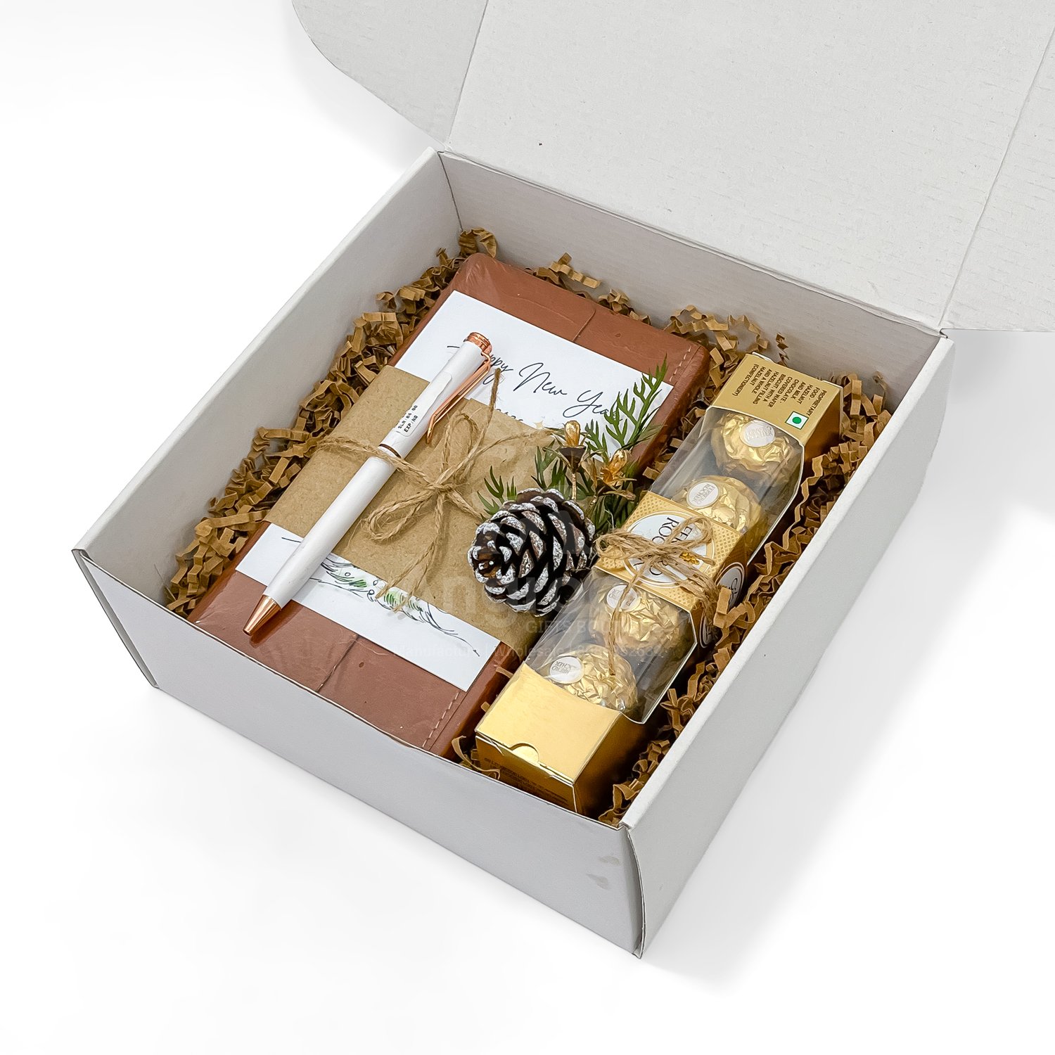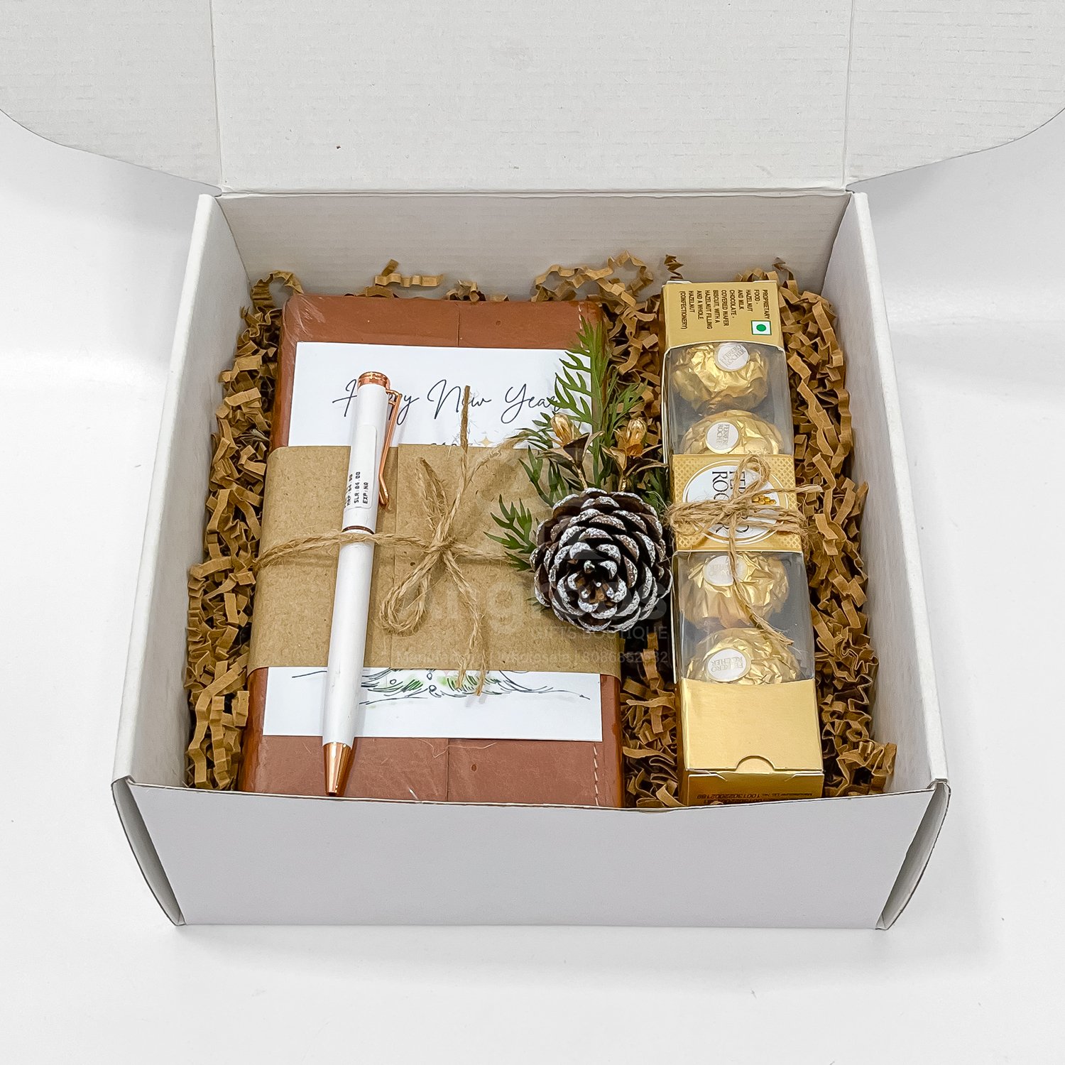 The Angroos Corporate New Year Gift Box is thoughtfully curated for companies looking to present a clean, practical, and meaningful New Year gift. This 8×8-inch box features a high-quality diary wrapped in kraft paper, a smooth white pen, a 4-piece Ferrero Rocher pack, and elegant pine décor for a fresh New Year feel.