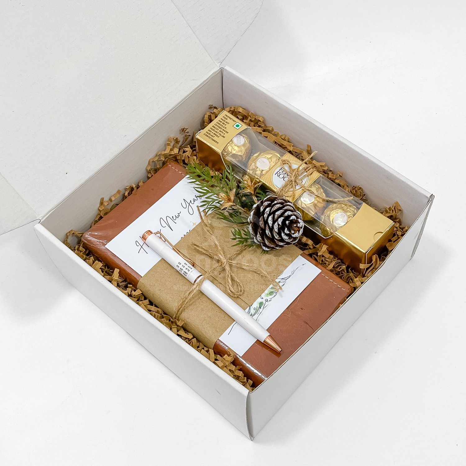 This Angroos corporate new year gift box includes a premium diary, smooth pen, Ferrero Rocher chocolates, and festive pine décor. Ideal for employee and client gifting.