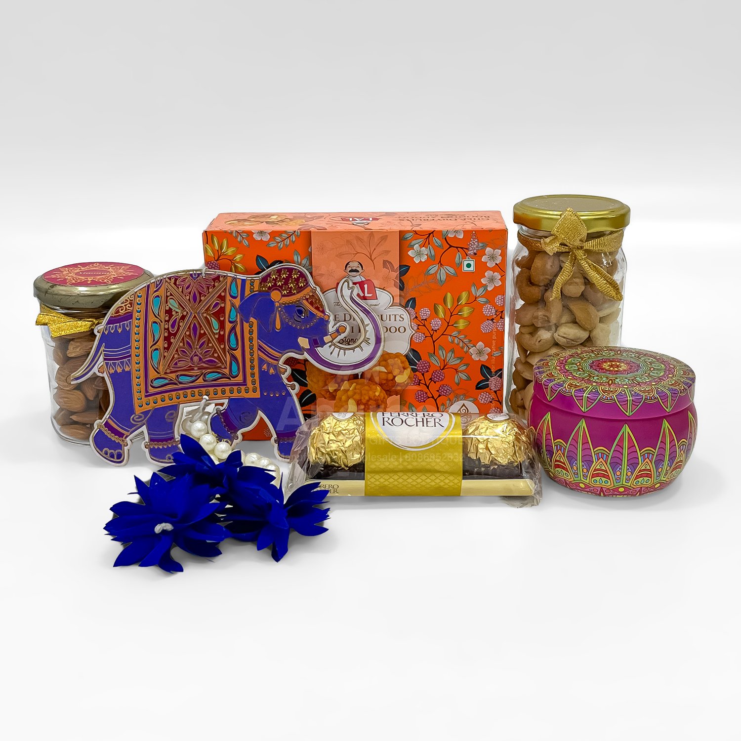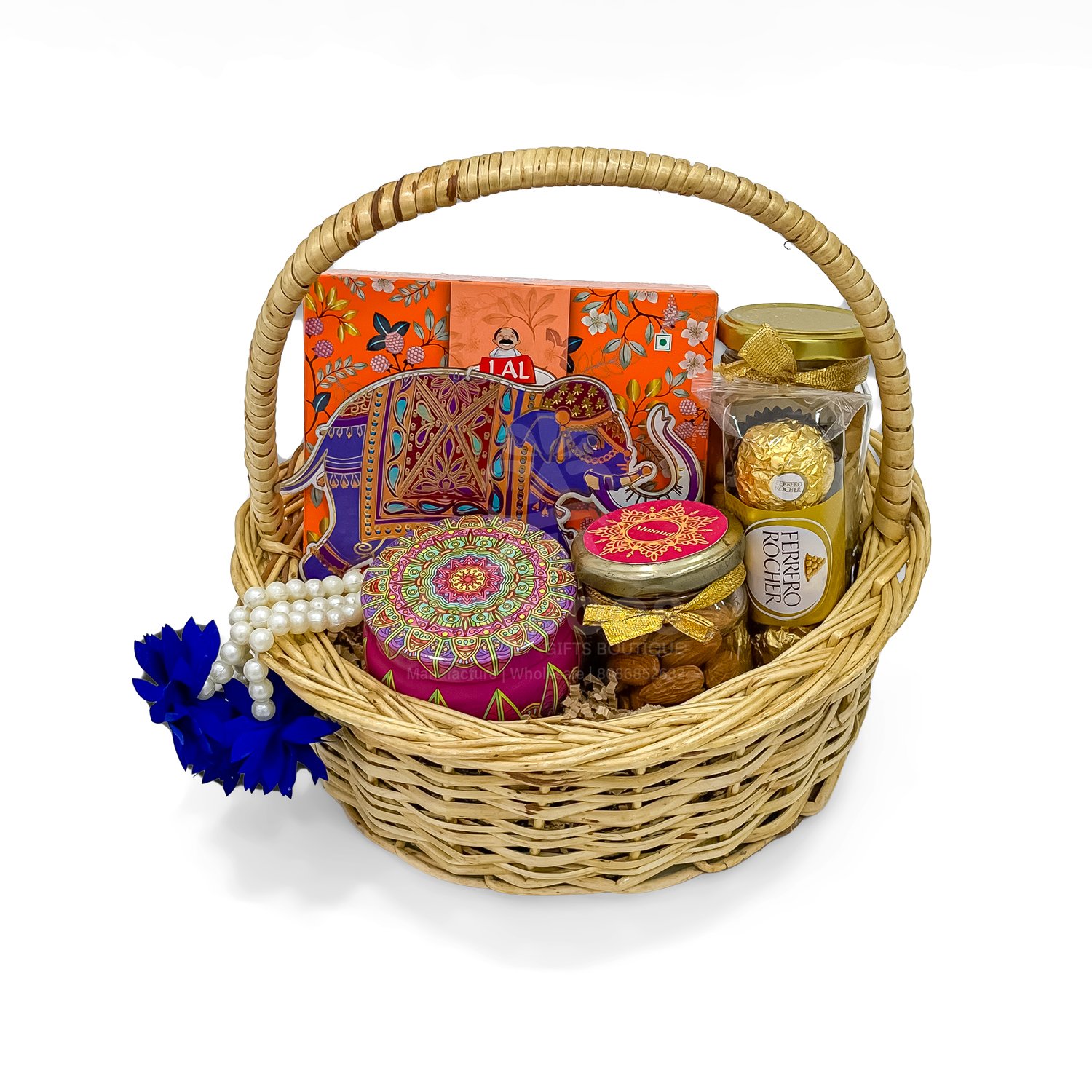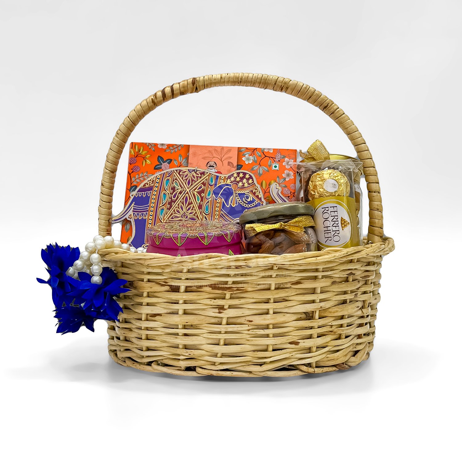 Celebrate the Festival of Lights with this thoughtfully curated Diwali gift basket filled with tradition, taste, and elegance. Housed in a beautiful handcrafted woven basket, this hamper includes ghee-rich boondi laddoo, premium almonds and cashews, Ferrero Rocher chocolates, and a luxurious Aura Decor candle. Adding to the festive charm are decorative elements like a colorful elephant hanging, floral accents, and a fabric-covered gift box, making it visually stunning and culturally rich. Ideal for gifting friends, family, employees, or clients, this Diwali hamper brings joy, blessings, and festive warmth in one elegant package. Dimensions: 9.5 × 10 × 9.5 inches (24 × 25.5 × 24 cm) Weight: 1400g
