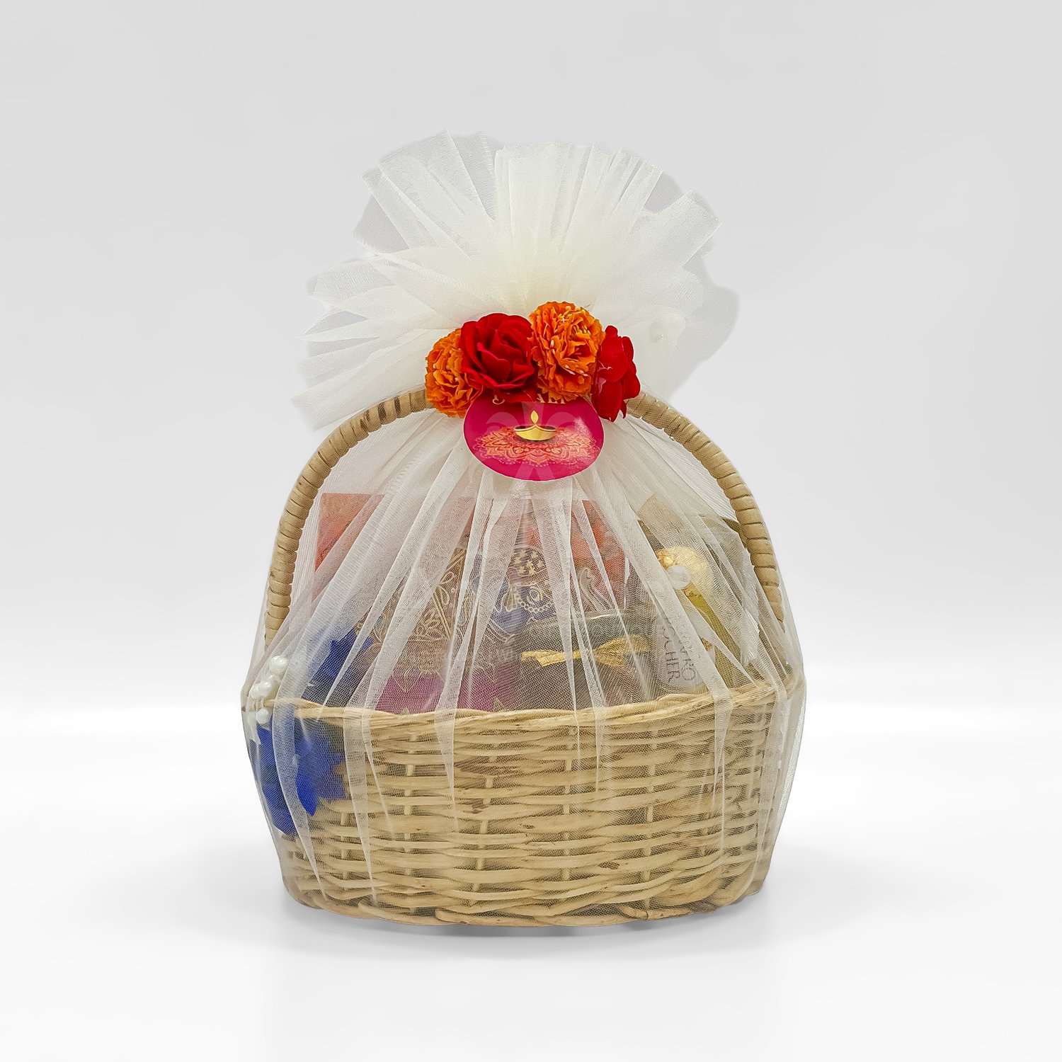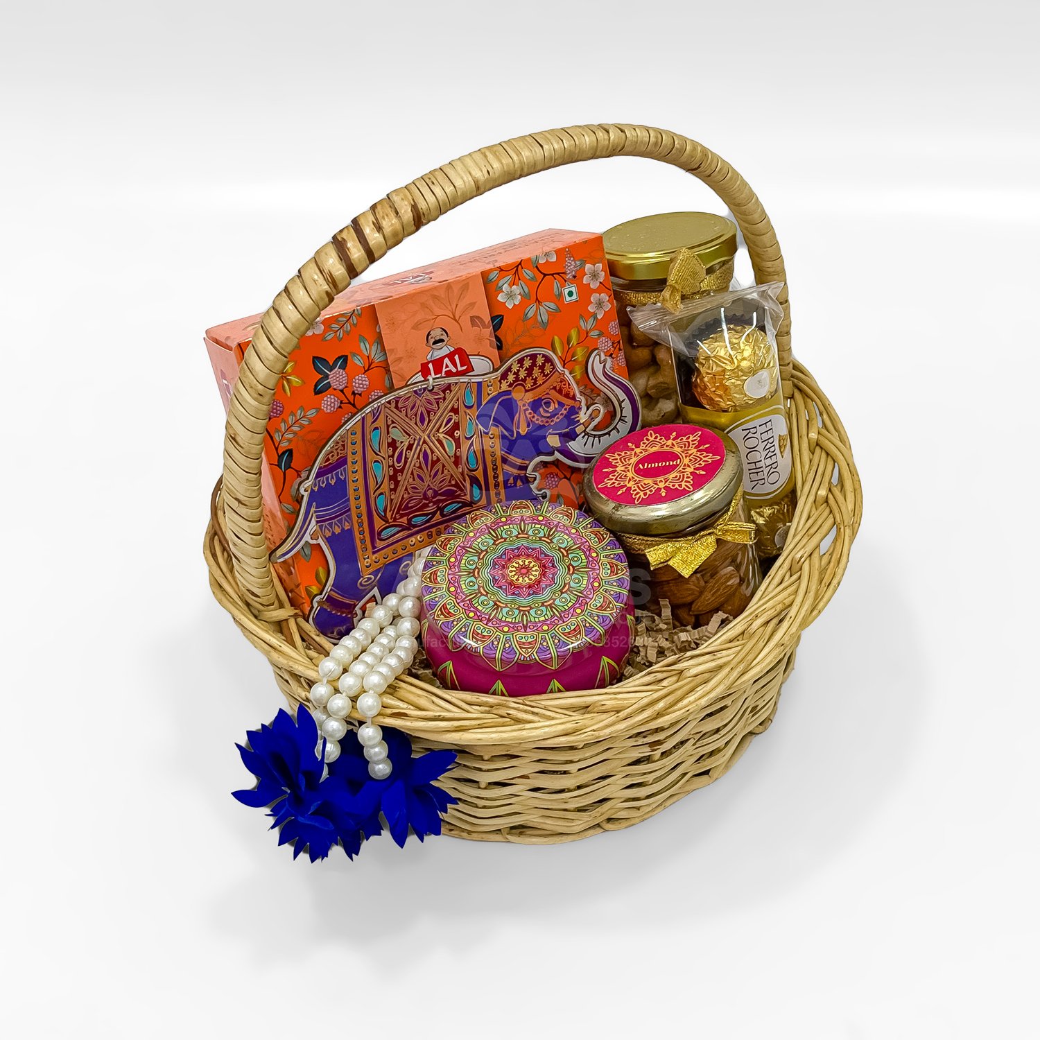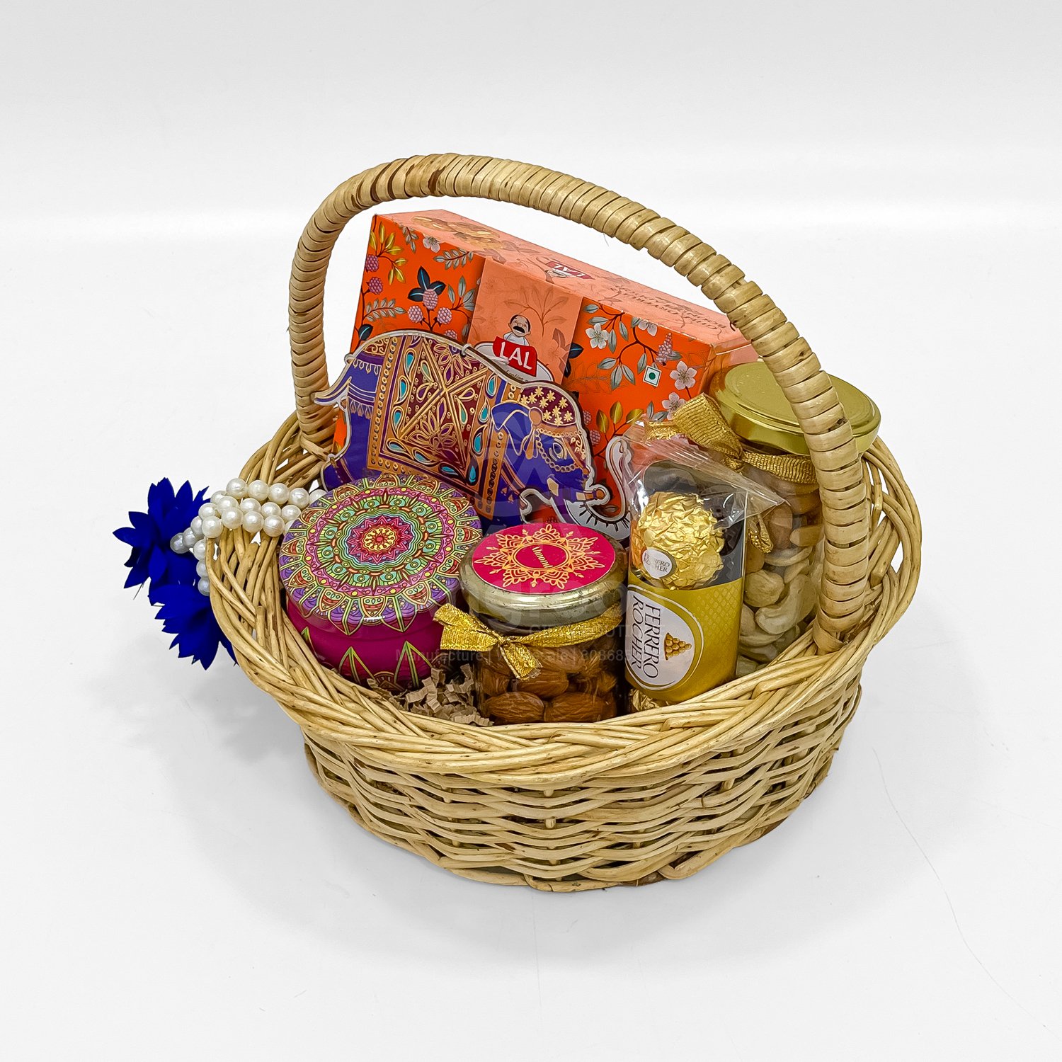 A vibrant Diwali gift basket packed with boondi laddoo, dry fruits, Ferrero Rocher, a fragrant candle, and festive Indian decor in a handcrafted woven basket.