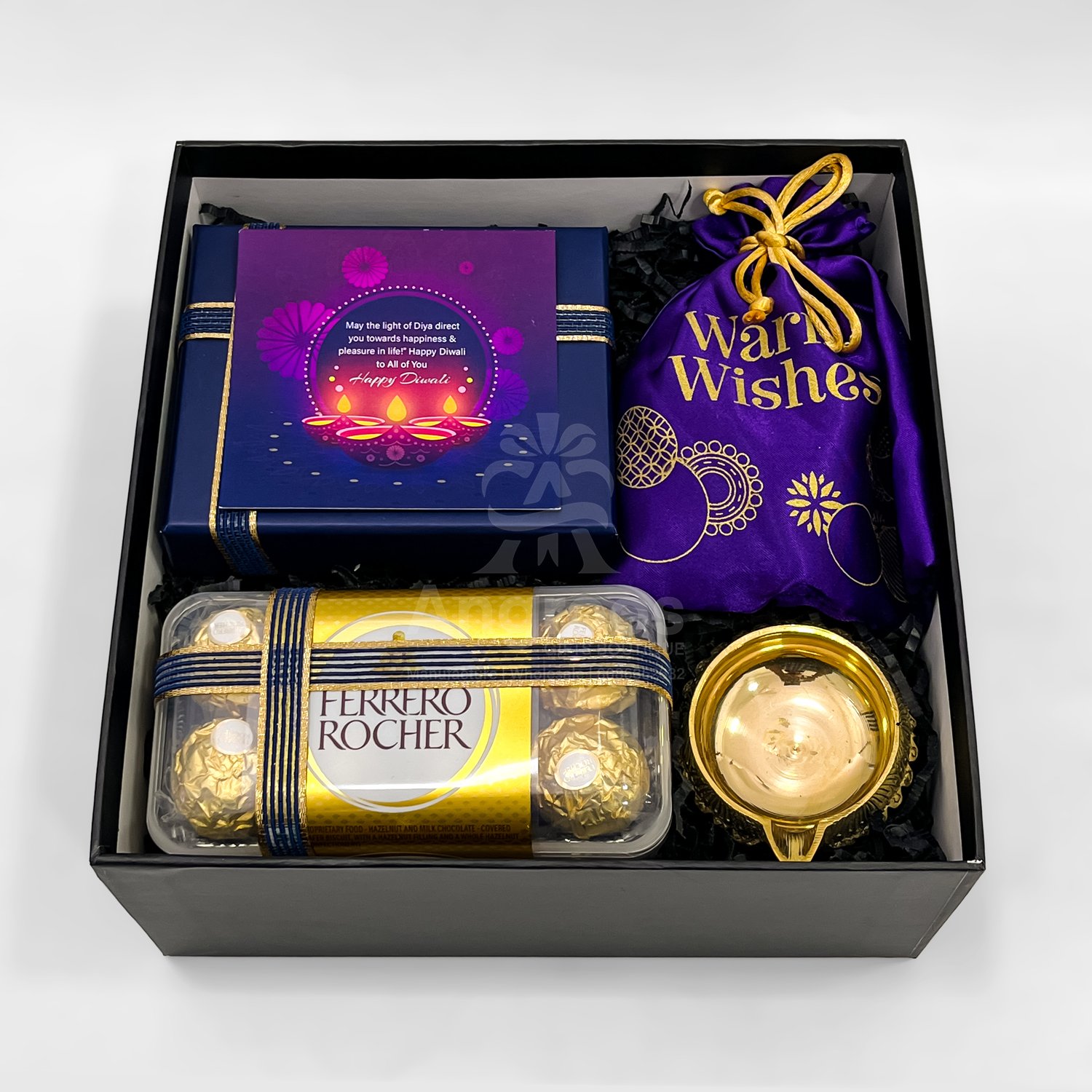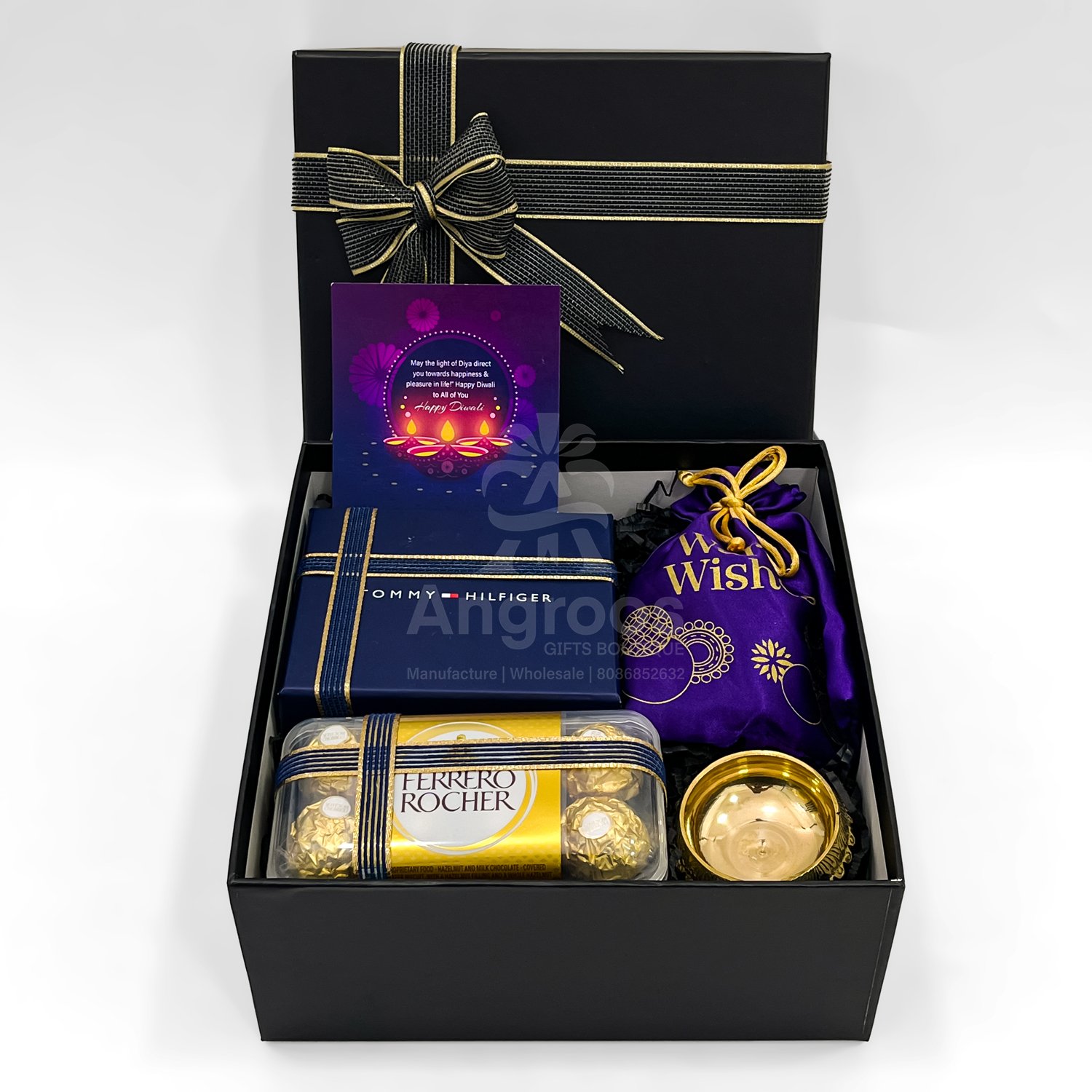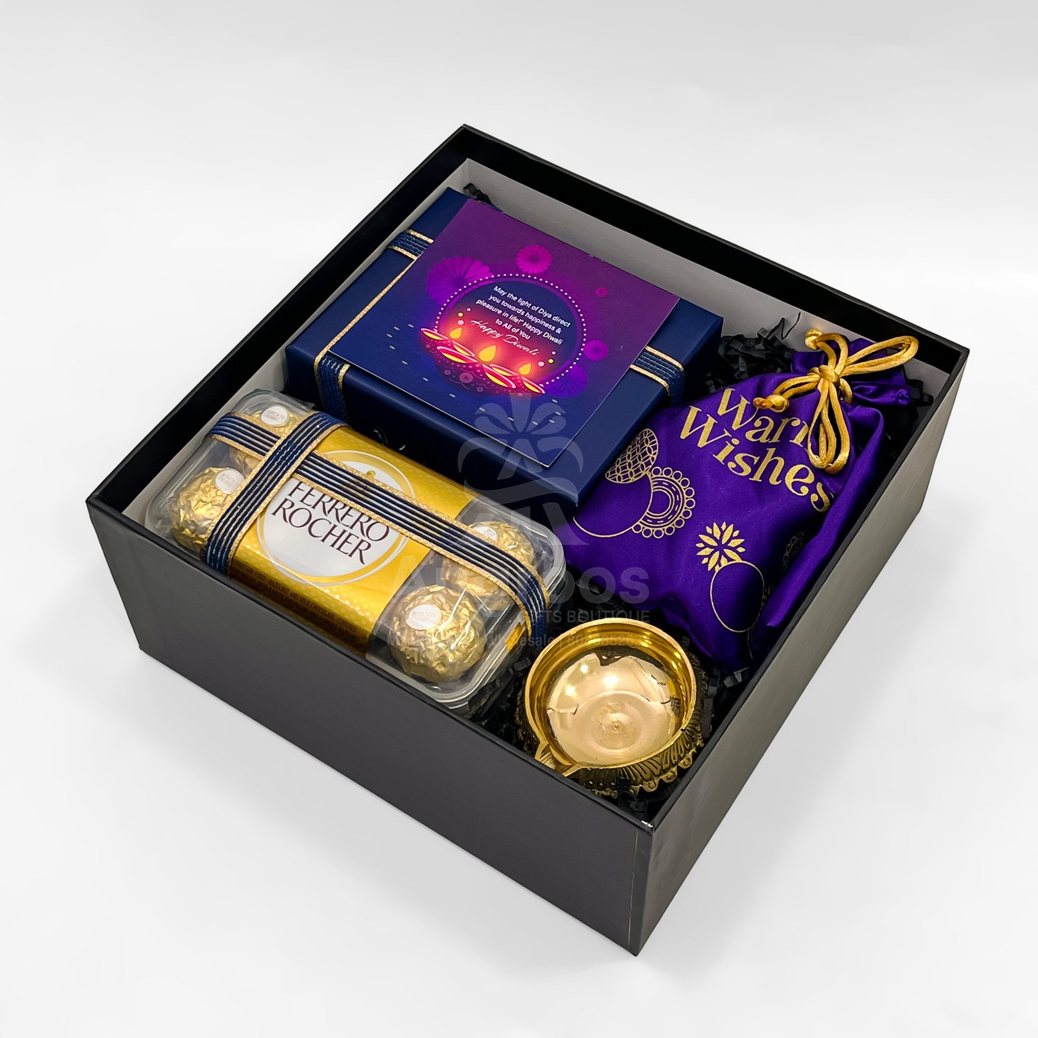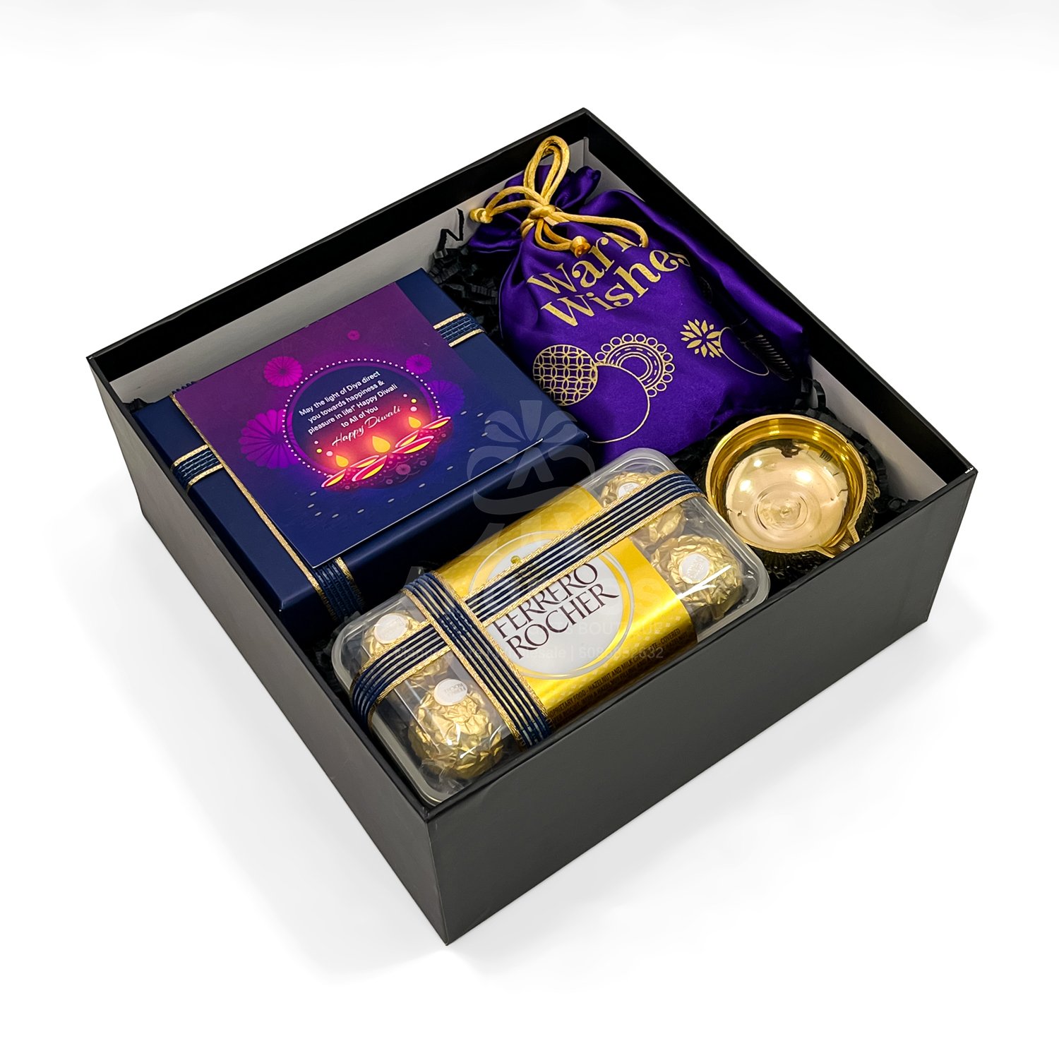 Give a touch of class and celebration with this specially curated Diwali gift box for him. Inside the sleek black gift box lies a premium men’s wallet, a 16-piece Ferrero Rocher chocolate pack, and a beautifully crafted brass diya to symbolize light and prosperity. A festive potli filled with mixed nuts adds a traditional and healthy element, while the included greeting card completes the gift with warmth and care.