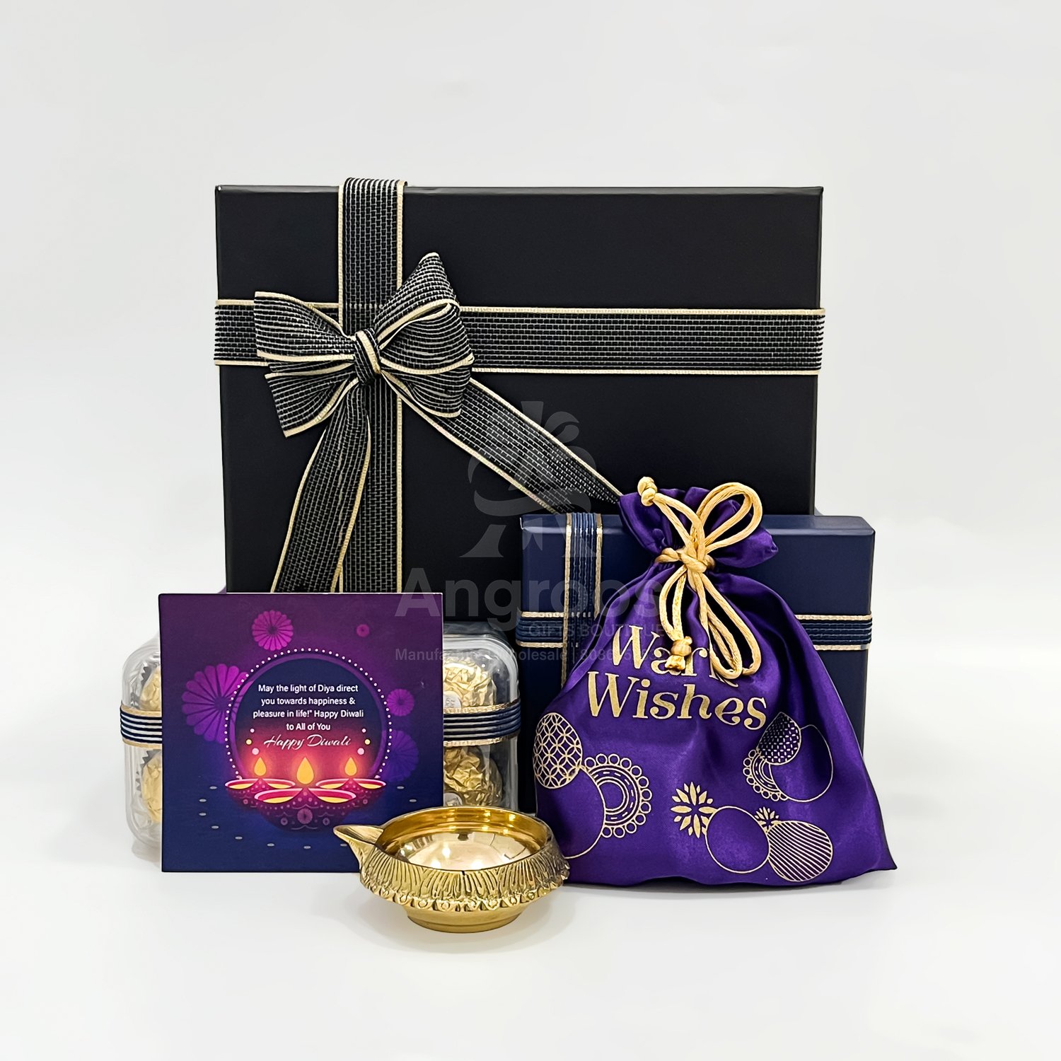 This Diwali gift box for him includes a stylish wallet, Ferrero Rocher chocolates, brass diya, and a festive potli filled with mixed nuts — an ideal pick for corporate and festive gifting.