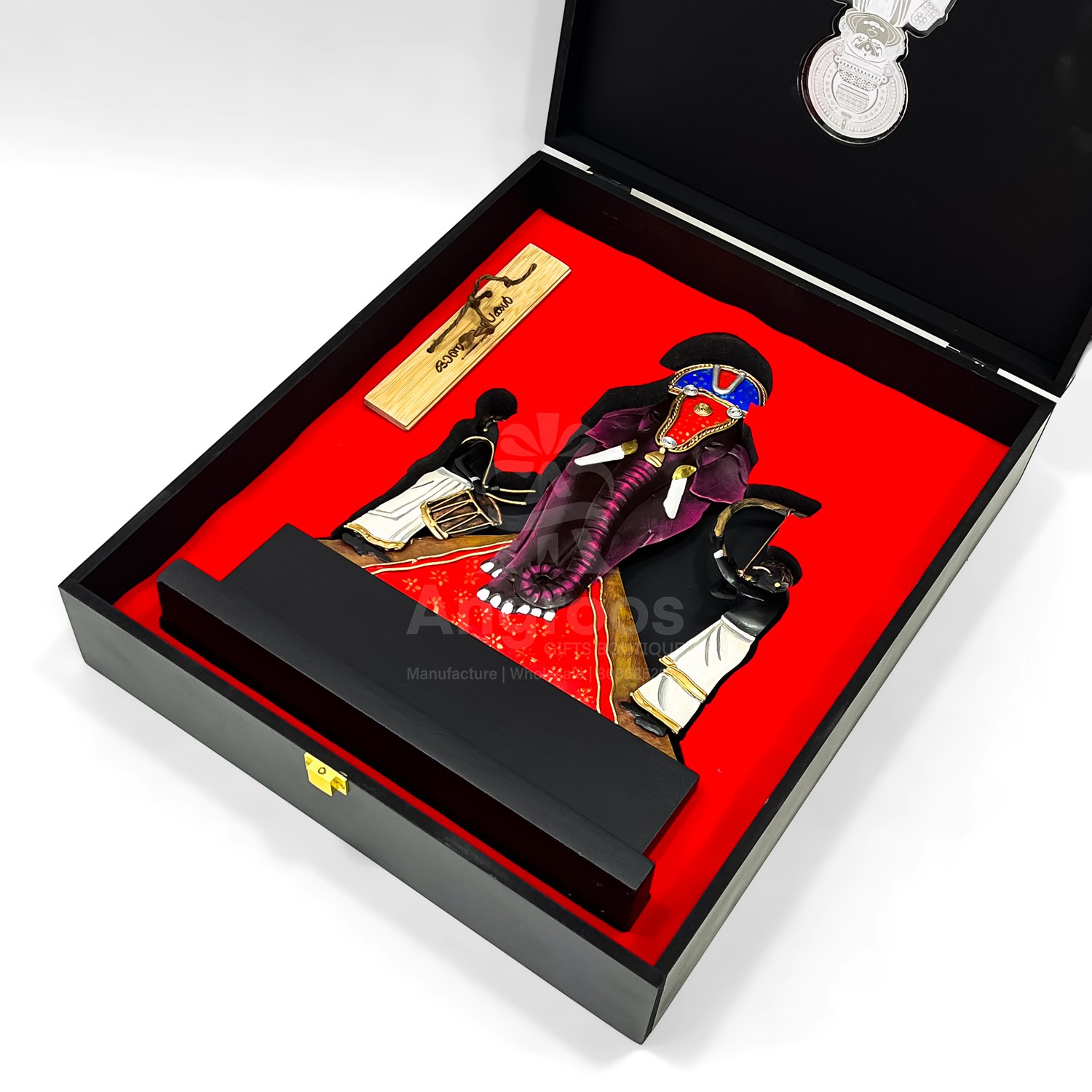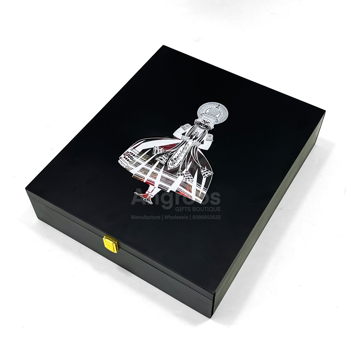 The box measures approximately 3.5 inches (9 cm) in height, 16 inches (40.5 cm) in width, and 13.5 inches (34.5 cm) in length, with a total weight of 2.8 kg. Priced at ₹5808, it includes the Kathakali gift box (₹2500), metal elephant memento (₹2250), Ezhuthola scroll (₹300), and making charges (₹758). Perfect for corporate events, festive hampers, and cultural souvenirs, this gift box captures the vibrant essence of Kerala’s Pooram celebrations.
