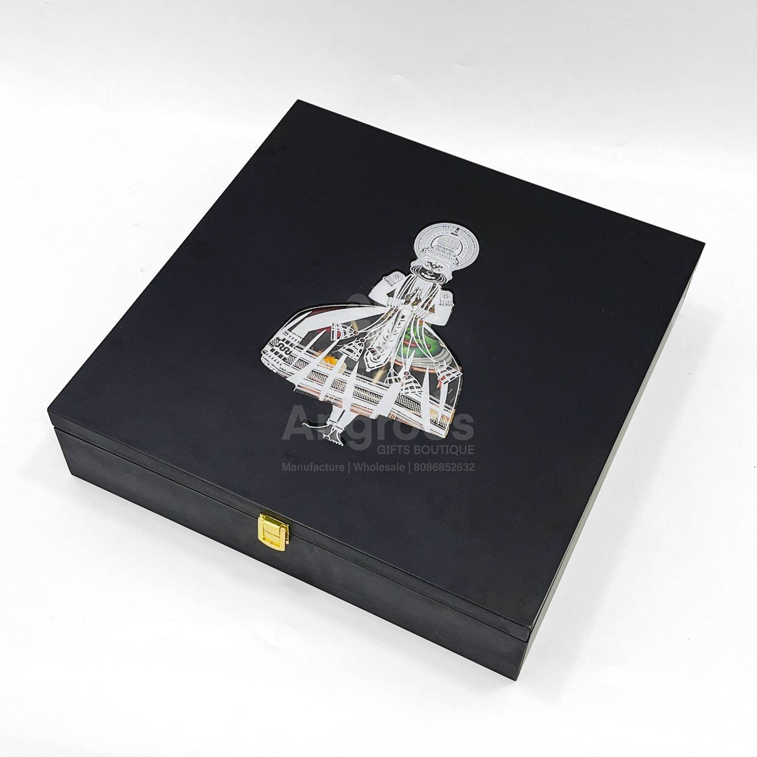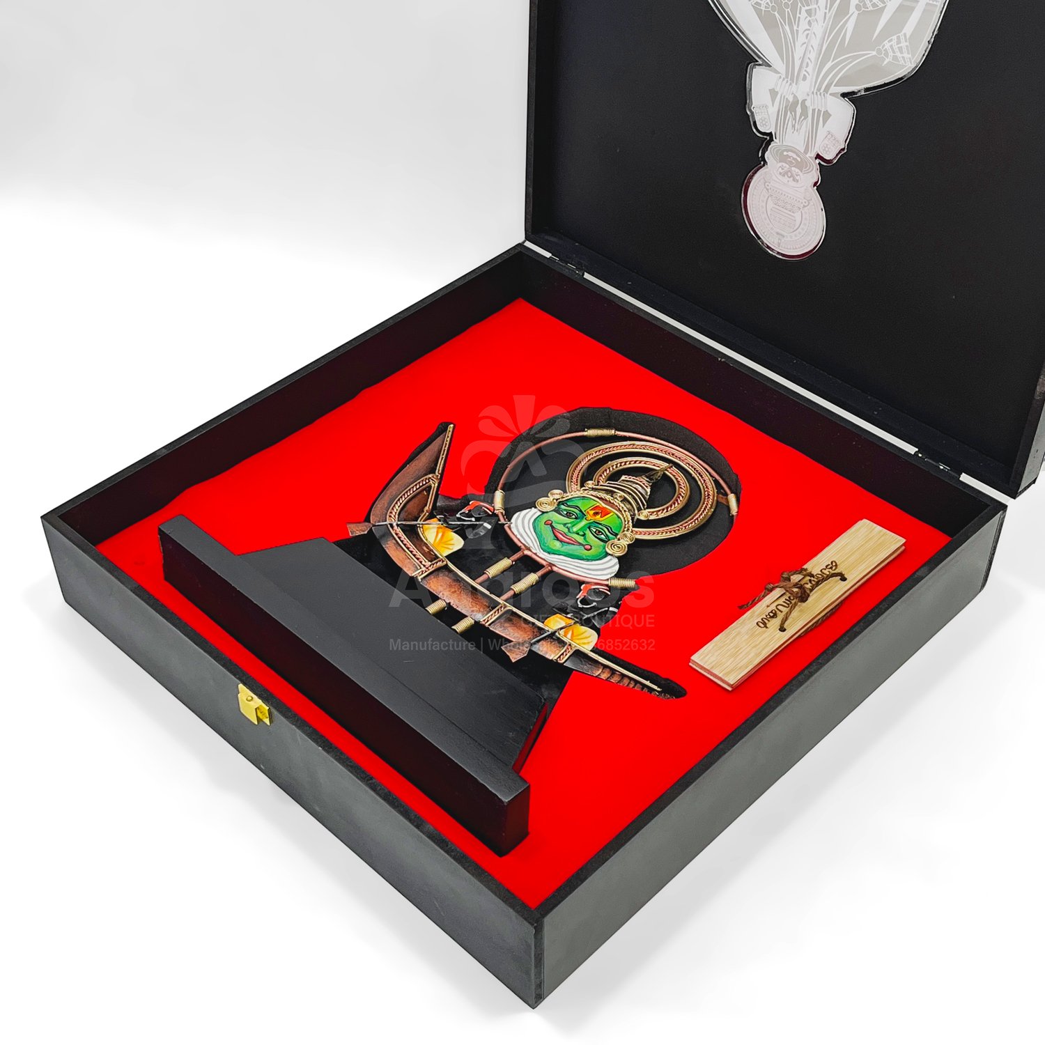 This artistic Kathakali Face Gift Box pays tribute to Kerala’s iconic dance tradition with a finely detailed metal face memento. The set includes an Ezhuthola scroll and comes presented in a sophisticated black wooden box with vibrant red velvet lining. Ideal for corporate, festive, or cultural gifting, it exudes elegance and heritage. Measuring 3.5 inches (9 cm) in height, 15.5 inches (40 cm) in width, and 15.5 inches (40 cm) in length, and weighing 2.93 kg, it’s a perfect statement gift for special occasions.
