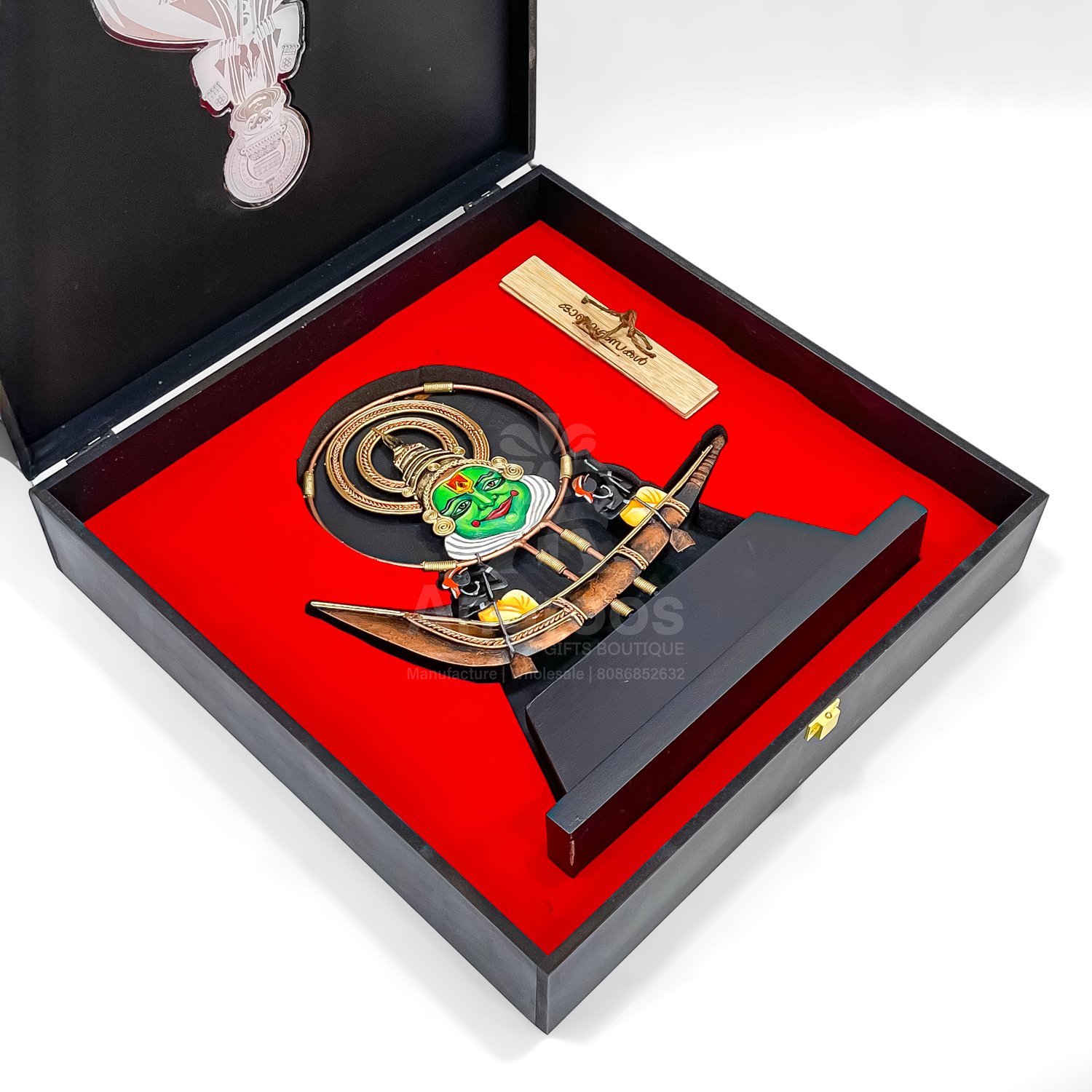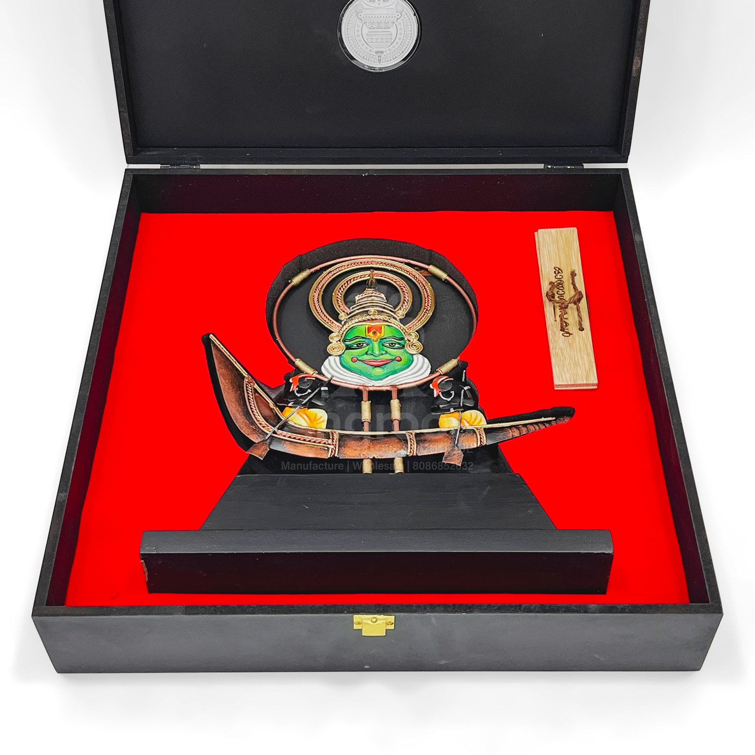 This Kathakali Face Gift Box is a stunning tribute to Kerala’s rich cultural heritage, featuring a finely crafted metal Kathakali face memento that captures the vibrant artistry of the state’s iconic dance form. Paired with a traditional Ezhuthola scroll and a wooden kathakali box