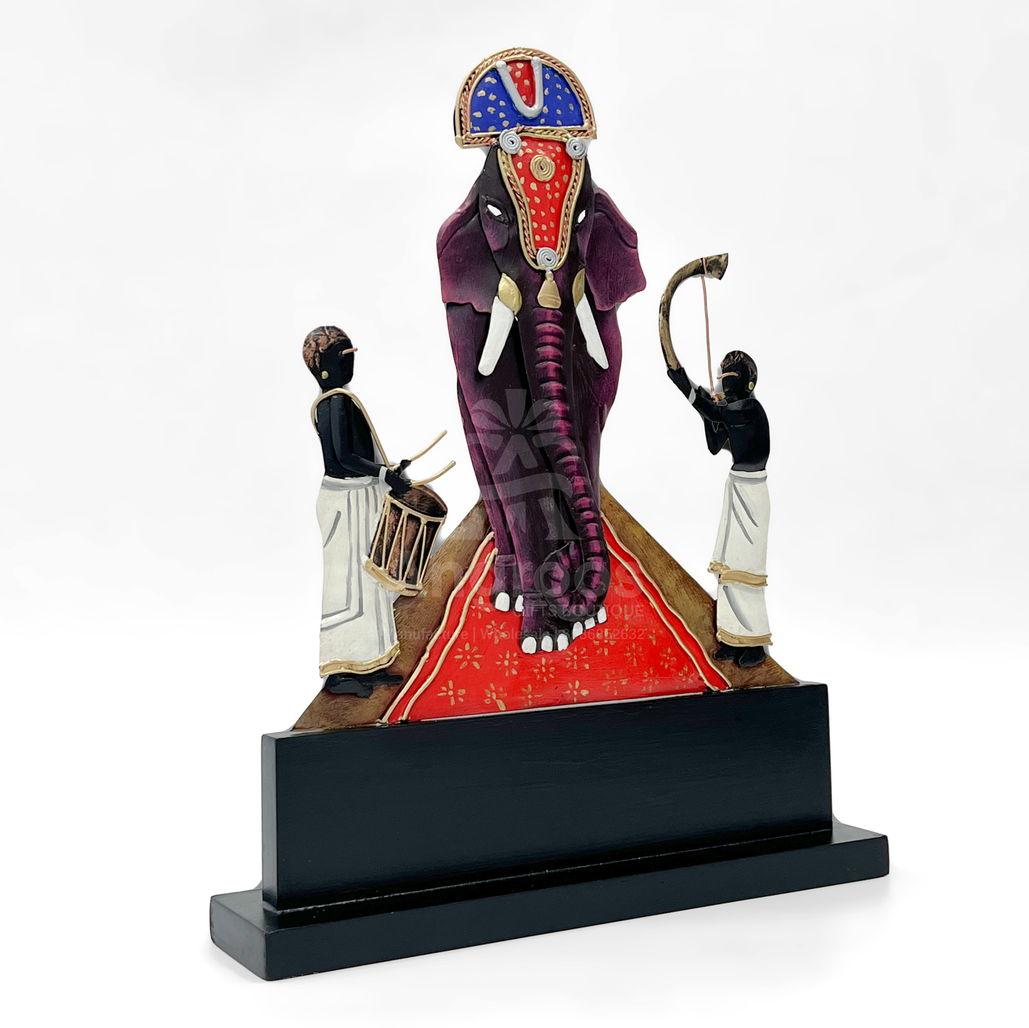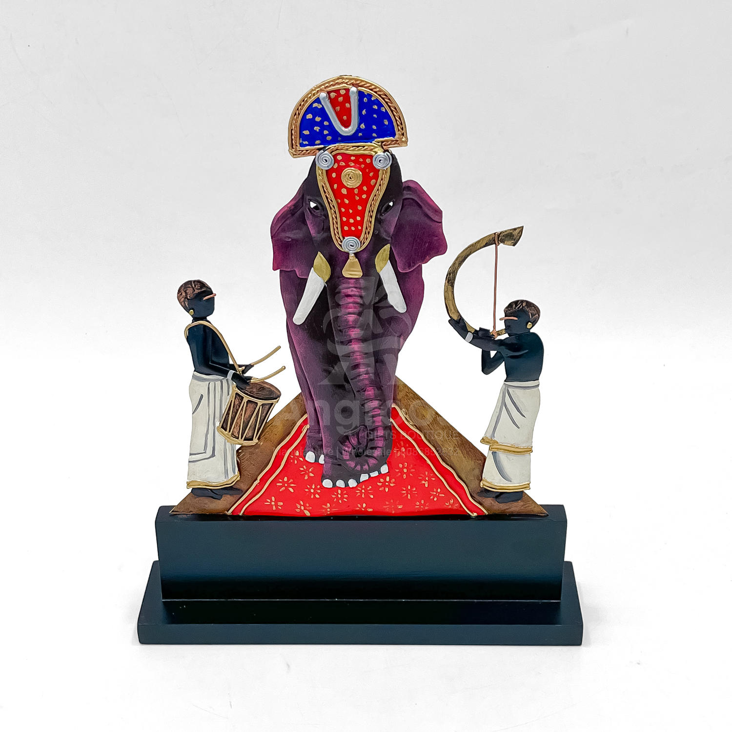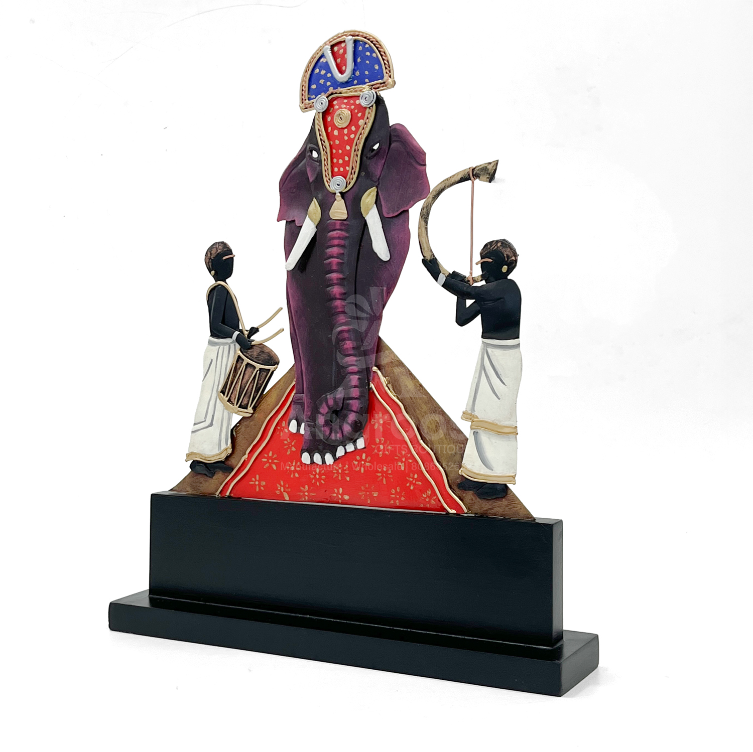 Celebrate the majestic charm of Kerala’s temple festivals with this beautifully handcrafted elephant procession decor. Featuring a richly adorned caparisoned elephant accompanied by a traditional Chenda drummer and Kombu horn player, this piece captures the vibrant essence of Kerala’s cultural heritage. Made with intricate detailing and premium craftsmanship, it makes a perfect addition to home décor, corporate gifting, or festive displays during Onam and other cultural celebrations. Its vivid colors and traditional artistry make it a timeless keepsake for those who cherish India’s rich traditions.