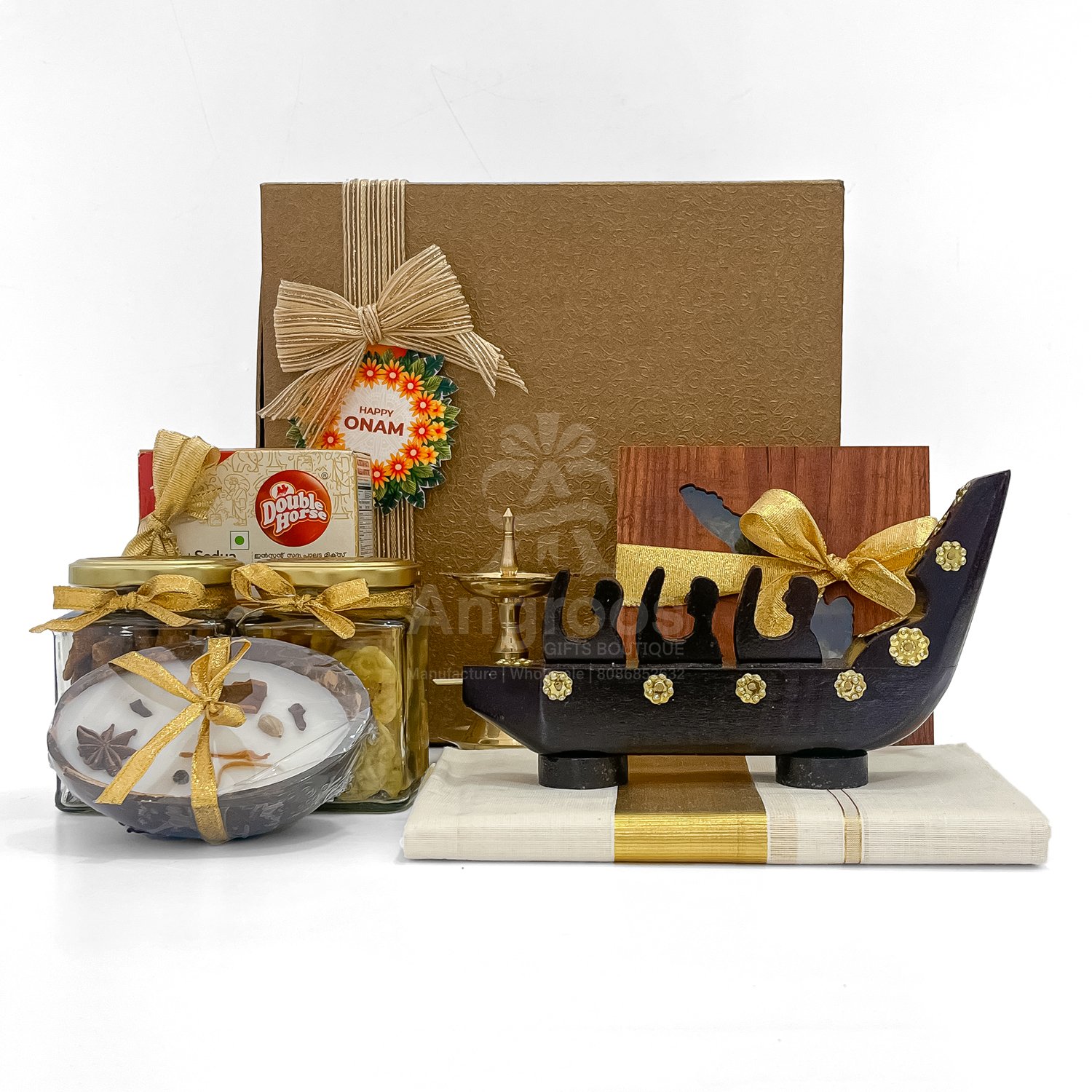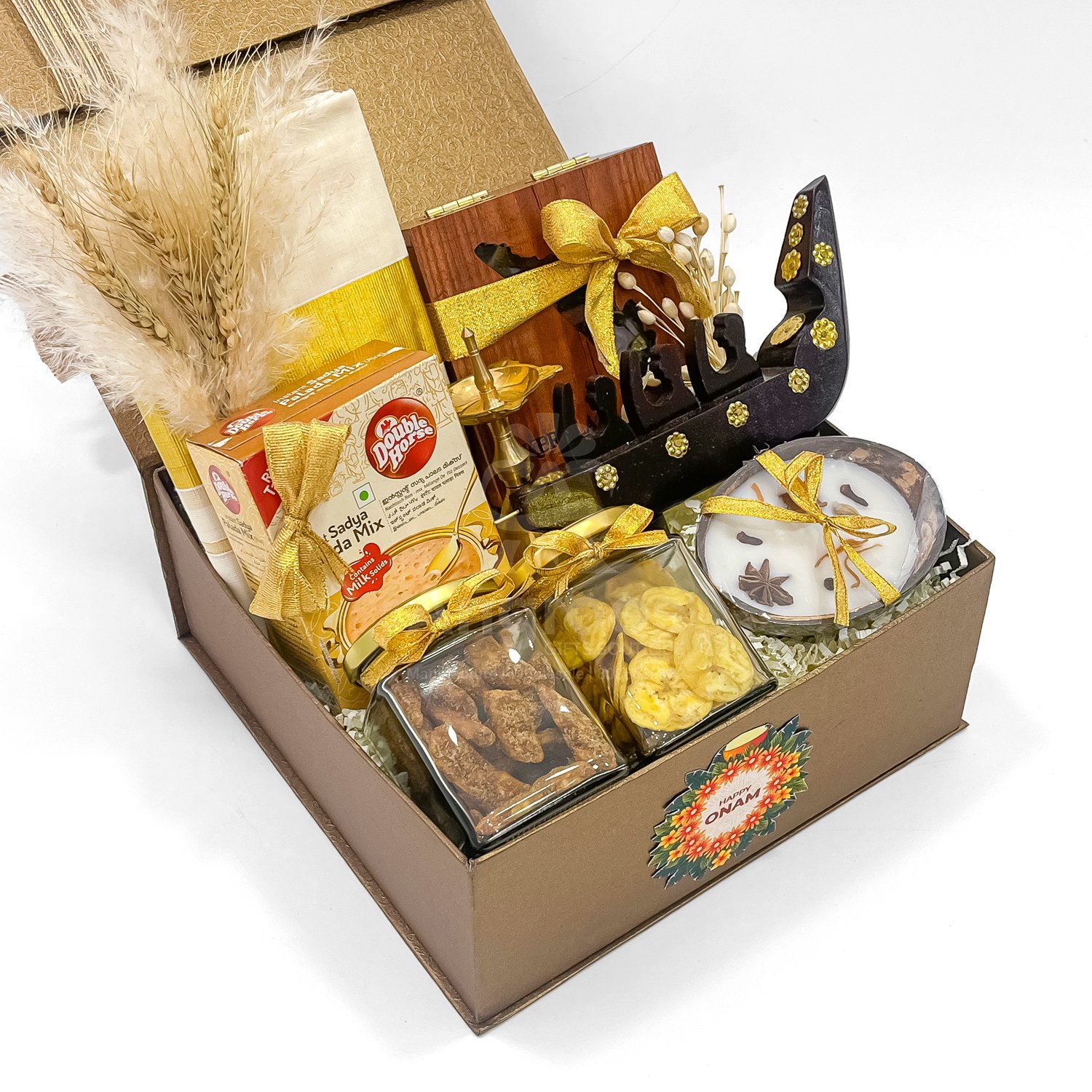 The hamper also contains crispy banana chips, sweet jaggery chips, and a comforting Palada mix—staples of any Kerala celebration. The addition of a handmade 3-men Vallam Kali boat and a fragrant spice candle gives it a cultural touch that resonates with the Onam spirit. Whether for family, friends, or corporate clients, this hamper is an ideal gift choice for any Kerala festival, embodying both sentiment and sophistication.