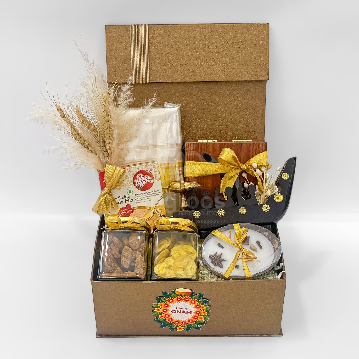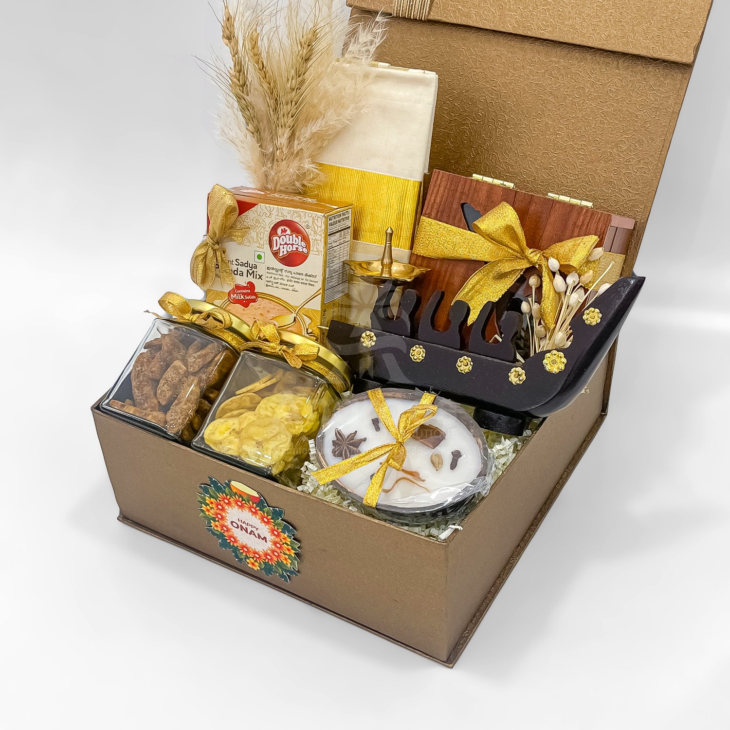 Celebrate Kerala’s vibrant festivals with this thoughtfully curated gift hamper featuring a Kerala saree, traditional snacks, brass décor, and a wooden spice box—all packed in a festive golden box.