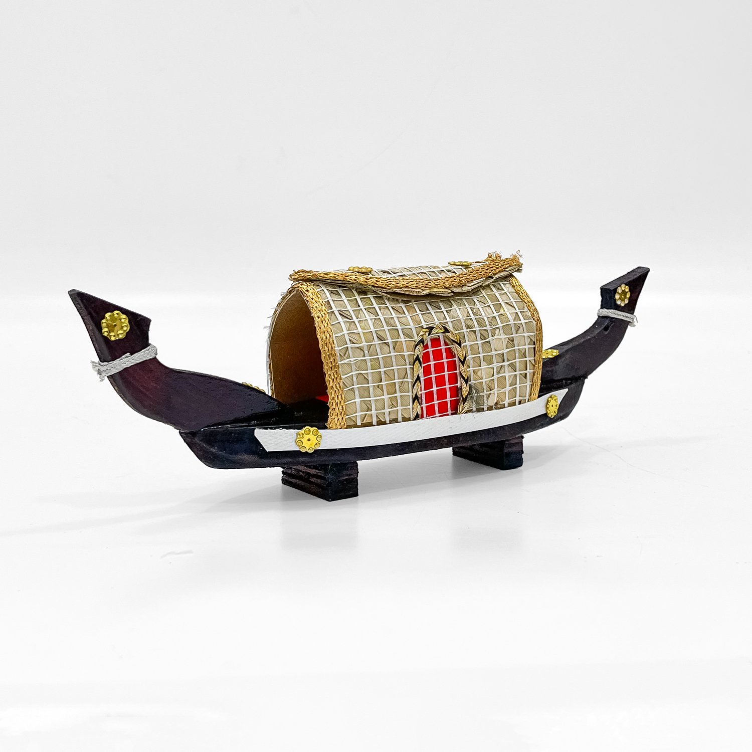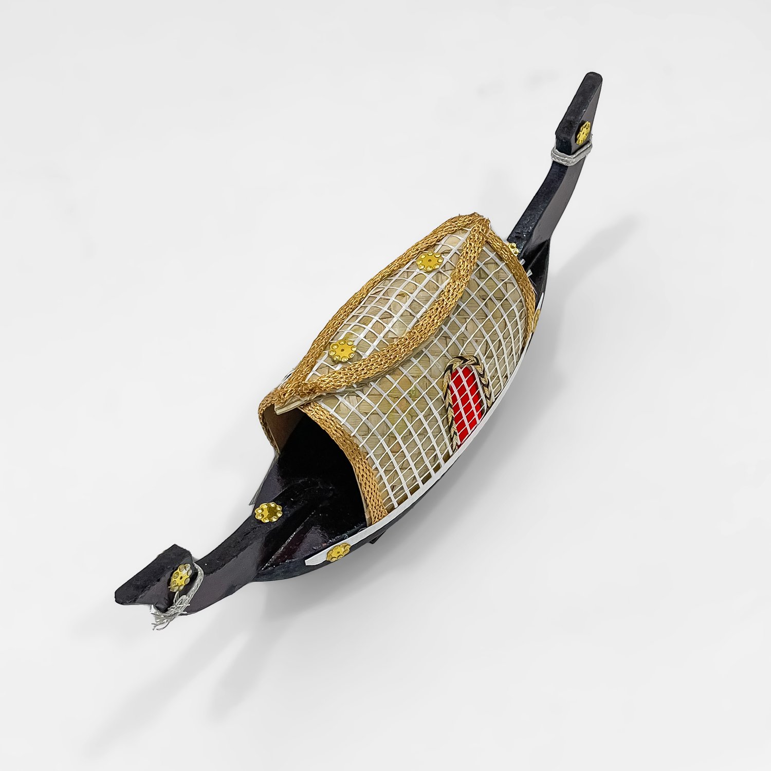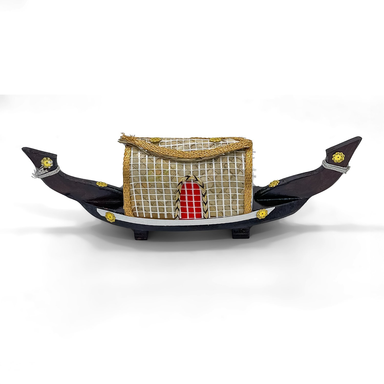 Bring home the peaceful essence of Kerala’s backwaters with this handcrafted Kerala houseboat miniature, beautifully replicating the traditional Kettuvallam in stunning detail. Adorned with intricate cane-style roofing, a symbolic red entryway, and a classic wooden hull with gold embellishments, this showpiece stands 4 inches tall and stretches 12 inches long. Weighing just 167g, it’s ideal for desks, shelf decor, souvenirs, or cultural gifting. A timeless symbol of Kerala’s serene lifestyle and craftsmanship, this houseboat model makes a thoughtful gift or centerpiece for events with a South Indian theme.
