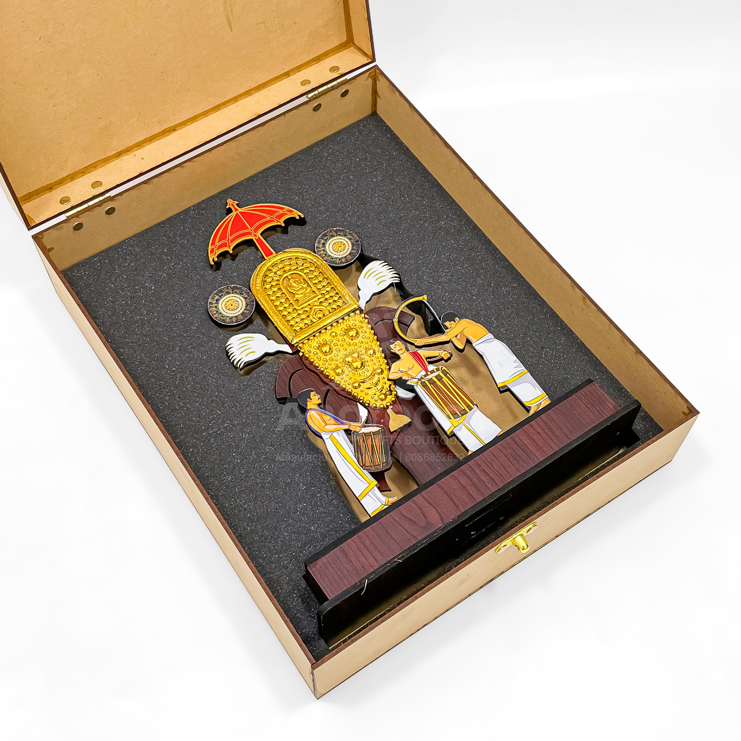 Celebrate the vibrant heritage of Kerala with this exquisite Kerala Nettipattam cultural gift. Featuring a finely detailed golden elephant caparison (Nettipattam) under a striking red ceremonial umbrella, flanked by skilled Chenda drummers, this handcrafted showpiece brings the essence of Kerala’s Pooram festival into your home or office. The meticulous craftsmanship highlights the intricate patterns of the Nettipattam and the authentic attire of the percussionists. Secured in a premium gift box with protective foam, this piece combines elegance with cultural significance.