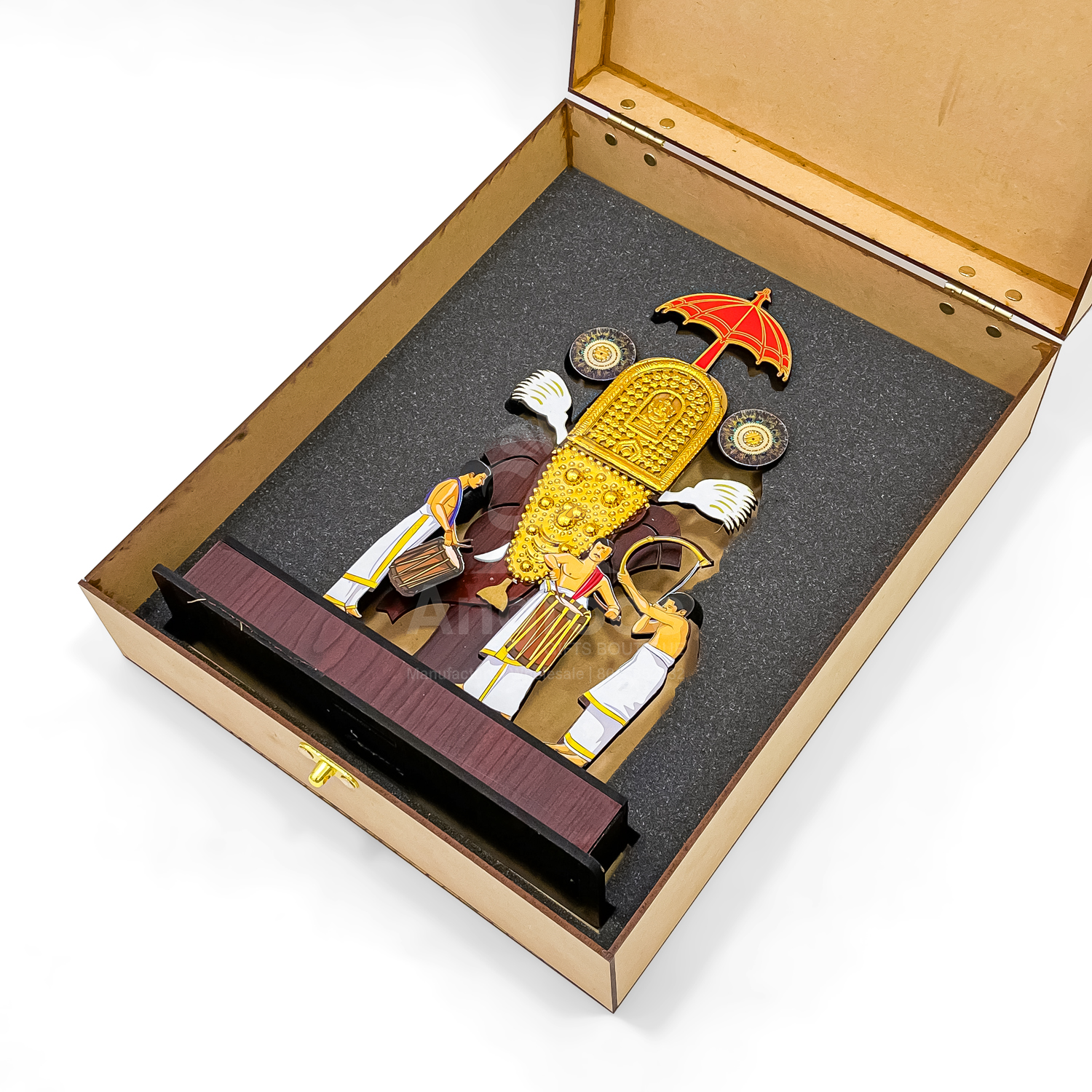 This Kerala Nettipattam cultural gift captures the grandeur of Kerala’s temple festivals with a golden elephant caparison, ceremonial umbrella, and Chenda drummers. Perfectly presented in a premium wooden gift box, it’s an ideal choice for cultural décor, festive gifting, and corporate souvenirs.