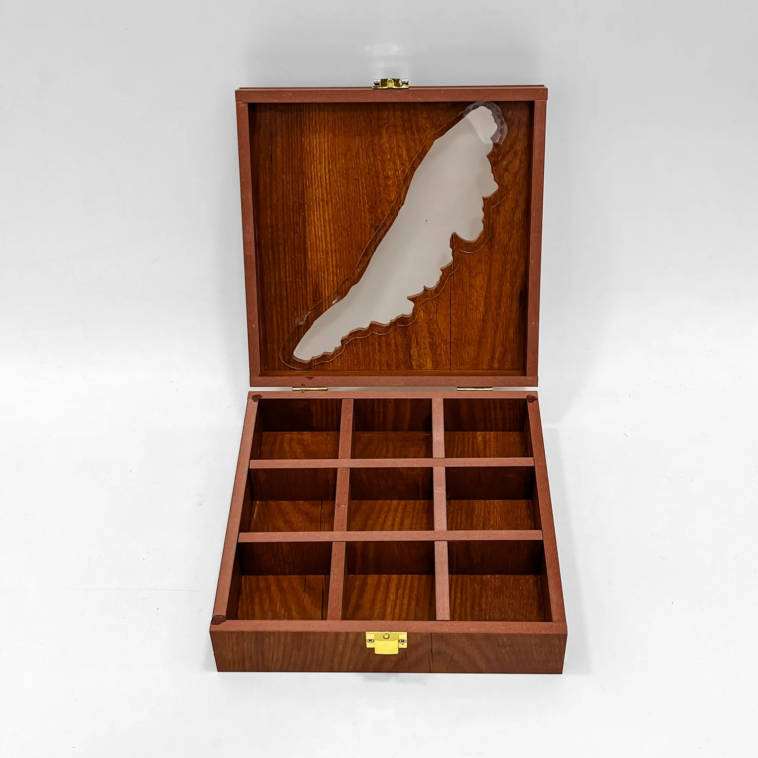 This Kerala map resin art spice box combines functionality with cultural elegance. Handcrafted from premium wood, it features a glossy resin inlay and brass detailing, making it an ideal gift or souvenir.