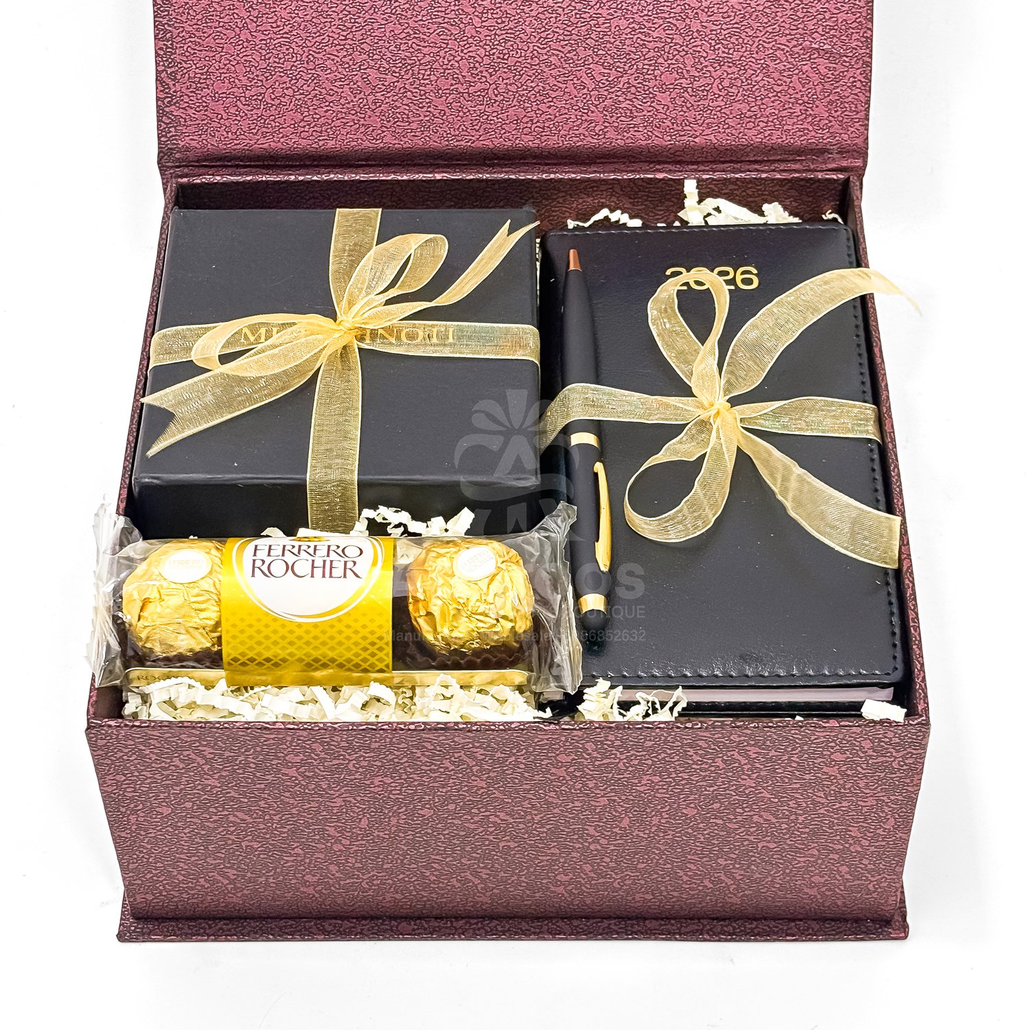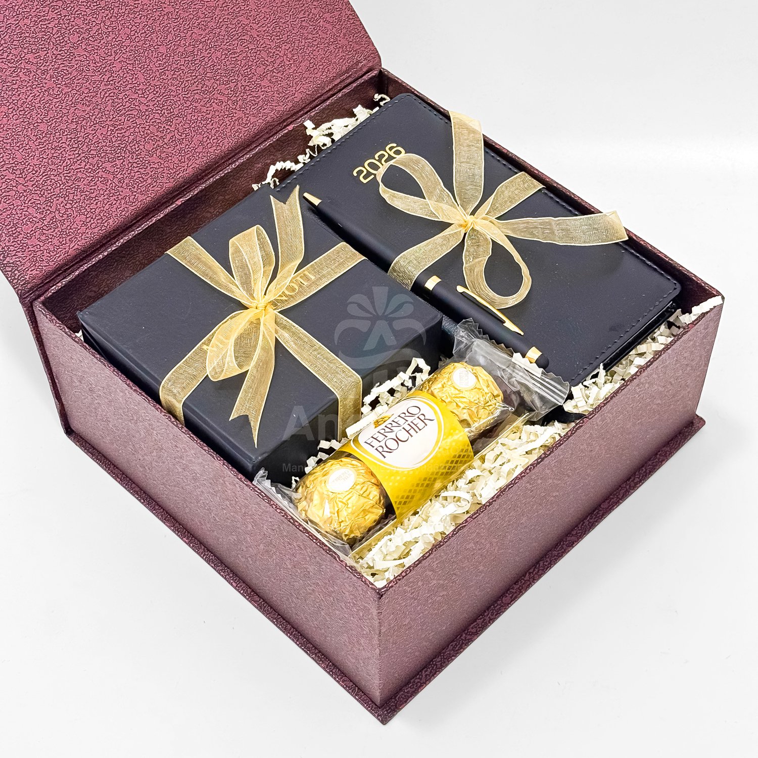 A sleek 2026 premium diary paired with a matching pen offers the perfect combination of productivity and style, making it an essential companion for the new year ahead. The addition of Ferrero Rocher chocolates adds a touch of sweetness to this thoughtful gifting experience.
