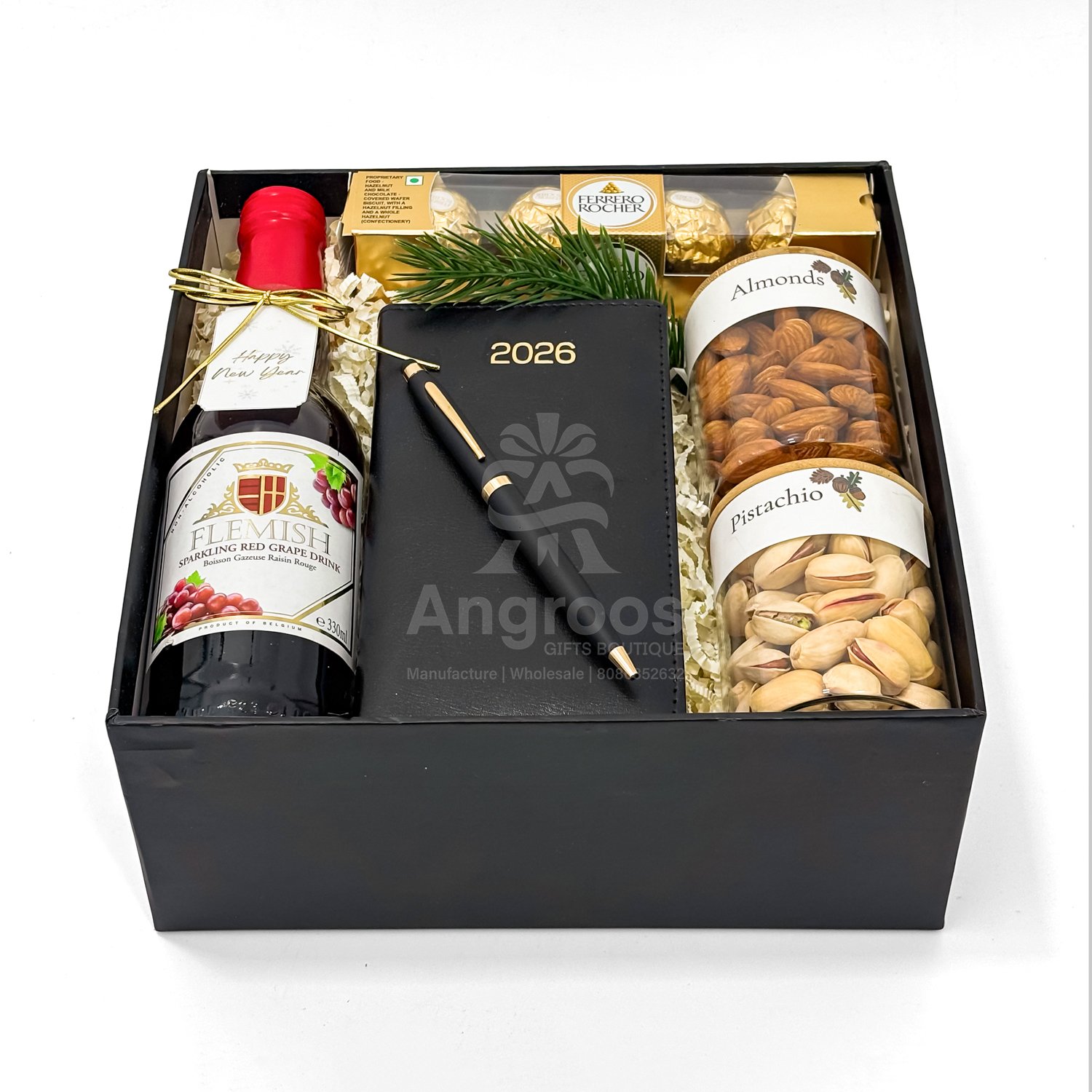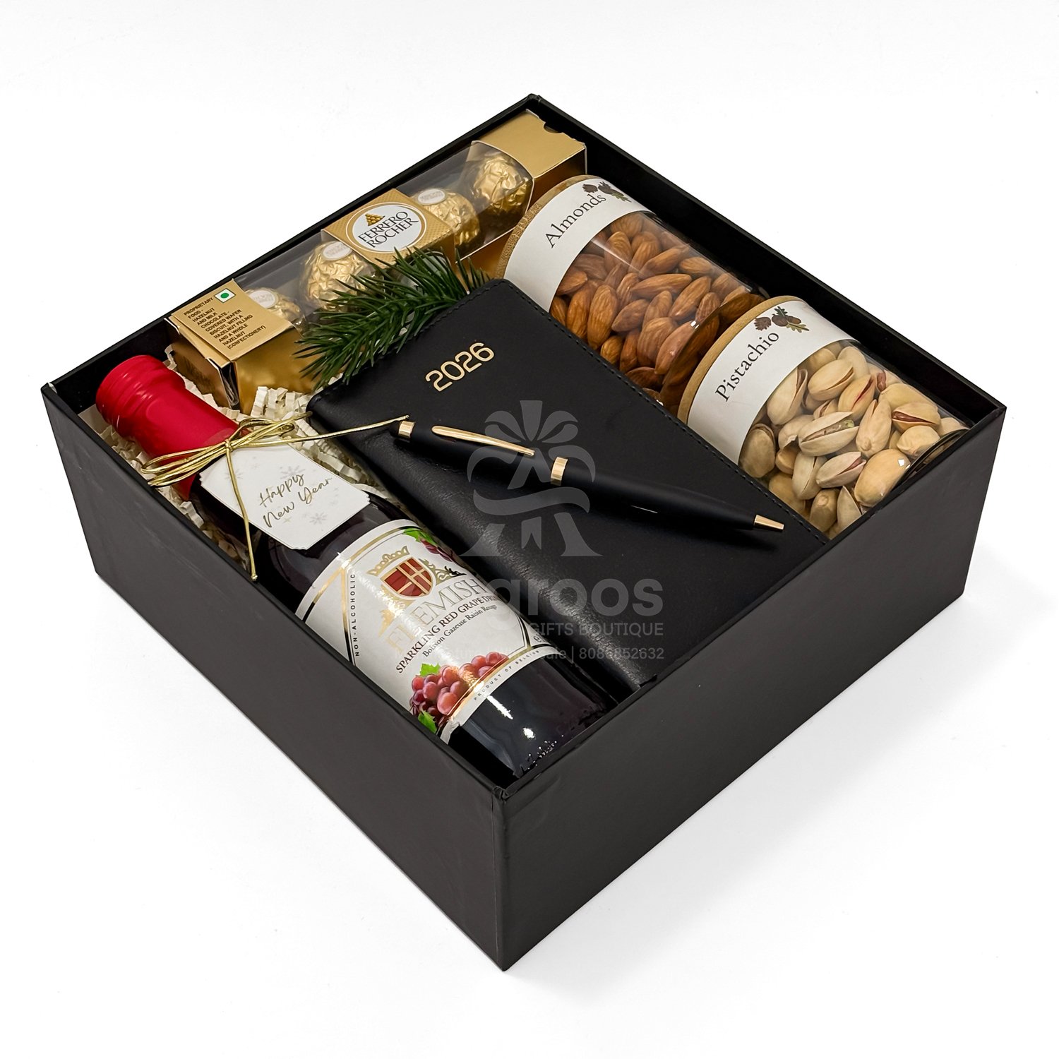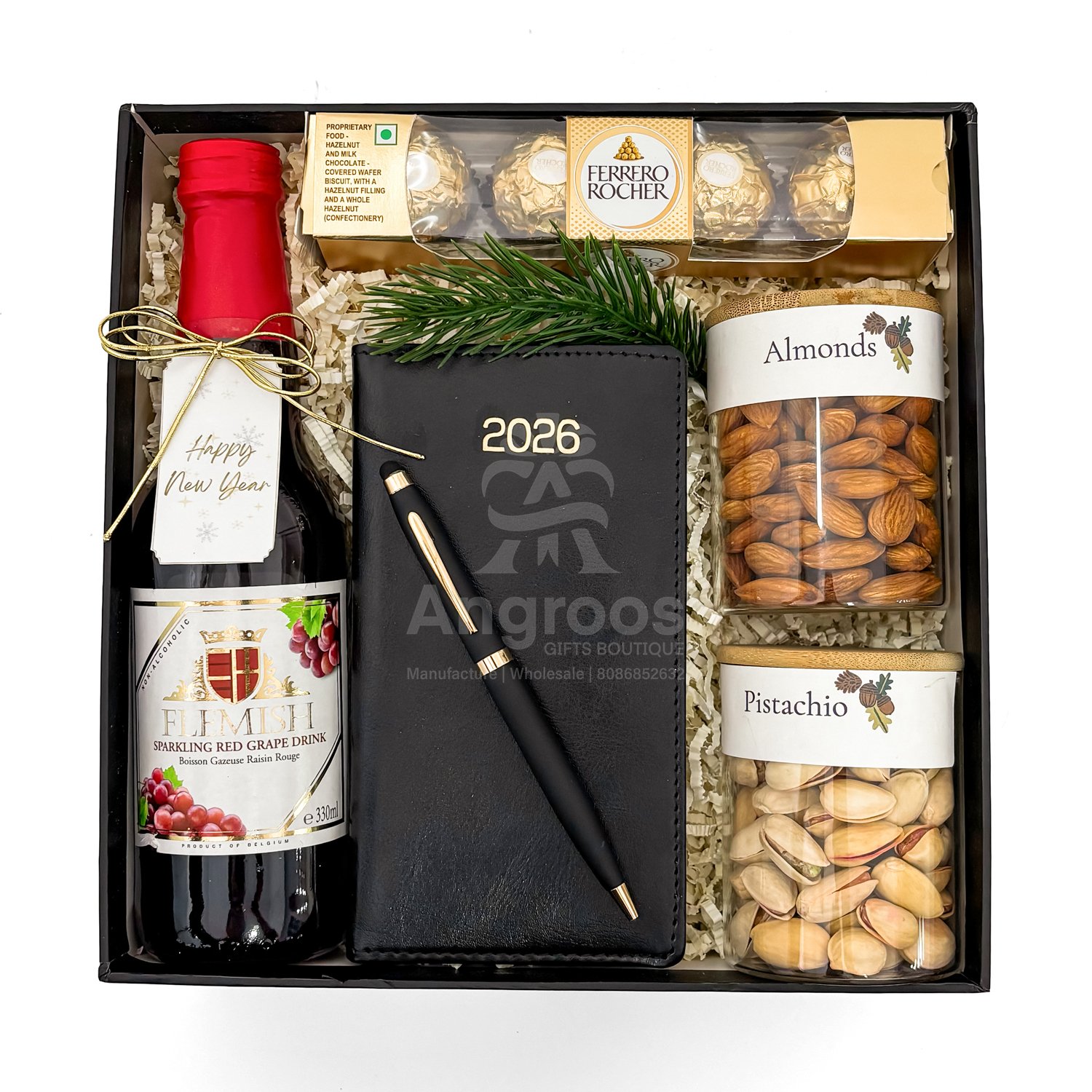 Alongside it sits a Flemish sparkling red grape drink, a non-alcoholic celebratory beverage that adds a touch of sophistication without compromising corporate suitability. The hamper also includes a Ferrero Rocher 4-piece pack for a sweet indulgence, while premium almonds and pistachios packed in elegant transparent jars bring a healthy and classy gifting element. Finished with festive greenery and ribbon décor, the presentation looks premium and ready for direct gifting. This New Year gift box is ideal for corporate celebrations, employee appreciation, client gifting, executive gifting, and business festive hampers, making it a complete and meaningful gifting solution for the season.