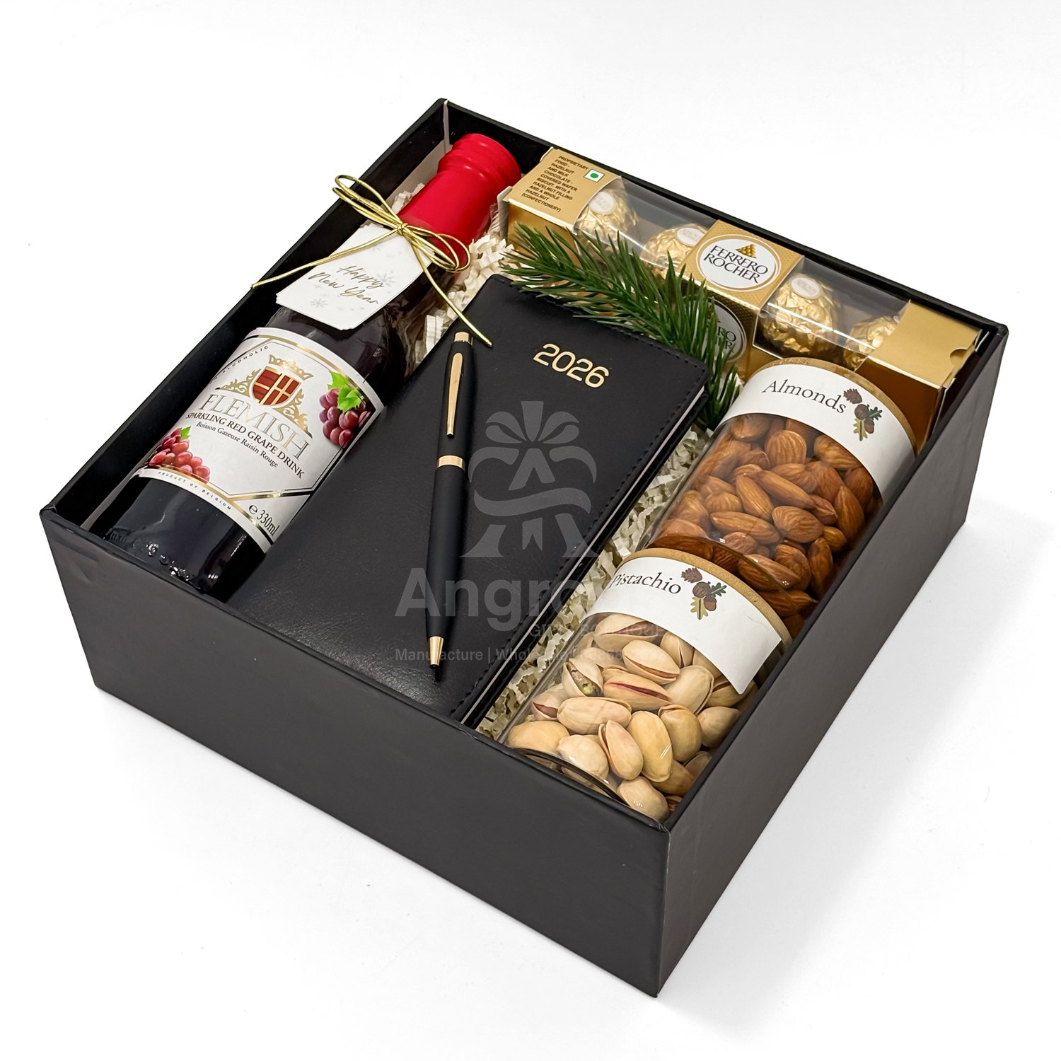A sophisticated New Year corporate gift box featuring a 2026 diary with pen, sparkling red grape drink, Ferrero Rocher chocolates, premium almonds, pistachios, and elegant festive packaging. Ideal for employee gifting, client appreciation, and premium business hampers.