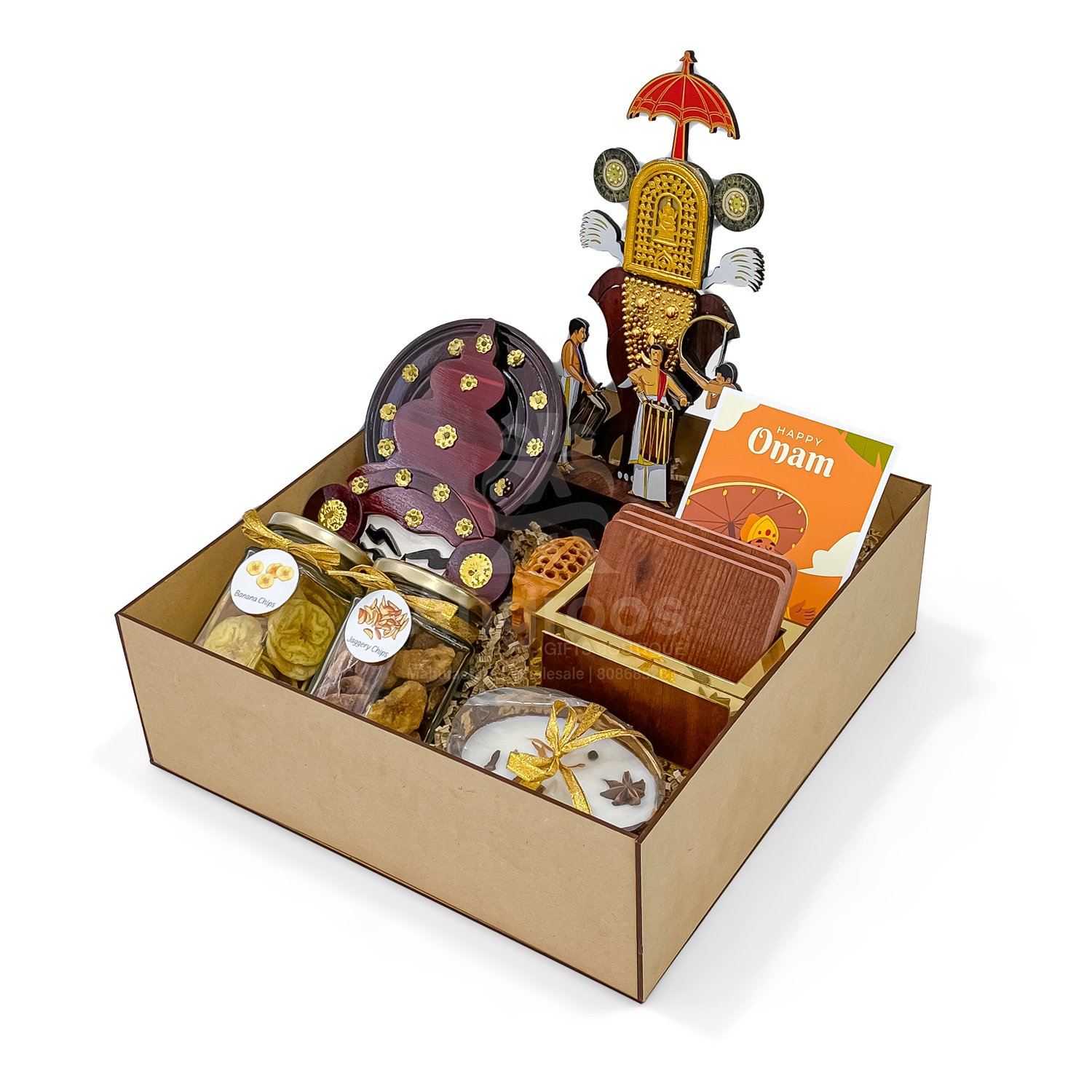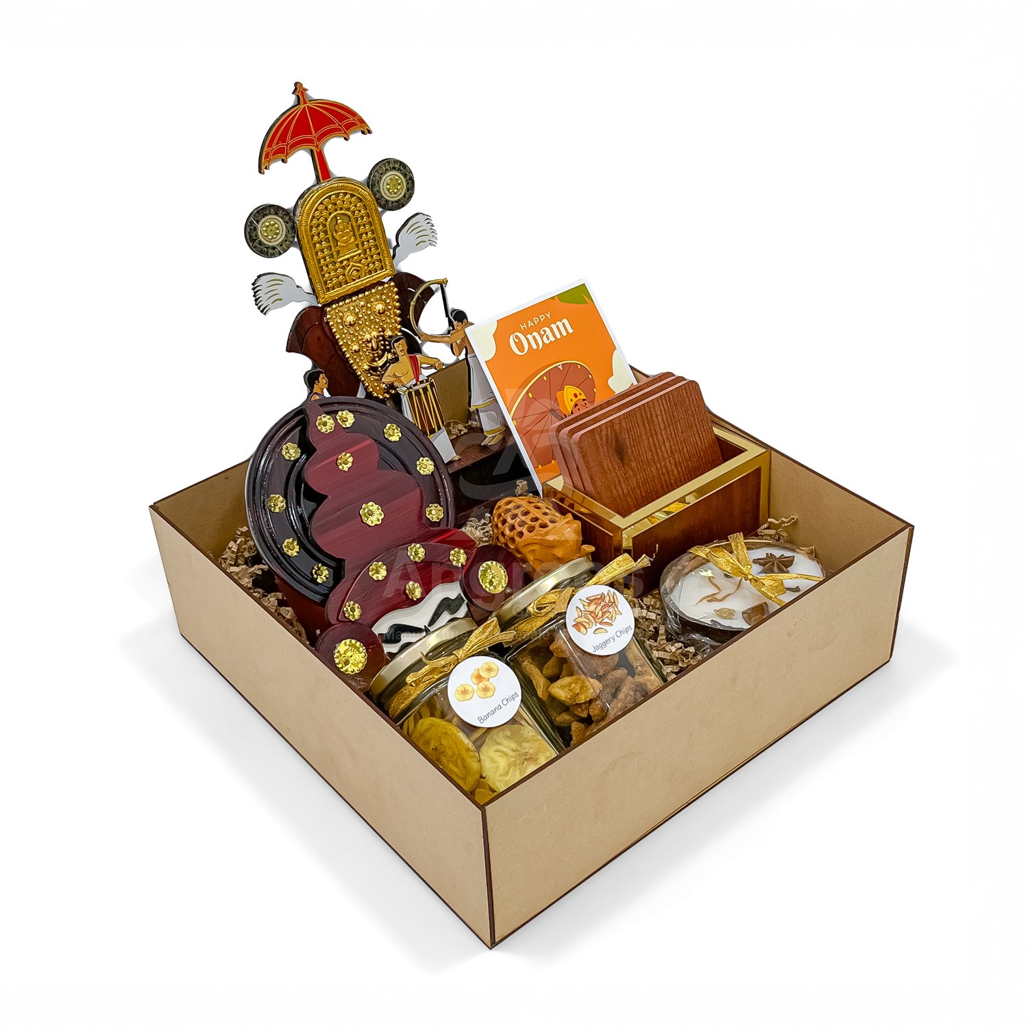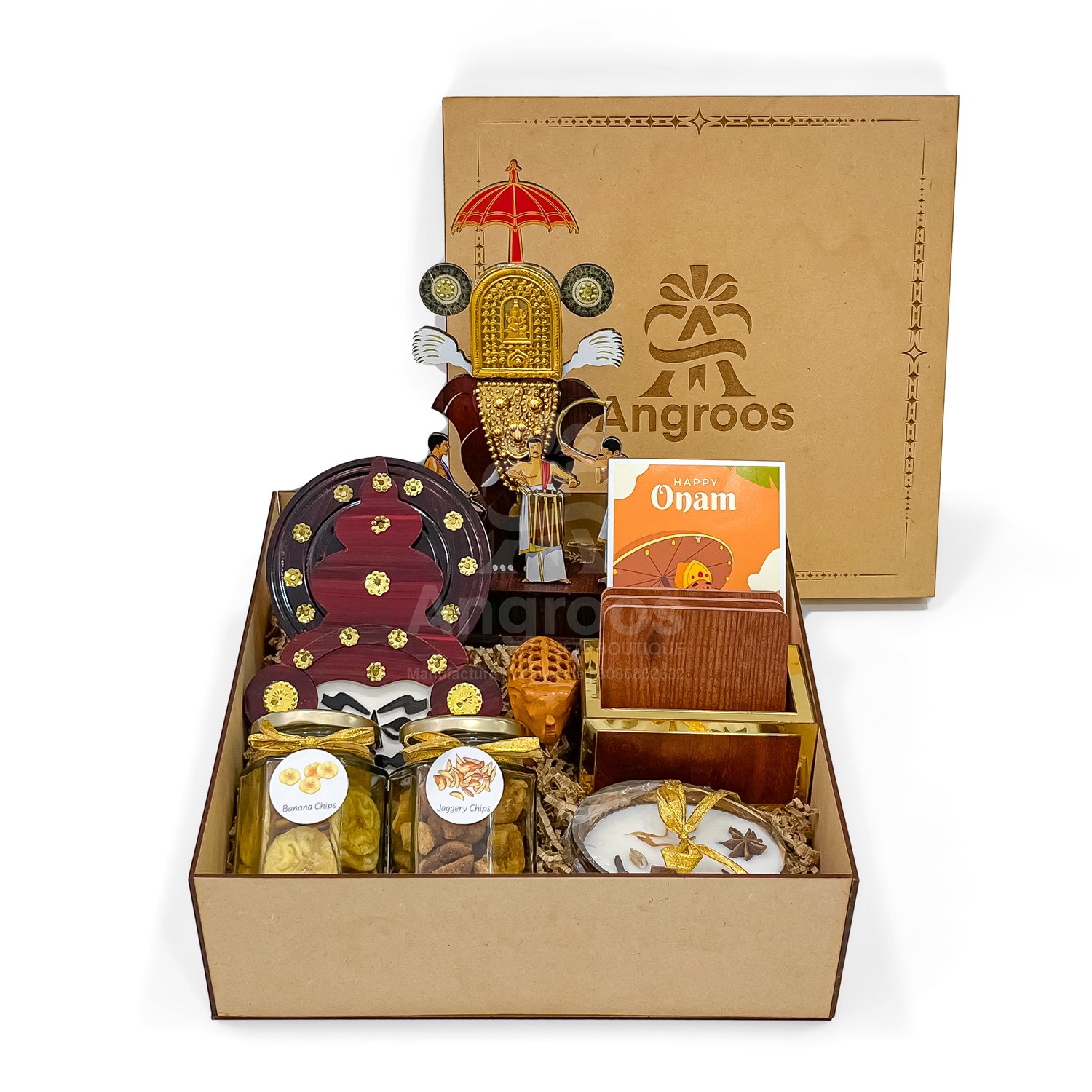 This Onam Cultural Gift Box is a delightful celebration of Kerala’s heritage, perfect for gifting during the festive season. Housed in a sturdy MDF box, this elegant hamper is filled with handpicked elements that symbolize the cultural vibrancy of Onam. It includes a striking Pooram memento showcasing the grandeur of Kerala’s traditional elephant festival, along with a handcrafted Kathakali head that brings the spirit of classical dance to life. The box also features a beautifully finished wooden coaster, a mini carved elephant statue, and a uniquely scented spices candle for an aromatic touch. Authentic Kerala snacks—banana chips and jaggery chips—add a local flavor to this gift, while a festive Onam card completes the box with warm wishes. With its premium packaging, 2.2 kg weight, and 11.5-inch dimensions, this Onam Cultural Gift Box makes for a meaningful and luxurious present, ideal for loved ones, clients, or anyone who cherishes South Indian traditions.