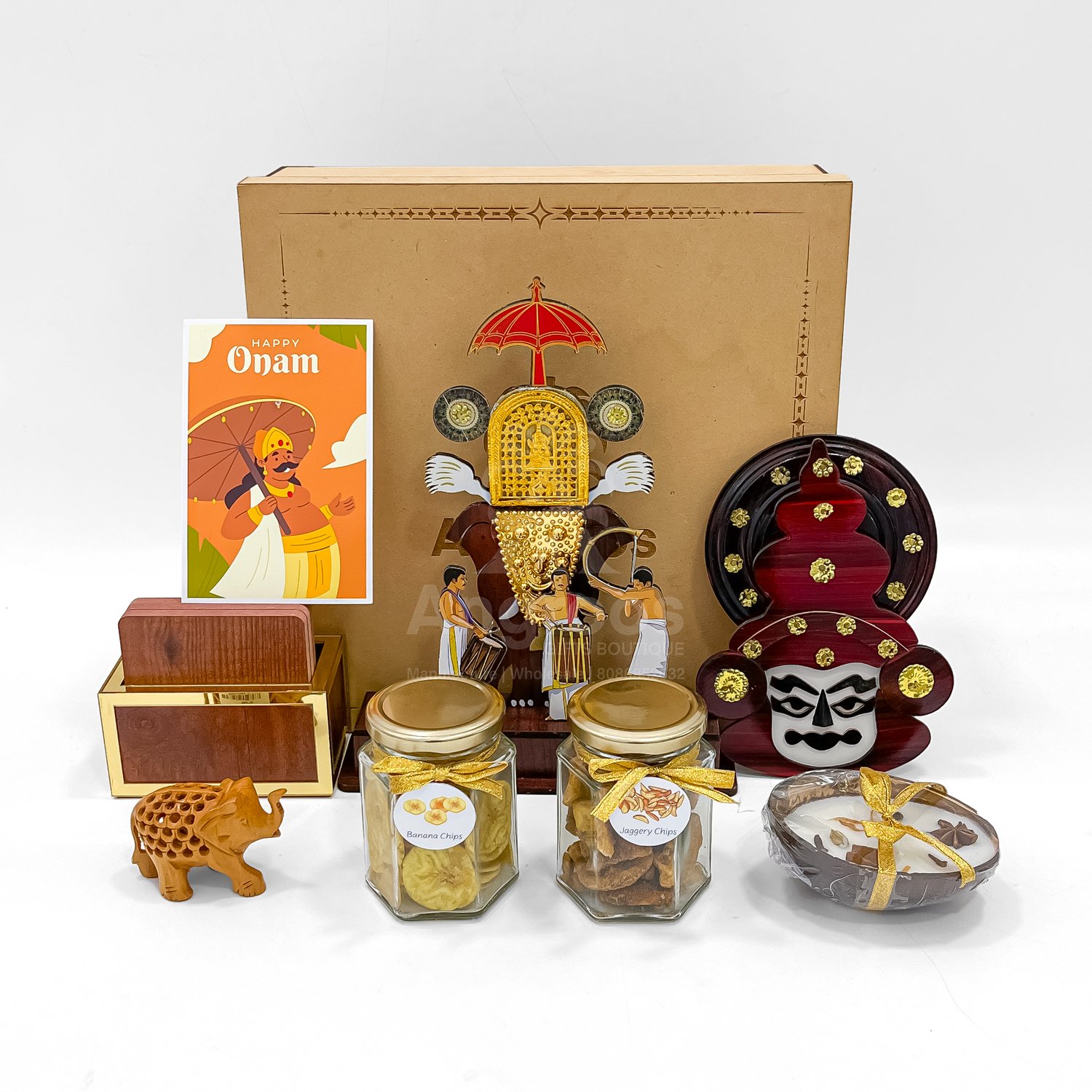 A premium Onam cultural gift box featuring Kerala’s traditional art pieces, Pooram elephant memento, snacks, and vibrant Kathakali-themed decor.