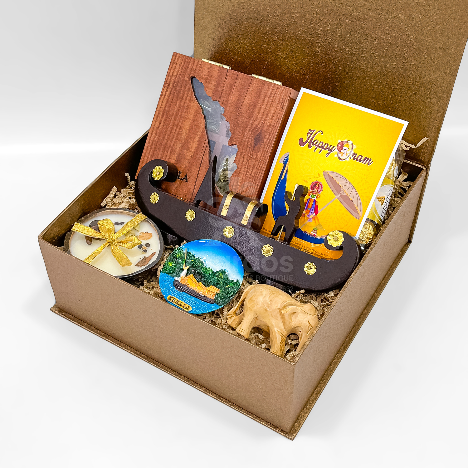 Celebrate the spirit of Onam with this elegant traditional gift box featuring a wooden Kerala boat, handcrafted elephant, spice candle, and fridge magnet in a festive box.