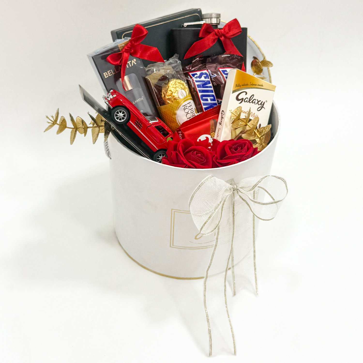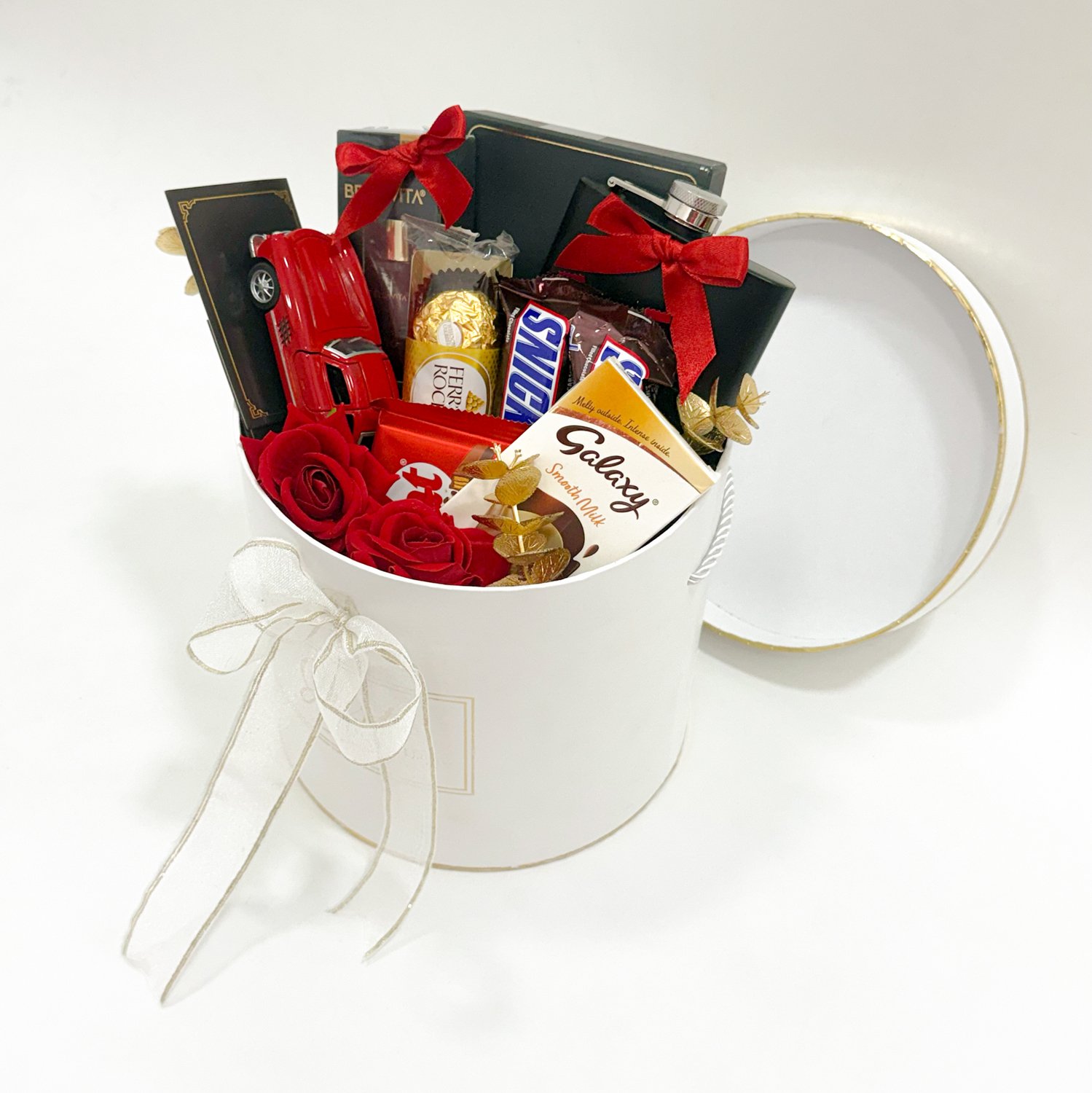 This valentines gift box for men is designed for practical and meaningful gifting. The box includes an Allen Solly wallet, hip flask, mini car model, assorted chocolates such as Snickers, Galaxy, Ferrero, and KitKat, along with decorative elements and a greeting card. All items are carefully arranged inside a sturdy white round box that adds a simple and elegant presentation. Suitable for Valentine’s Day gifting, this box works well for partners who appreciate useful accessories combined with chocolates and small keepsakes.