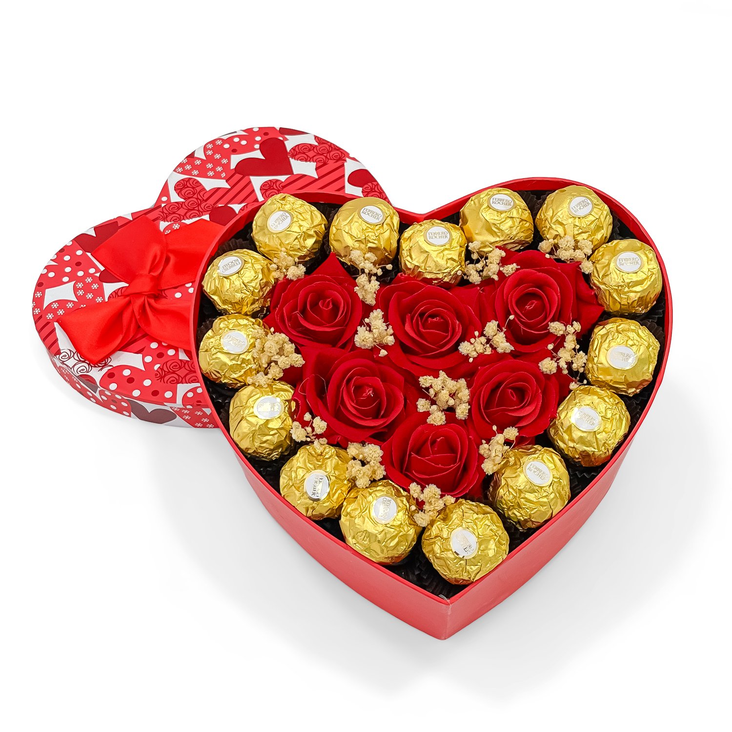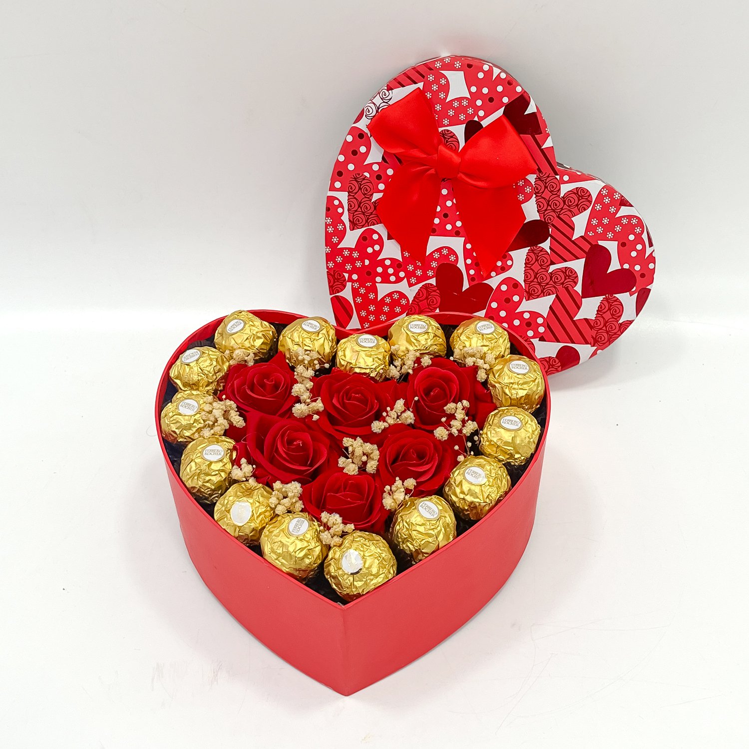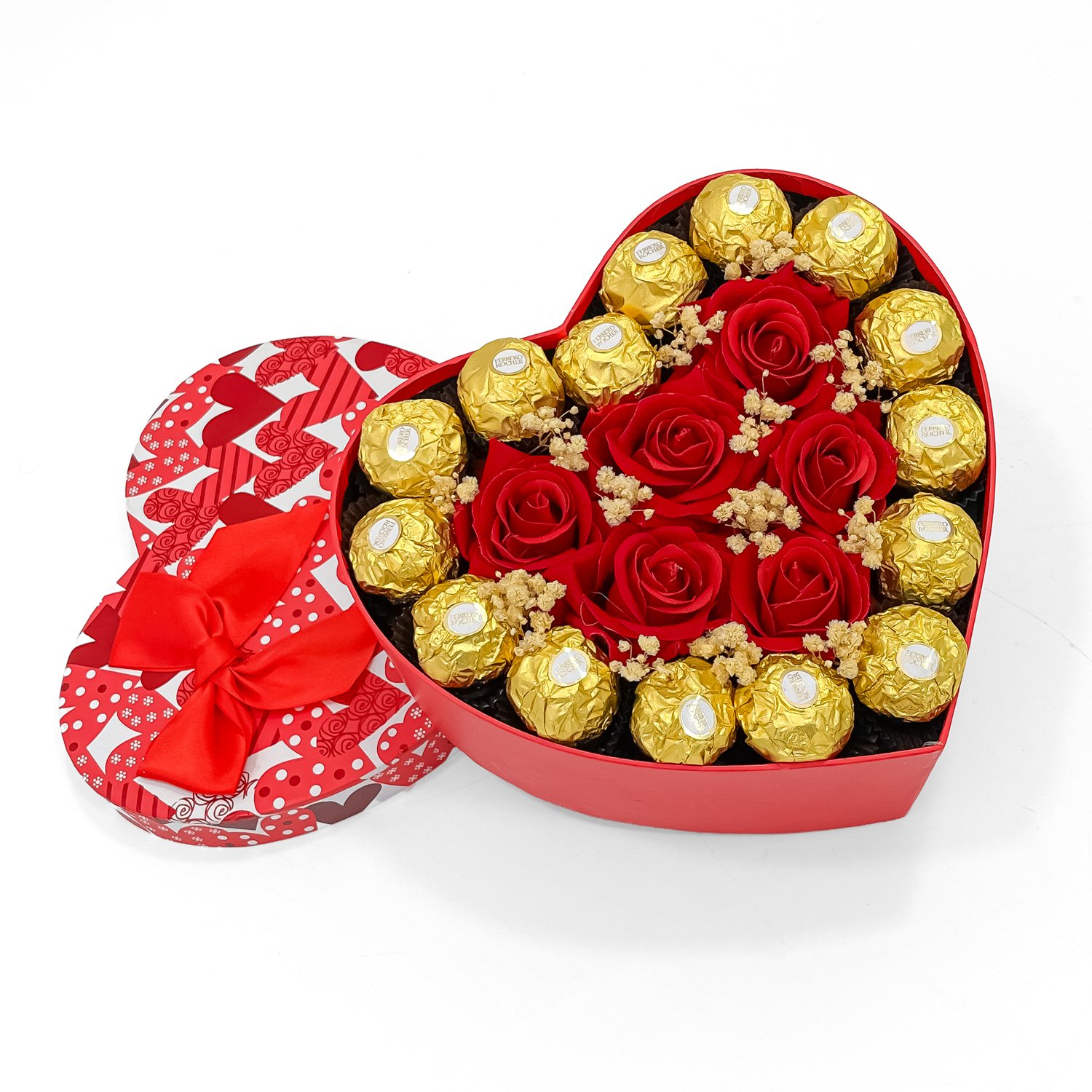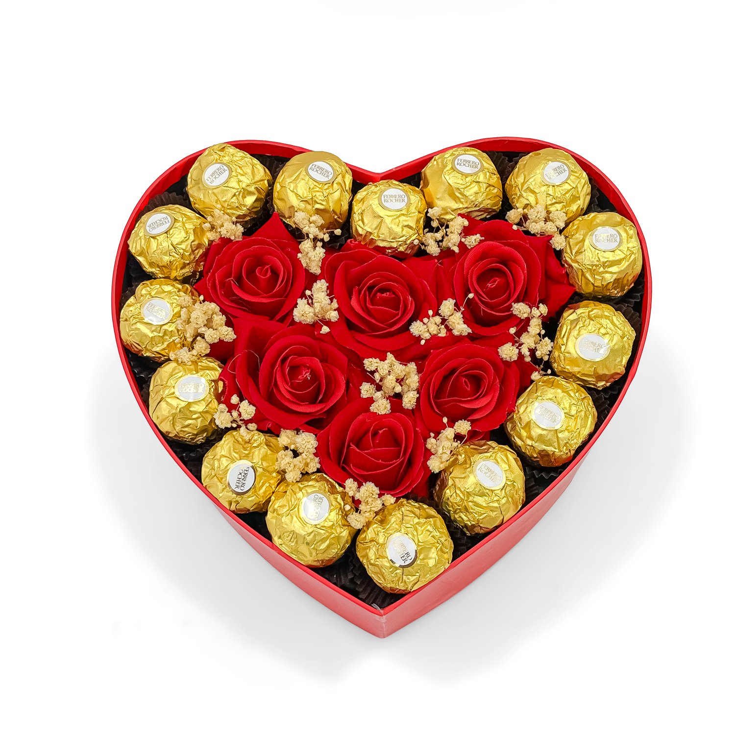 This romantic heart-shaped gift box is the perfect expression of love, featuring 16 Ferrero Rocher chocolates paired with lifelike red roses and golden filler accents. A luxurious and heartfelt gift designed to impress on any special occasion.
