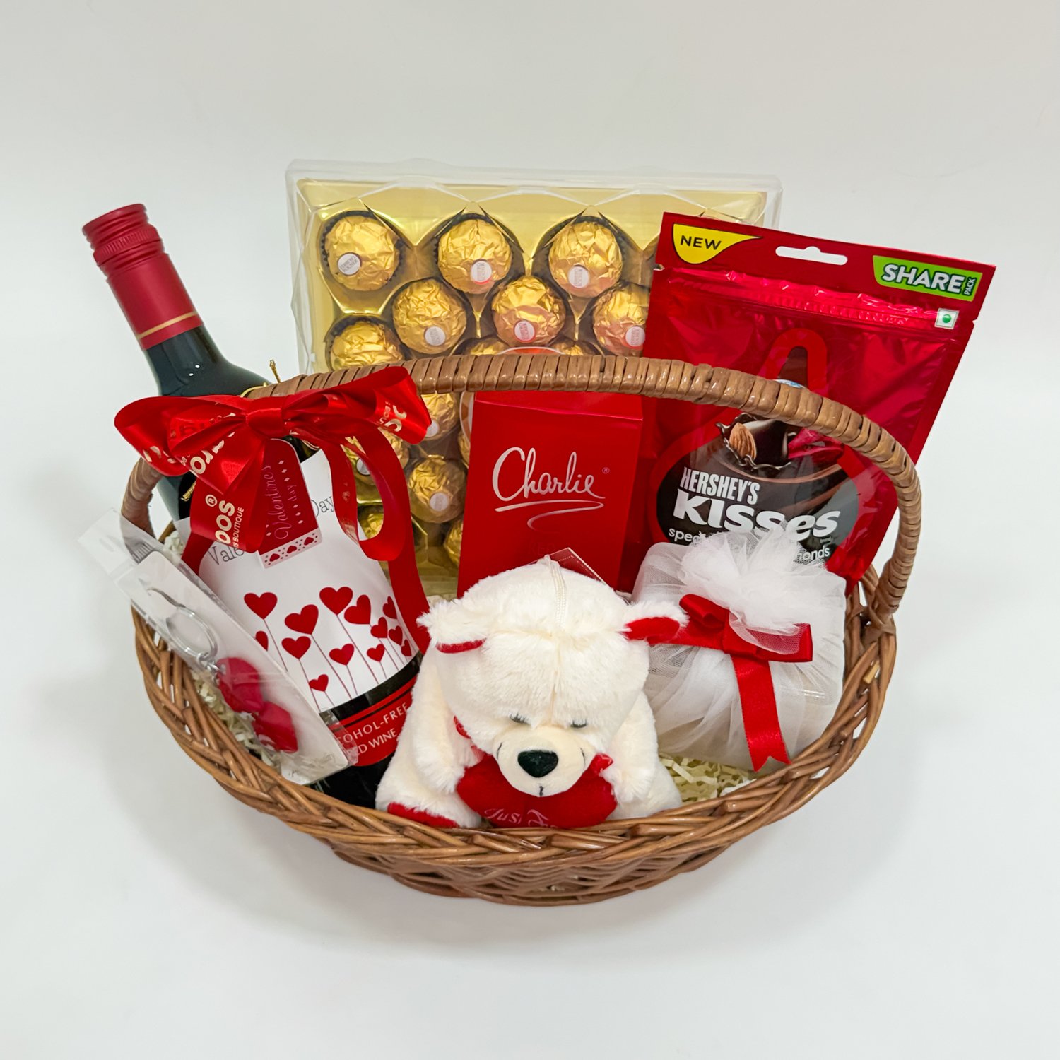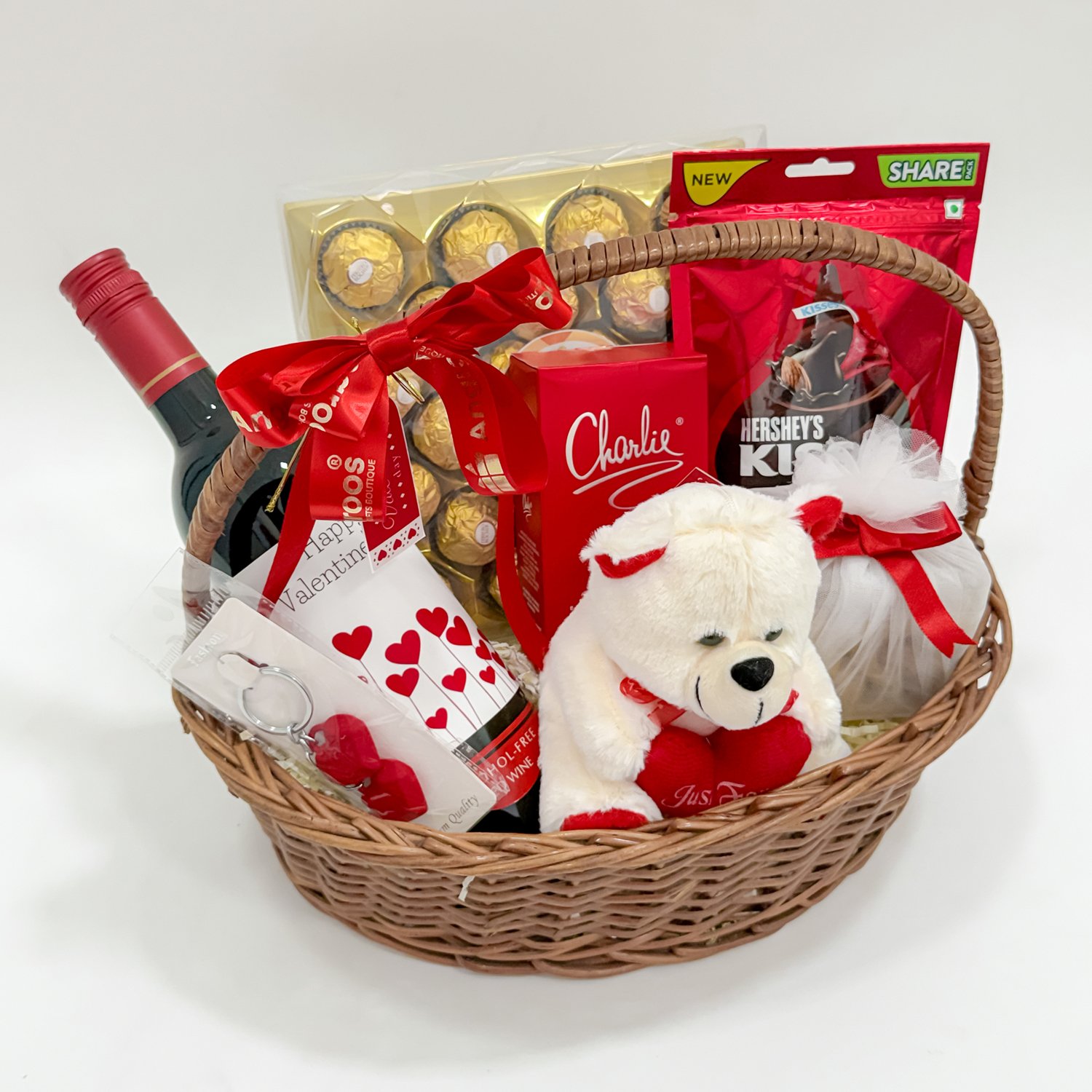 This valentines gift basket is a classic Valentine’s Day gift designed to feel thoughtful and complete. The basket includes a wine bottle, Ferrero Moments chocolates, Kisses chocolates, Charlie perfume, assorted nuts, a soft teddy, and a keychain, along with simple decorative elements. All items are neatly arranged in a strong woven basket, making it a reliable and presentable choice for gifting to your partner on Valentine’s Day.