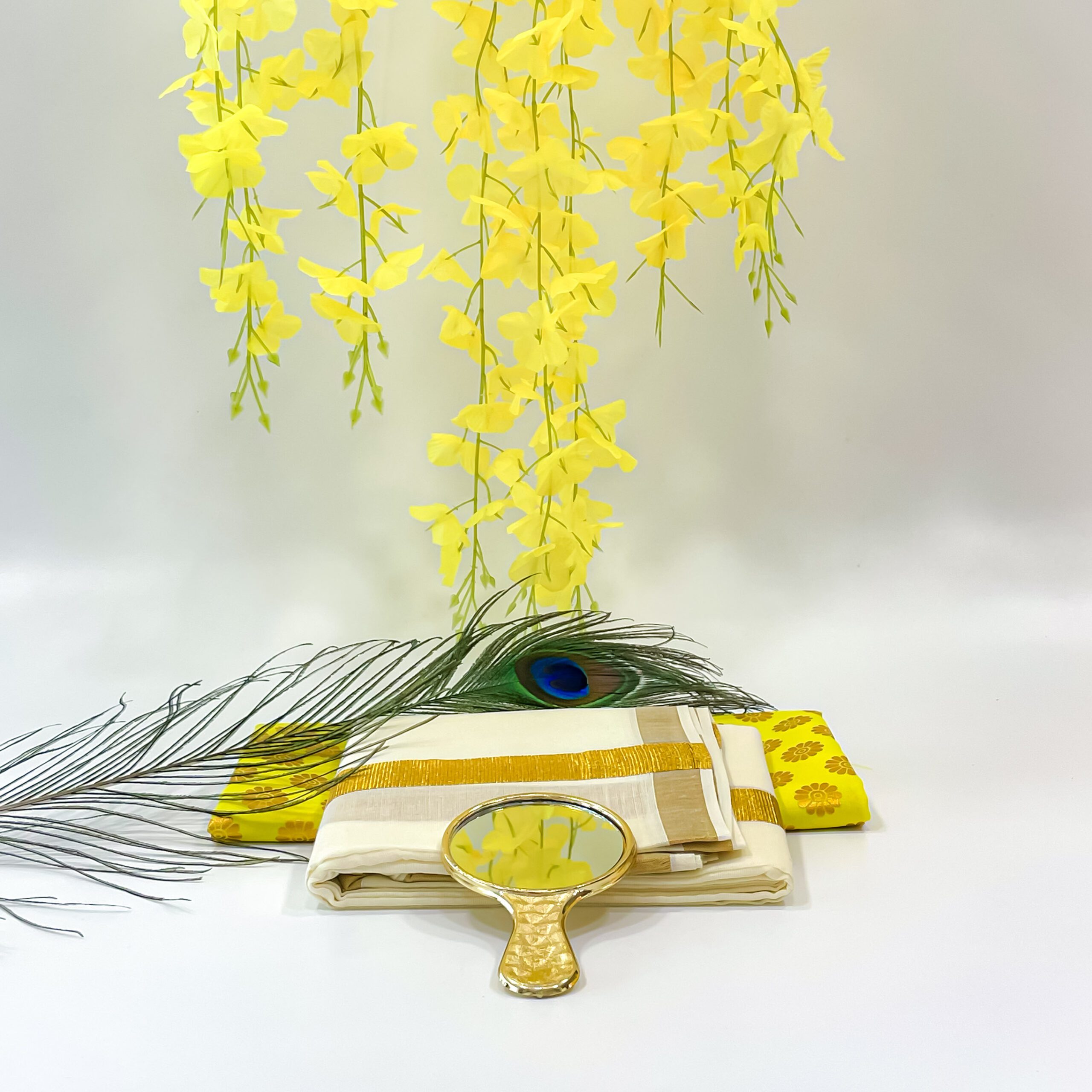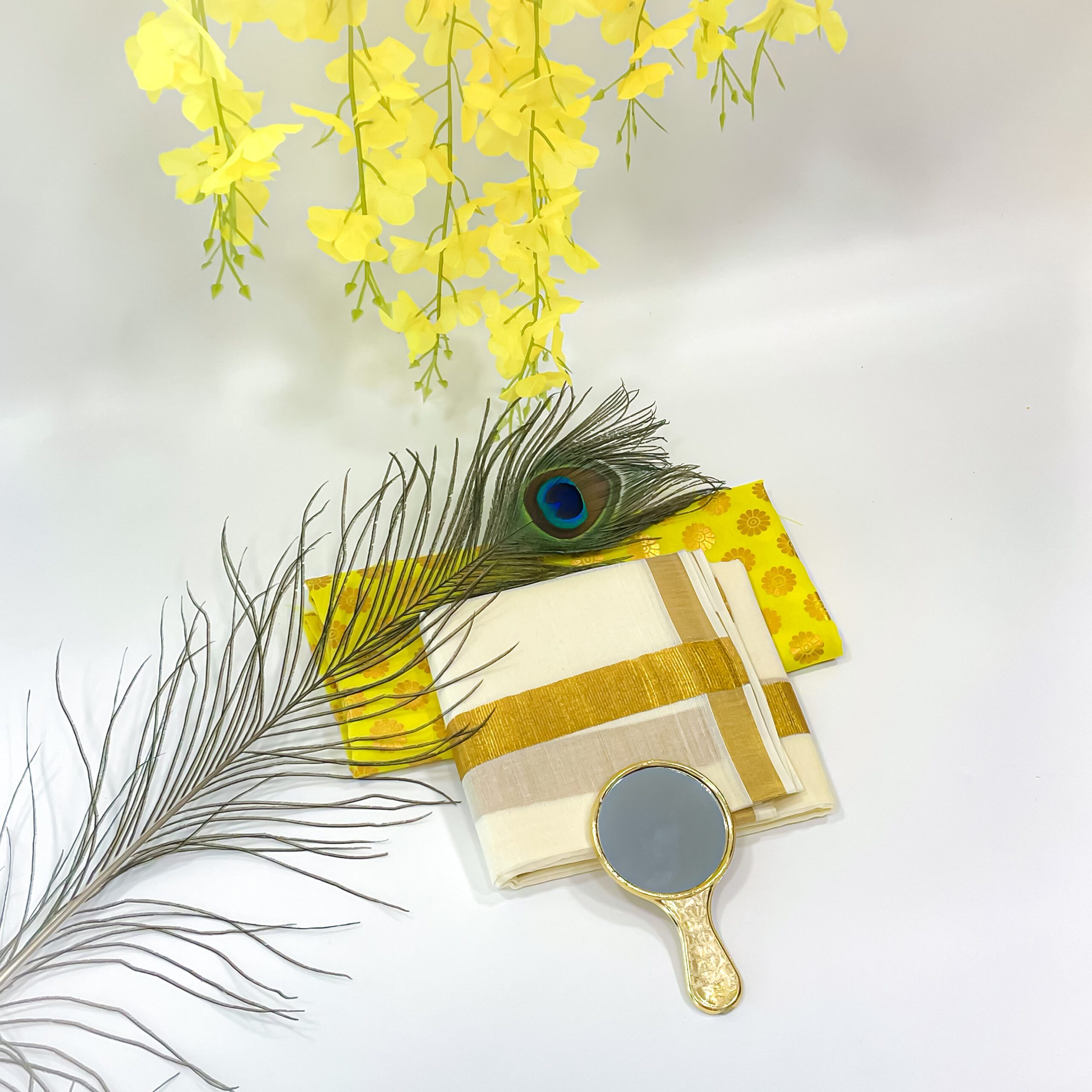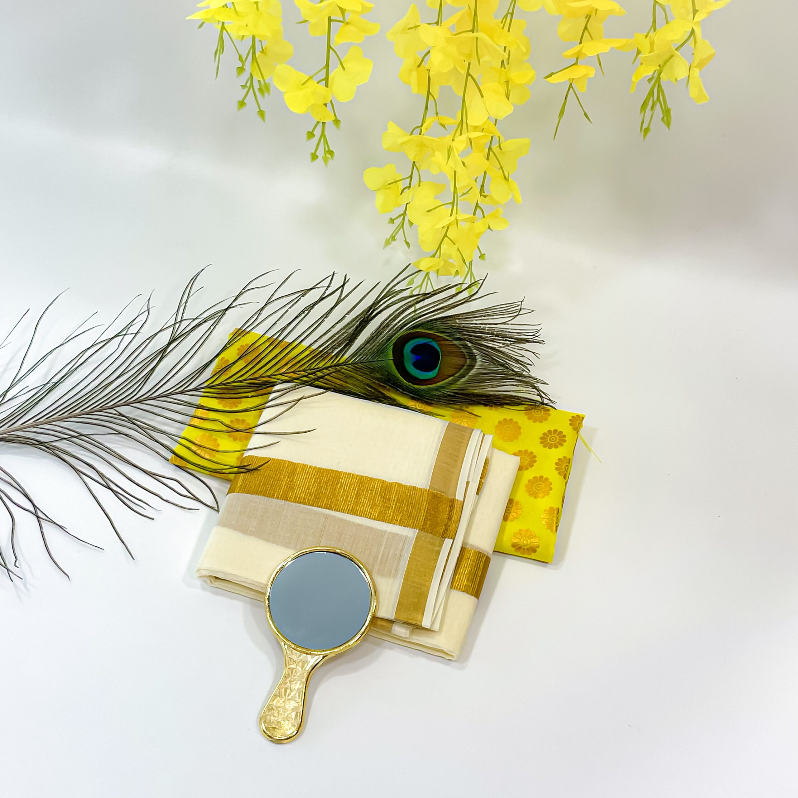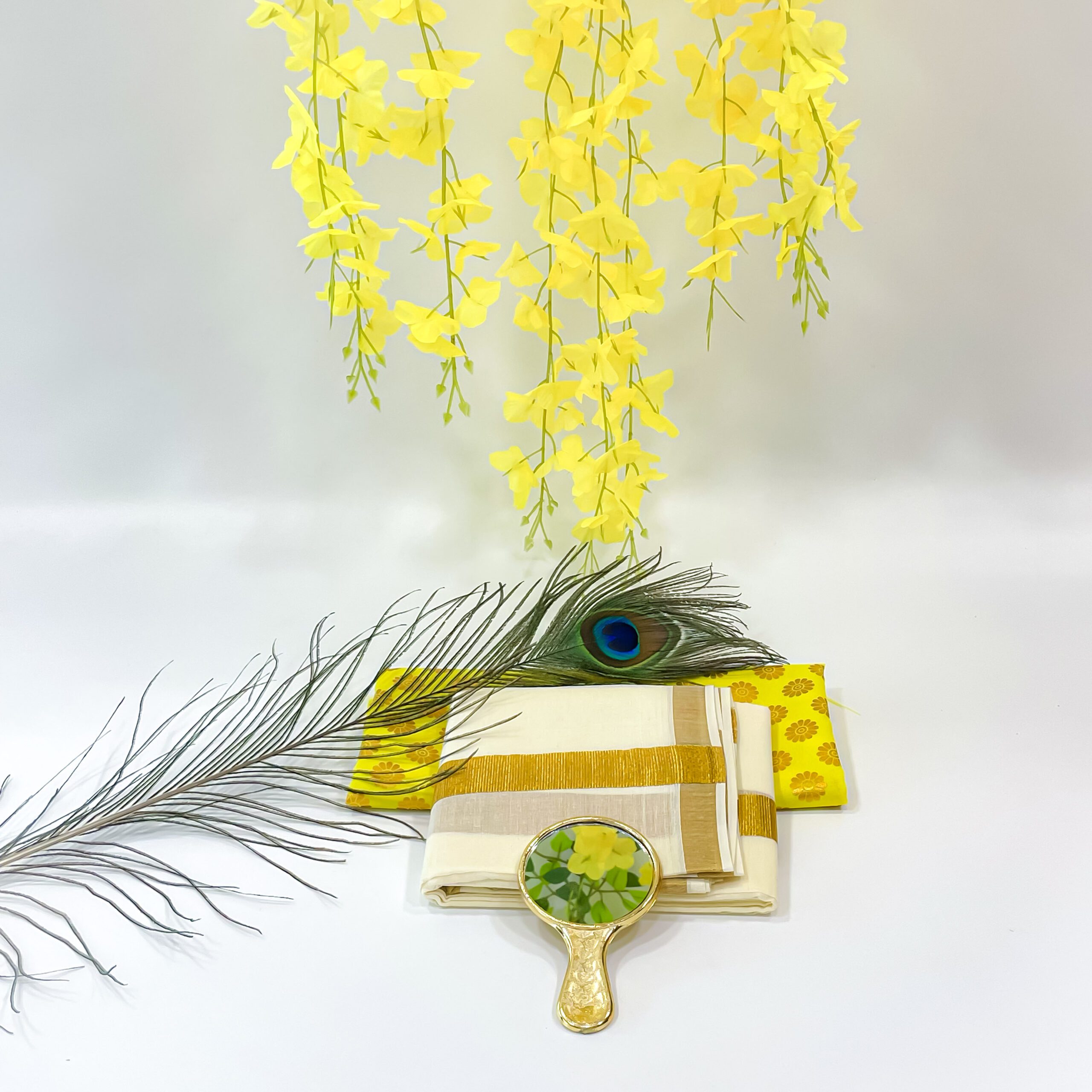 Original price was: ₹2,730.₹2,612Current price is: ₹2,612.Vishu Kani Combo: Peacock feather (H-6.5inc, L-12inc),Valkannadi small (H-2.5inc ,W-3inc) and more