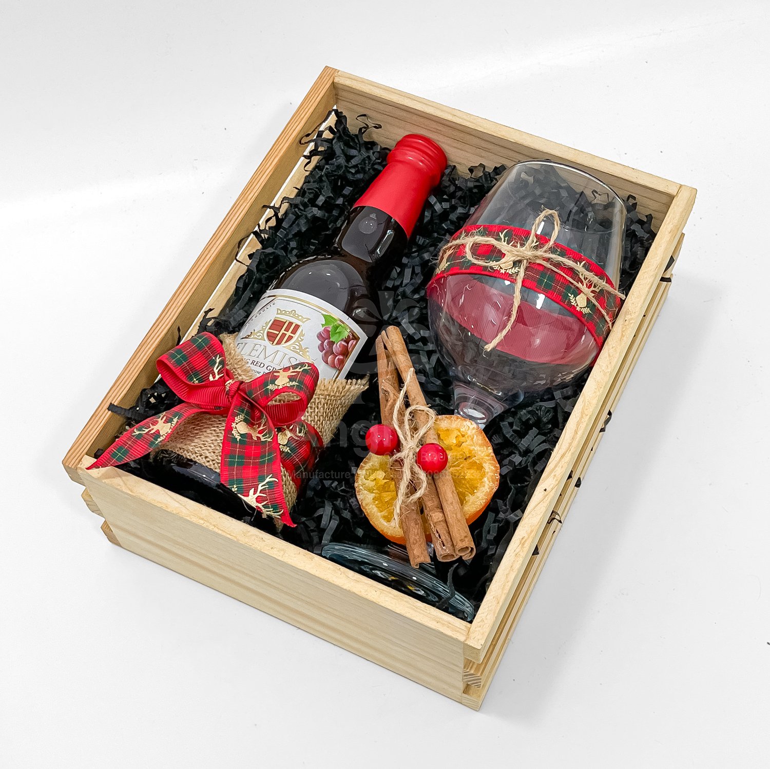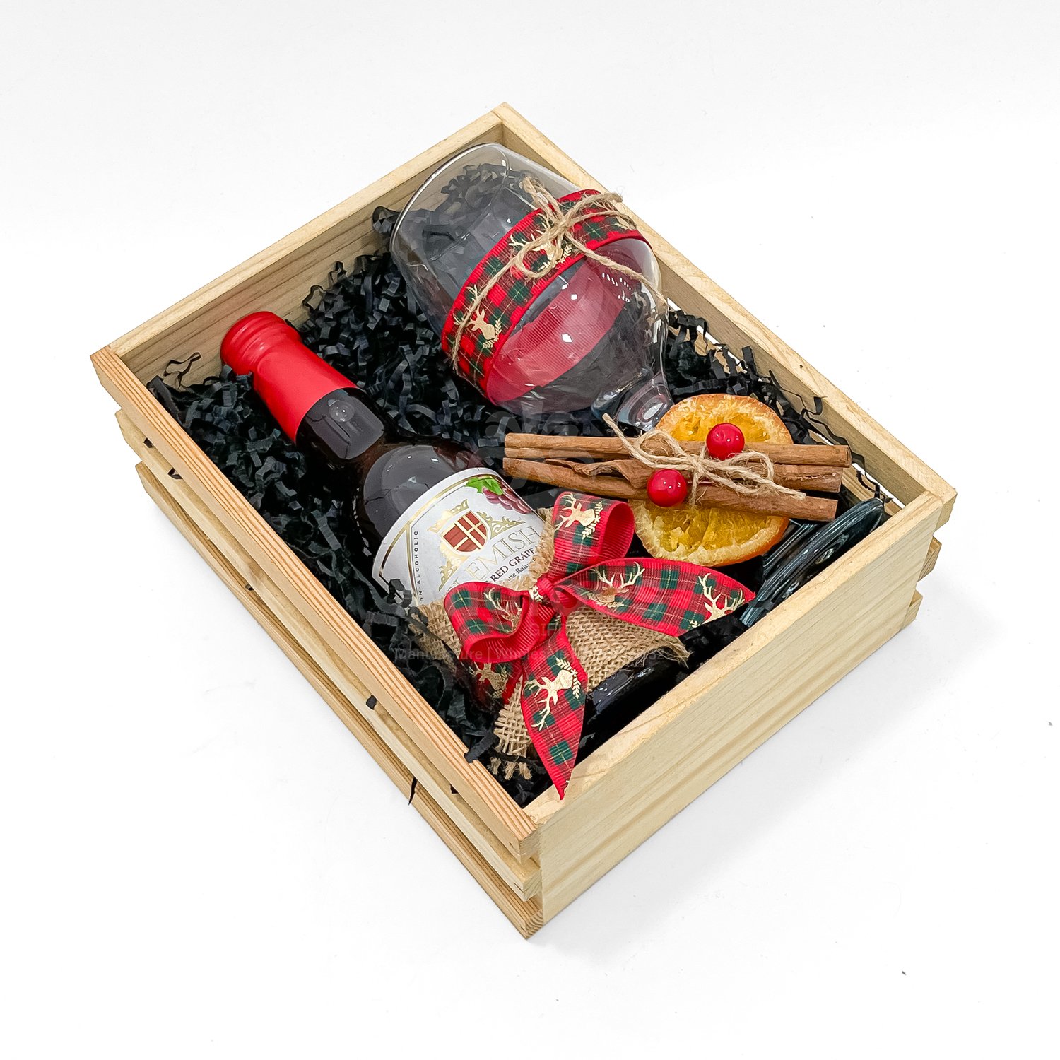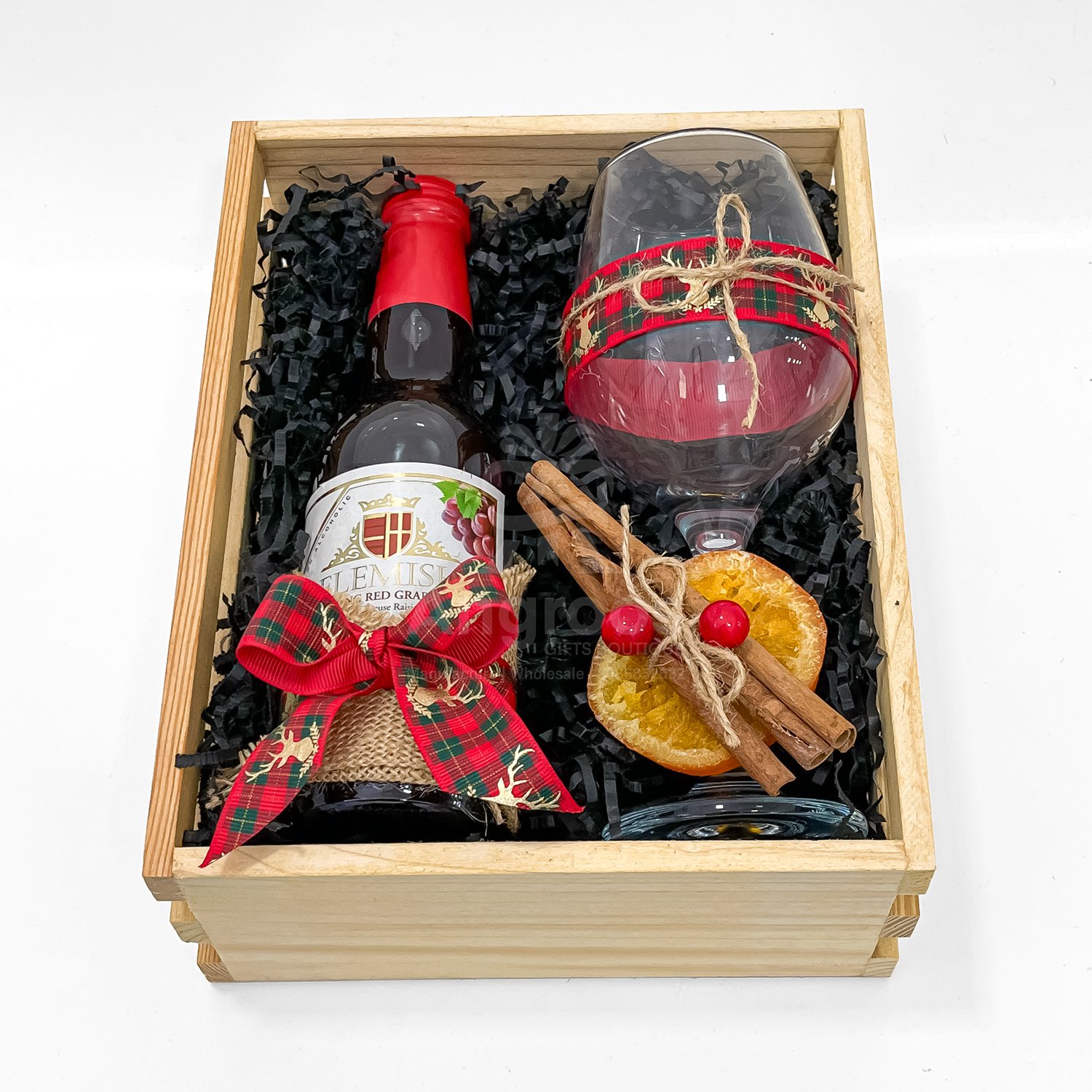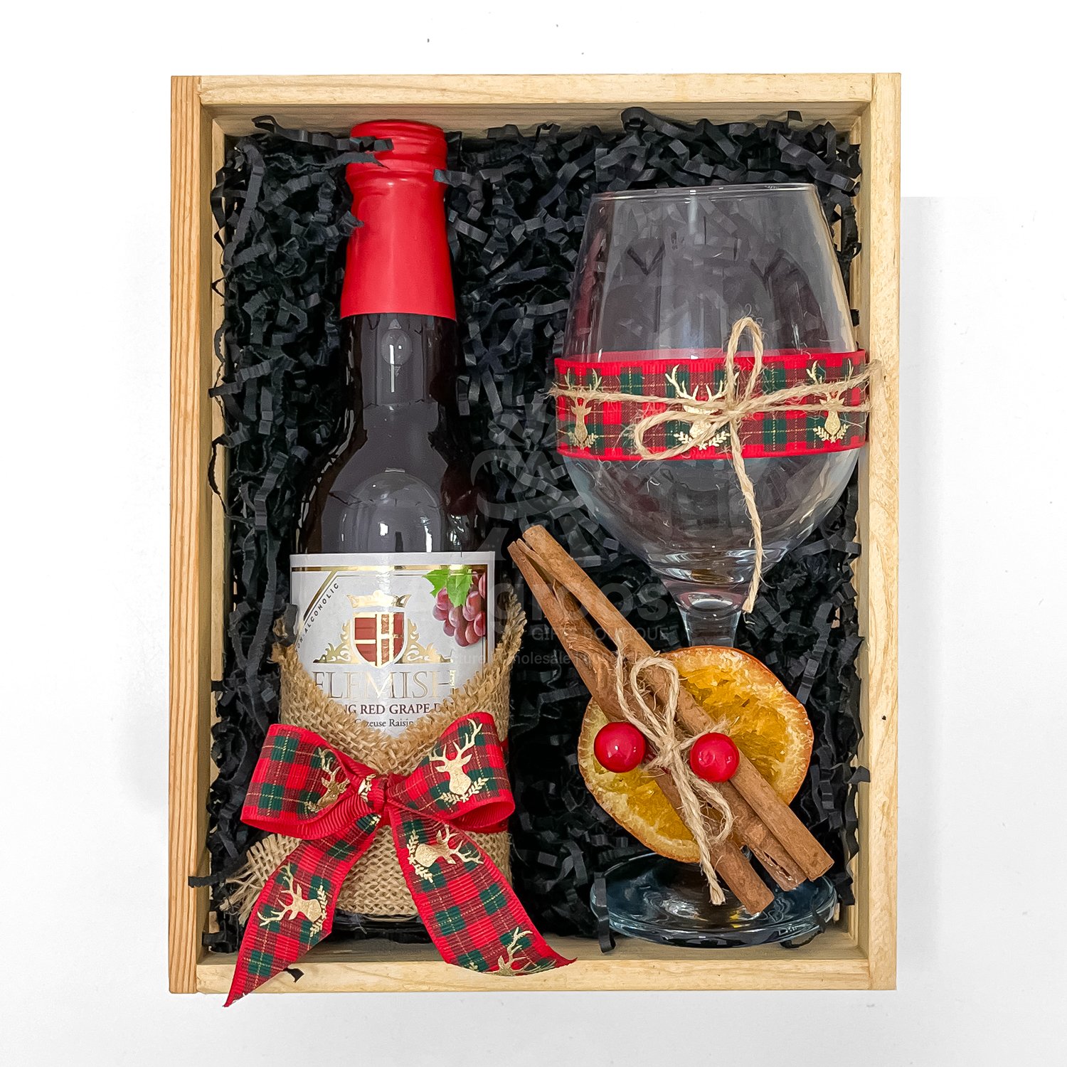 This festive wine glass gift set is beautifully curated with a premium Flemish red grape drink, a stylish wine glass, holiday-themed dried orange and cinnamon décor, and a rustic wooden tray, making it a perfect choice for Christmas, New Year, and celebration gifting.
