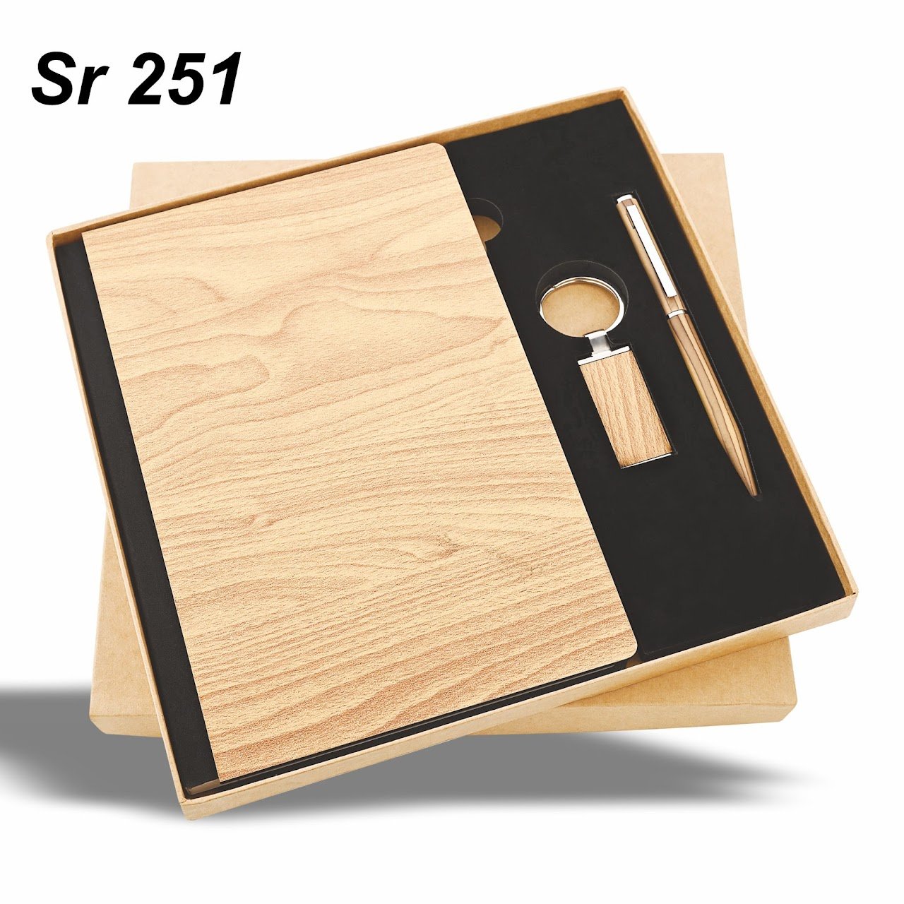 This elegant corporate gift set features a wooden finish notebook, sleek pen, and stylish keychain, all neatly arranged in a premium box. Designed for professionals, this set makes an ideal choice for corporate gifting, business events, and employee appreciation.