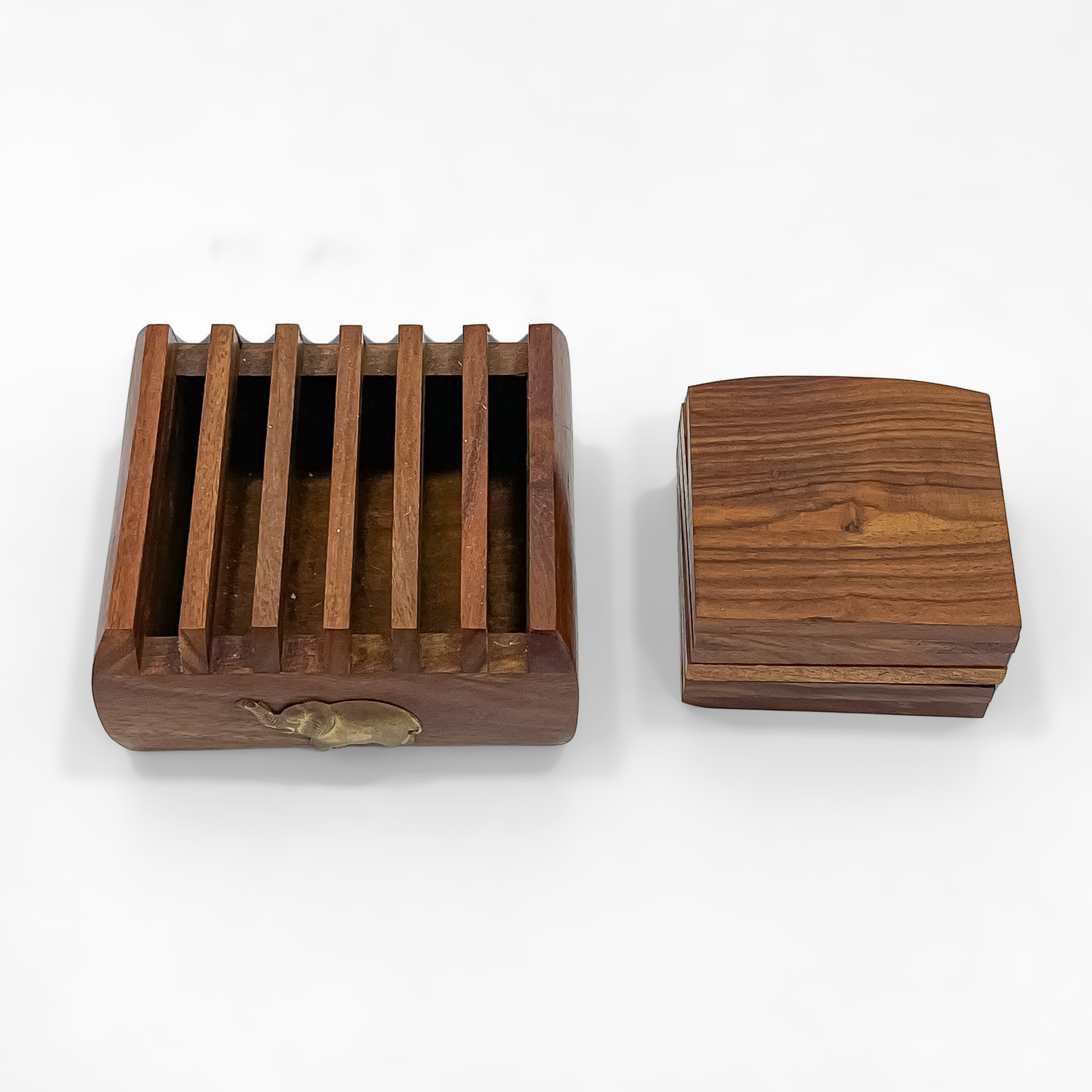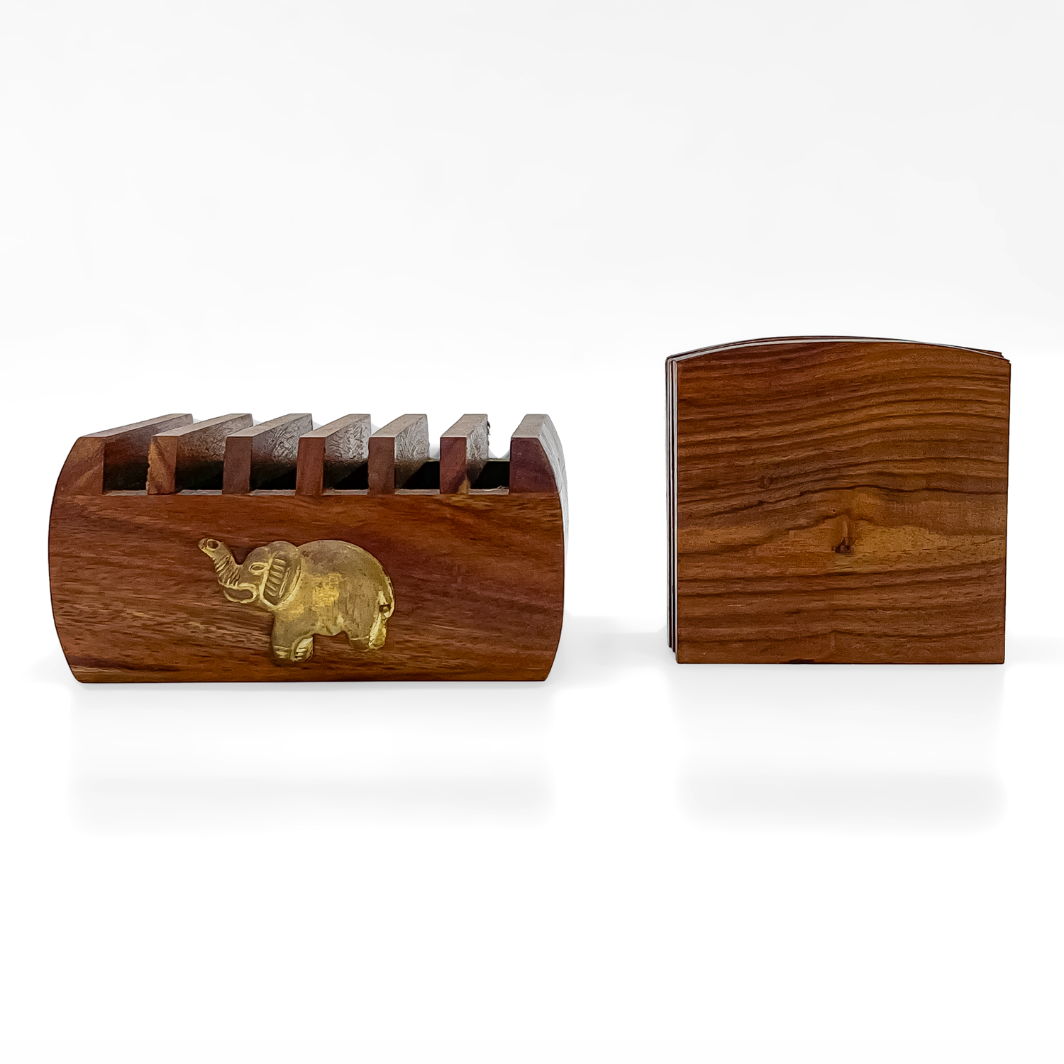 This premium handcrafted wooden coaster set features an intricate brass elephant inlay, adding a touch of Indian tradition to your table décor. Compact, elegant, and perfect for everyday use or gifting.